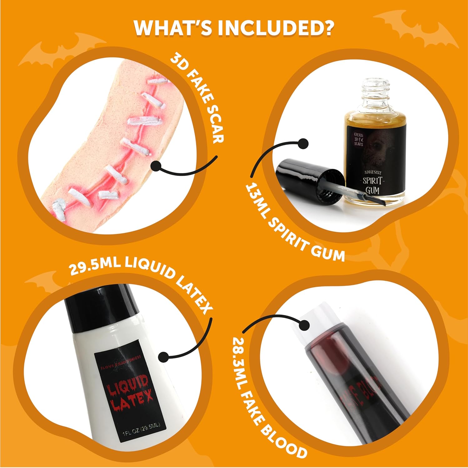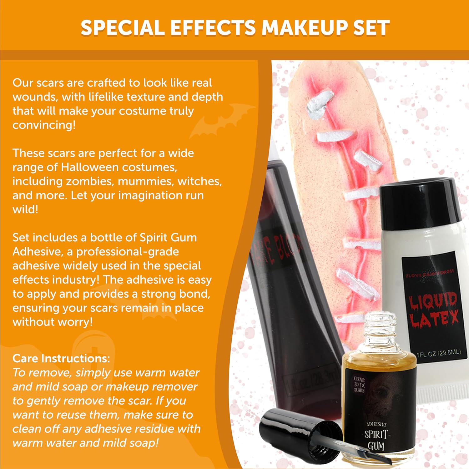 Set di cicatrici da graffetta: cerca la parte per il tuo prossimo evento in maschera coprendoti in tutti i tipi di cicatrici finte e trucco FX con il nostro set di cicatrici di graffetta! Il set include: questo set di cicatrici include una cicatrice 3D finta con dettagli in fiocco argento, una bottiglia da 13 ml di gomma adesiva trasparente Spirit con un piccolo pennello attaccato all'interno del coperchio, una bottiglia di lattice liquido e un tubo di sangue finto, perfetto per completare il tuo look! Facile da applicare: 1. Applicare la Spirit Gum sull'area desiderata | 2. Con un dito, toccare l'area fino a quando la gomma spirituale applicata non è appiccicosa | 3. Applicare la cicatrice/protesica sulla pelle e premere verso il basso per attaccare | 4. Lascia la cicatrice/protesica per alcuni secondi e poi aggiungi il tuo sangue finto e lattice! Cicatrice di grandi dimensioni: la cicatrice misura una lunghezza di 13 cm, una cicatrice protesica di grandi dimensioni che si distinguerà insieme al tuo outfit questo Halloween! Perfetto per speciali FX e Halloween: sia che tu stia creando le tue cicatrici finte da zero o vuoi completare il tuo outfit con una gamma di cicatrici protesiche e sangue finto, questo set di cicatrici è perfetto per il lavoro!