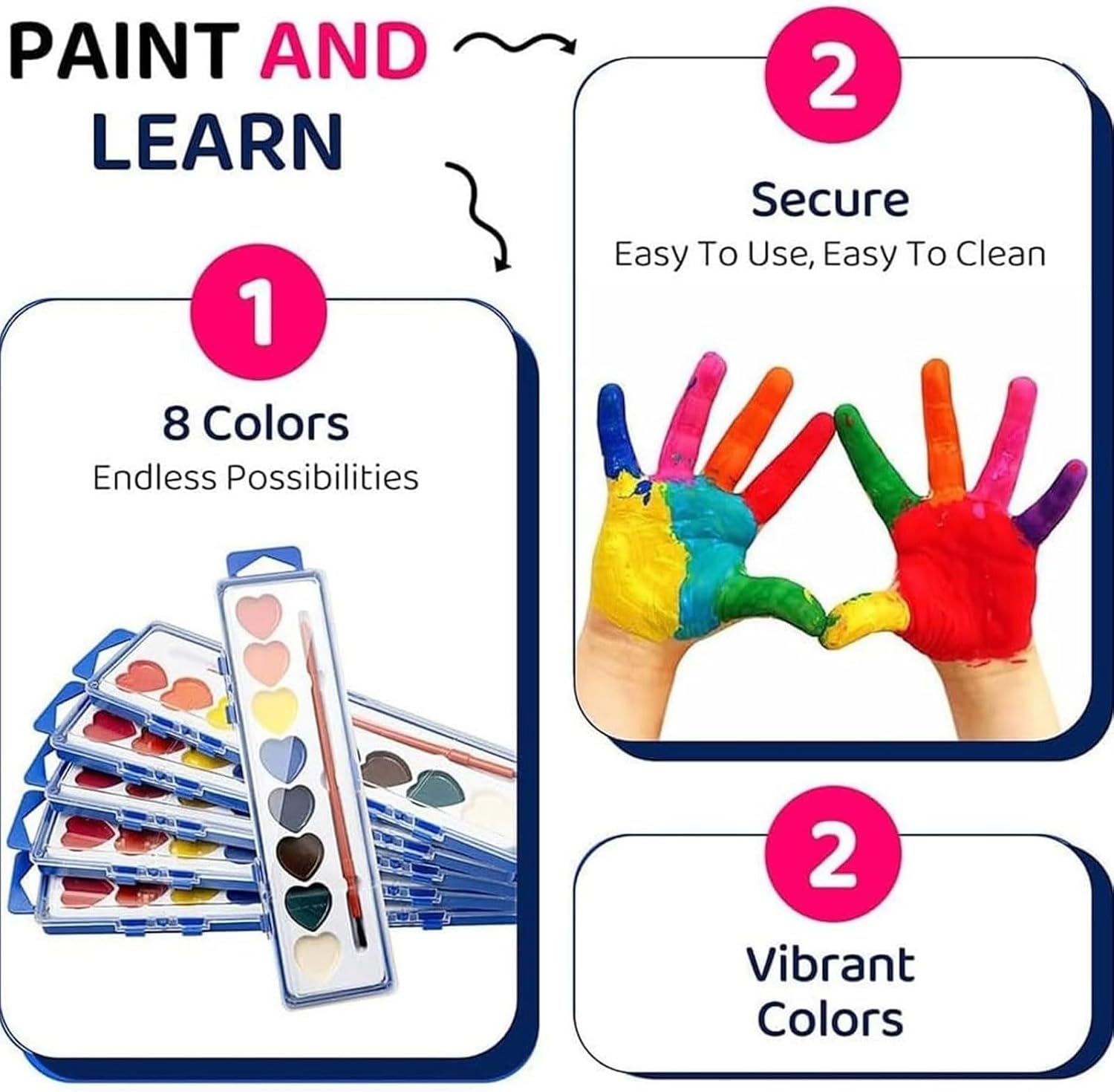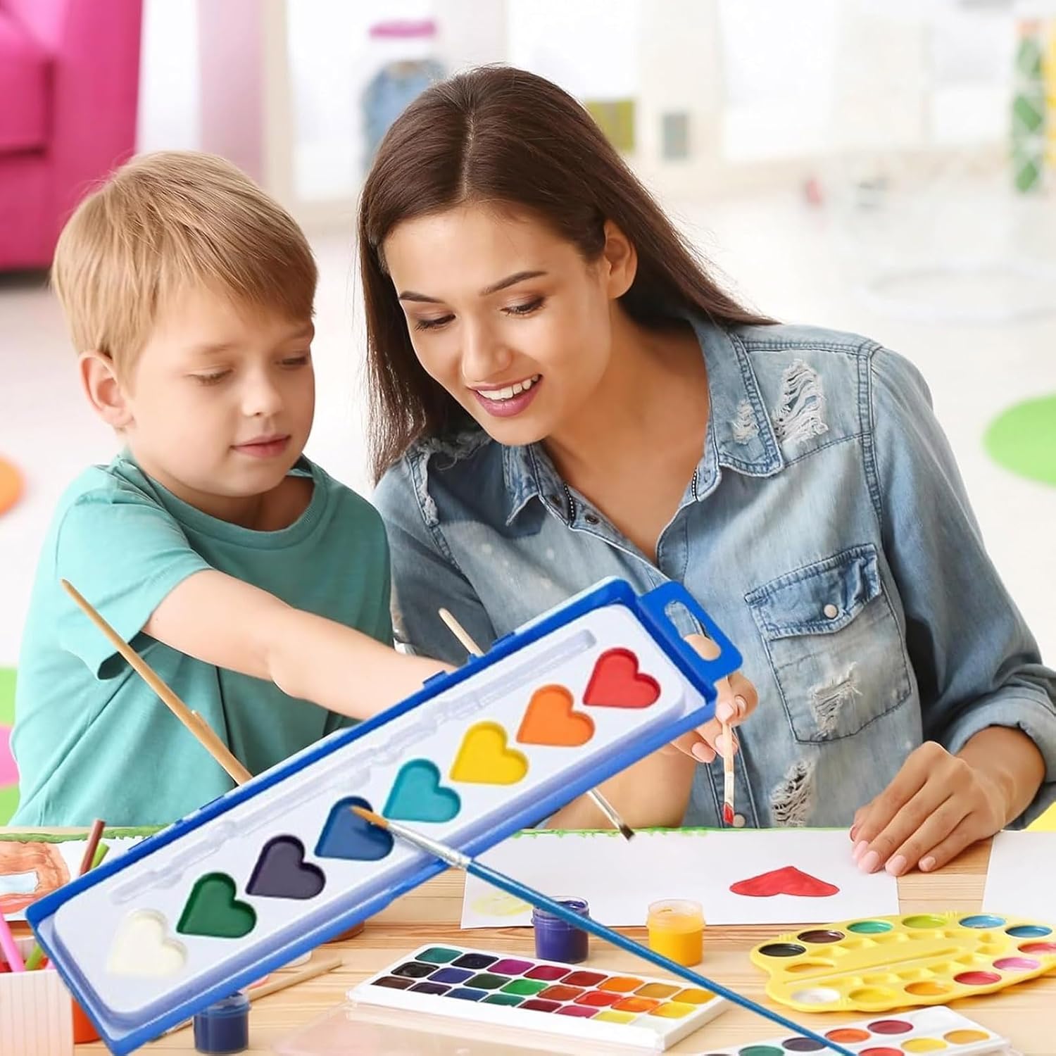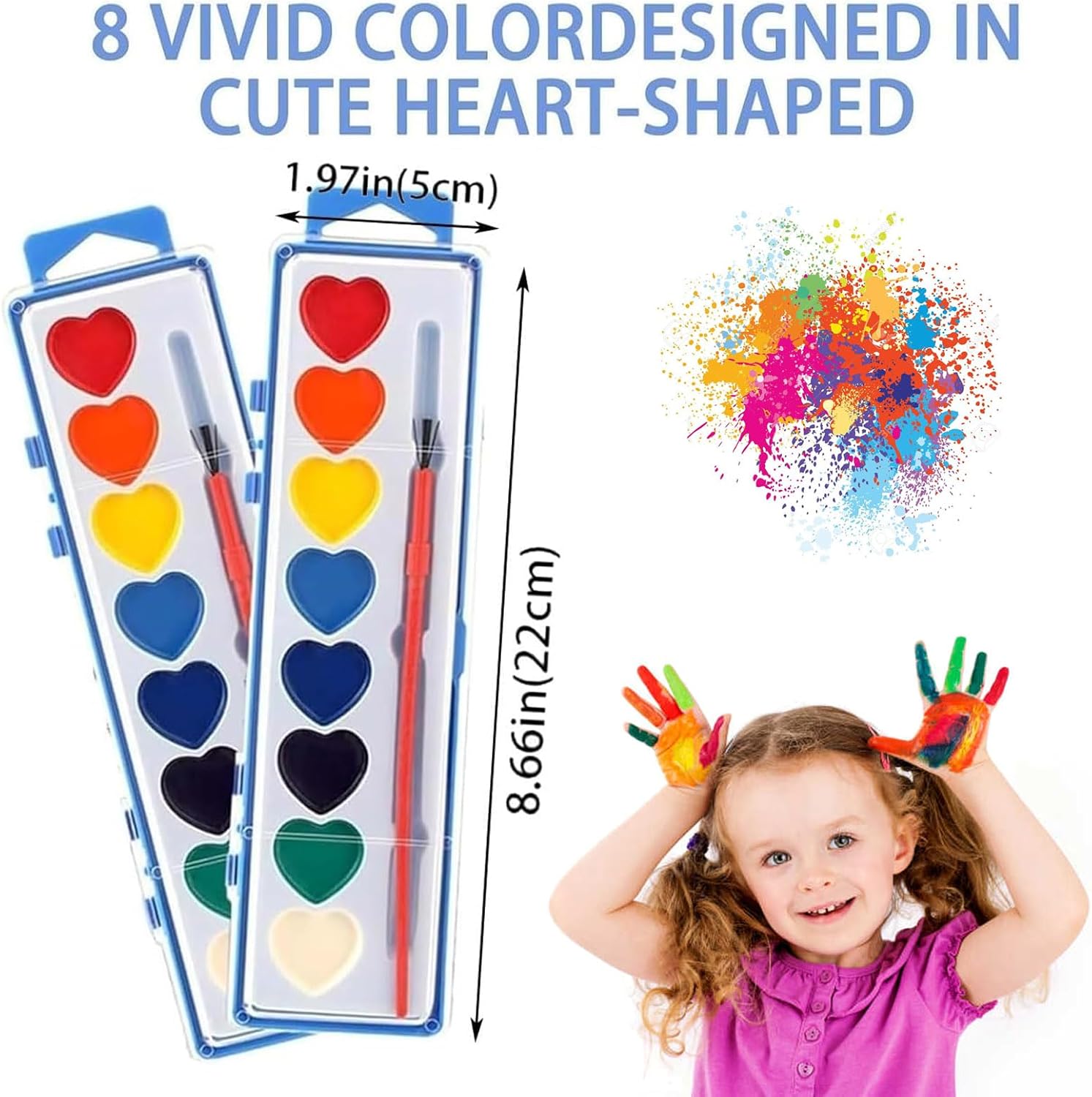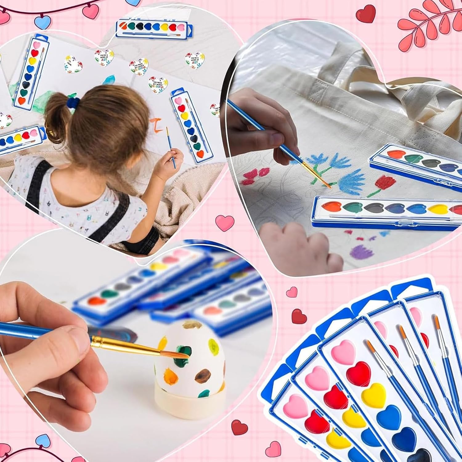 Sicuro e facile da pulire: realizzato con una formula atossica, questo set di acquerelli è completamente sicuro per bambini e adulti. I colori sono facili da lavare via dalla pelle, dai pavimenti o dai mobili, assicurando che sia i genitori che i bambini possano divertirsi a dipingere senza preoccuparsi di macchie o irritazioni. Adorabile design a forma di cuore: l'esclusivo design a forma di cuore di questo set di colori ad acquerello è perfetto per catturare i cuori sia dei bambini che degli adulti. È un regalo ideale per San Valentino, attività di classe, scambi di regali o feste a tema, aggiungendo un tocco di romanticismo e divertimento. Perfetto per tutte le età: questo set di acquerelli per San Valentino è progettato per tutti, dai bambini ai principianti adulti. Elimina la paura di dipingere, consentendo agli utenti di tutti i livelli di abilità di esplorare facilmente la propria creatività, rendendolo una scelta meravigliosa per attività familiari o di gruppo. Palette di colori vivaci e ricchi: con 8 colori vivaci e popolari in set da 12 o 24 scatole, questo kit di colori offre una vasta gamma di tonalità per dare vita alle tue idee creative. Inoltre, include un pennello per iniziare subito, offrendo un ottimo rapporto qualità-prezzo e infinite possibilità artistiche. Ideale per scuole e amanti dell'arte: uno strumento fantastico per scuole, asili e programmi artistici, questo set di colori incoraggia i bambini a esprimere il loro lato artistico. Il coperchio funge anche da comoda tavolozza per mescolare i colori, rendendolo un'aggiunta pratica e divertente a qualsiasi sessione di pittura.