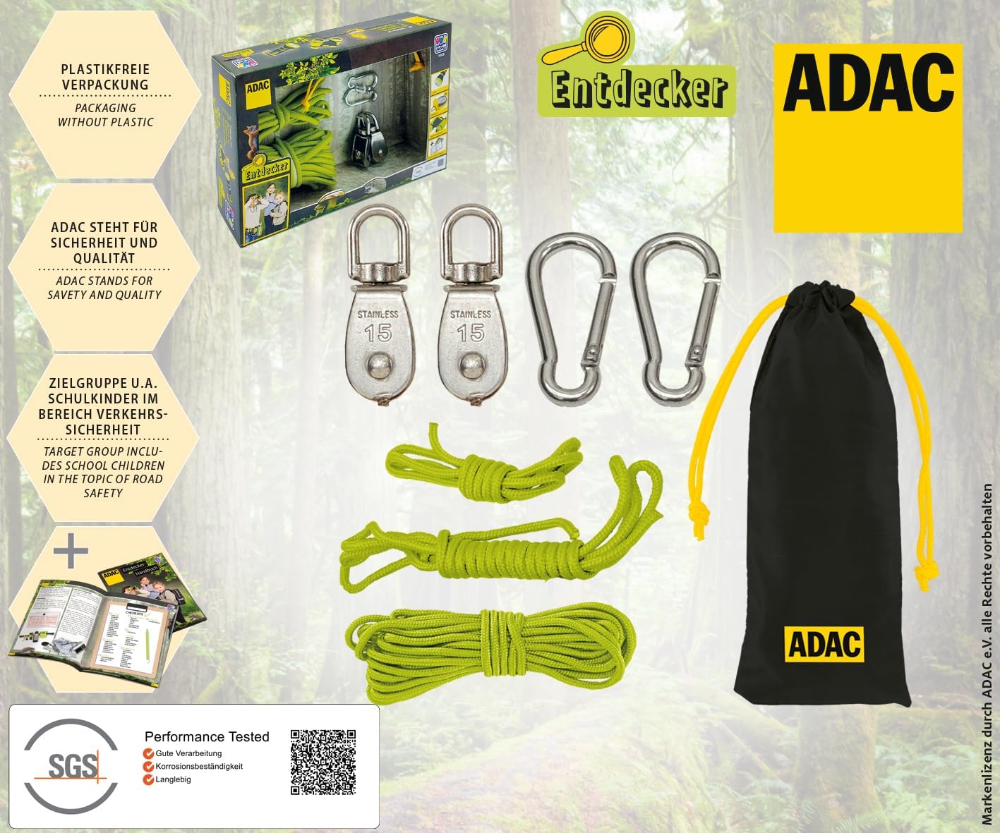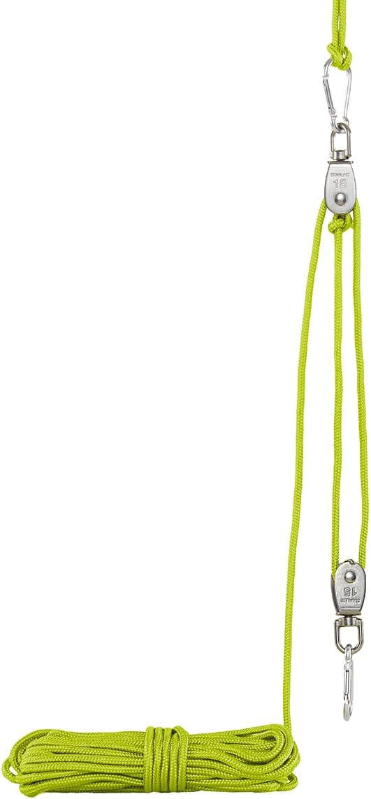 Set di 8 pezzi Dimensioni: circa 24 x 11 cm Contenuto: 2 moschettoni da 50 x 23 x 4 mm, 3 corde di diverse lunghezze da 8 m, 2 m, 1 m, 2 rotelle in acciaio inossidabile, 1 pratica borsa in nylon per riporre Colore: grigio/verde/giallo 4 anni e oltre Testato SGS