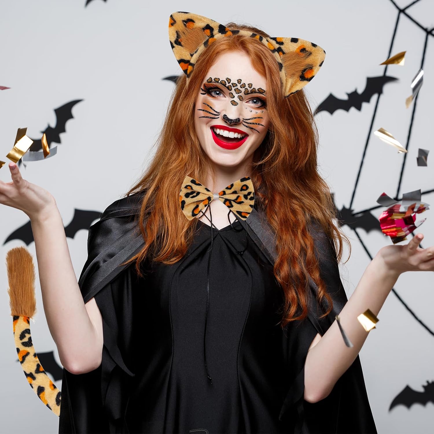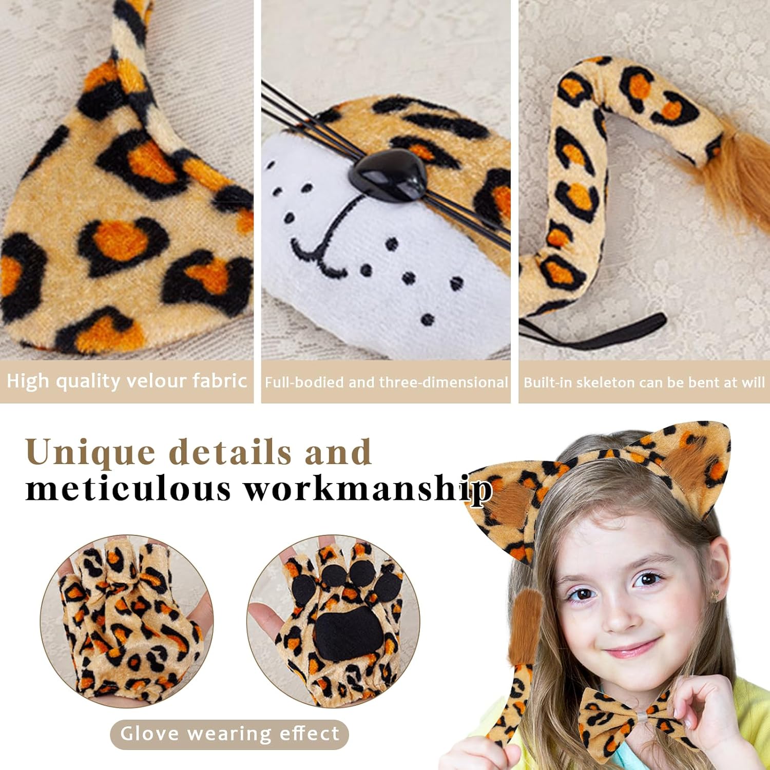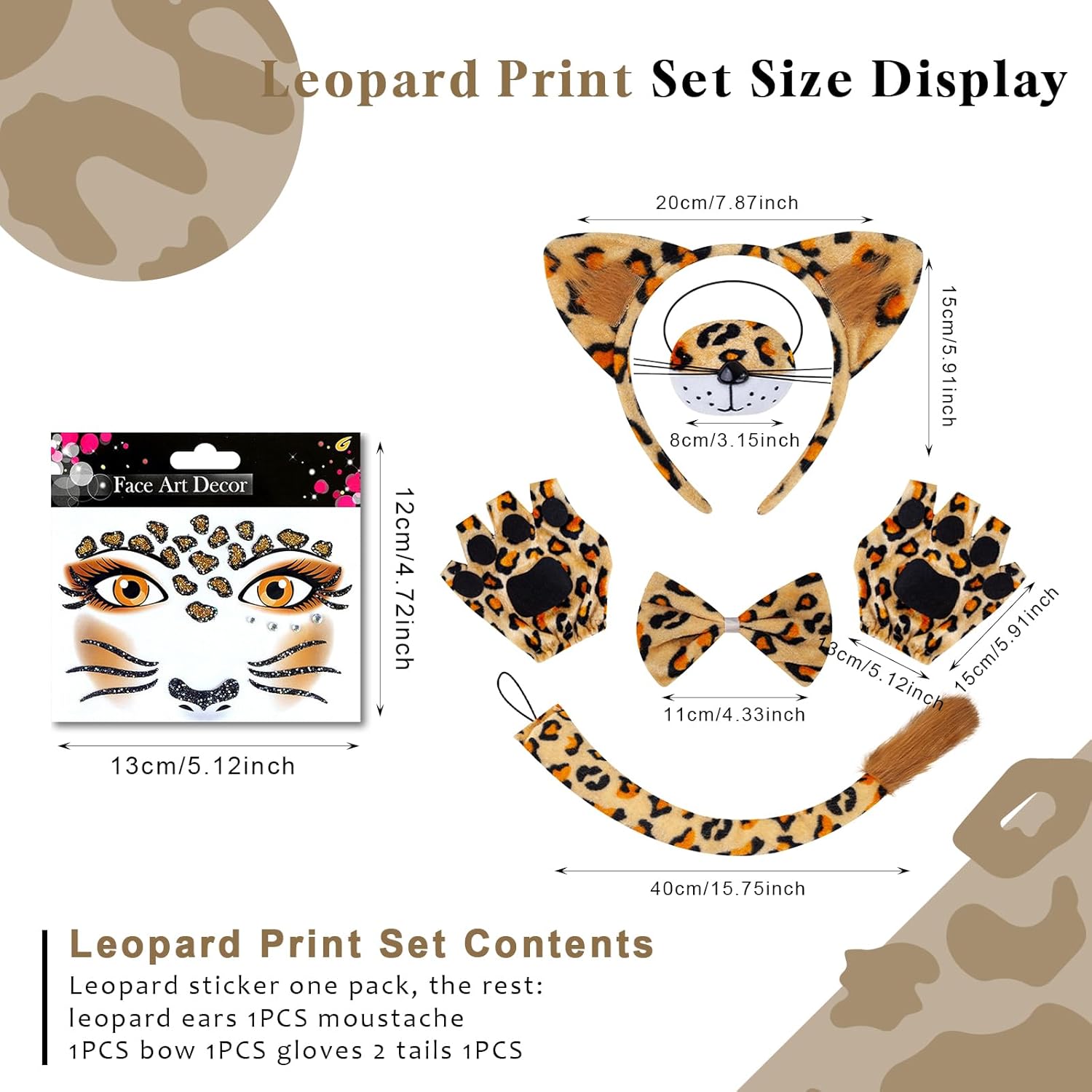 SET COSTUME LEOPARDO: Include 1 Cerchietto con orecchie di leopardo, 1 elegante coda da leopardo con anima in filo metallico modellabile, 1 papillon da leopardo, 1 naso da leopardo con cordino elastico, 1 adesivo per il viso glitterato, 1 paio di guanti da leopardo per un costume da leopardo completo. MATERIALE DI QUALITÀ E COMFORT: Tessuto di alta qualità, delicato sulla pelle, resistente e riutilizzabile. DESIGN LEOPARD PATTERN: Il realistico motivo leopardato e gli abbellimenti scintillanti ti fanno sembrare selvaggio e affascinante, quindi tutti gli occhi sono garantiti sul tuo costume da leopardo. DESIGN CREATIVO DEL VISO: Glitterati dettagliati adesivi per il viso rendono il tuo cosplay da leopardo ancora più perfetto e la tua combinazione di costumi ancora più armoniosa. ACCESSO MULTIFUNZIONALE PER PARTY: Perfetto per Halloween, carnevale, feste a tema o eventi a tema animale.