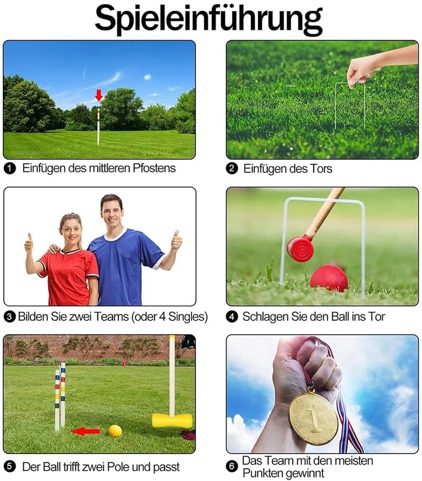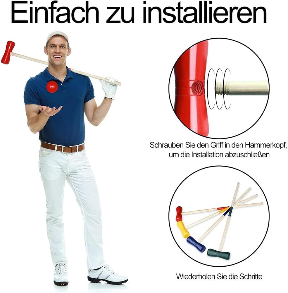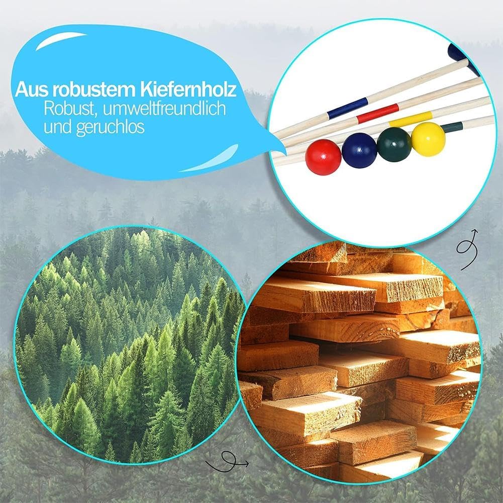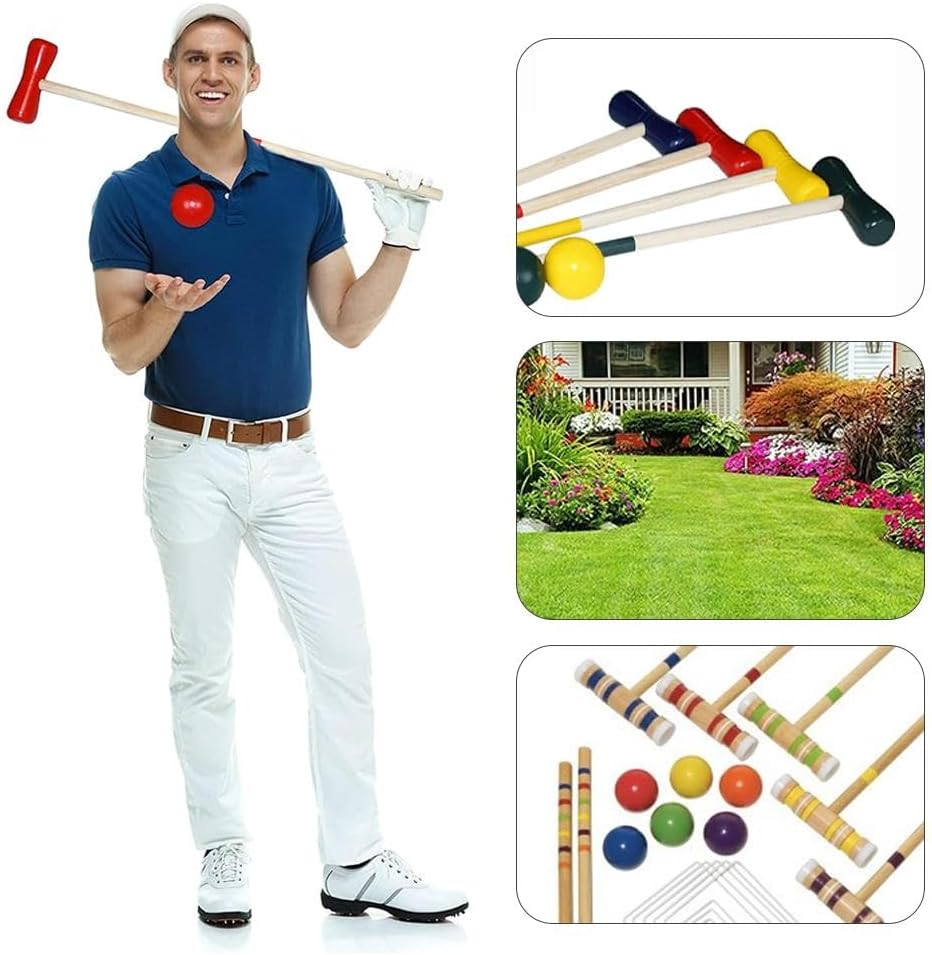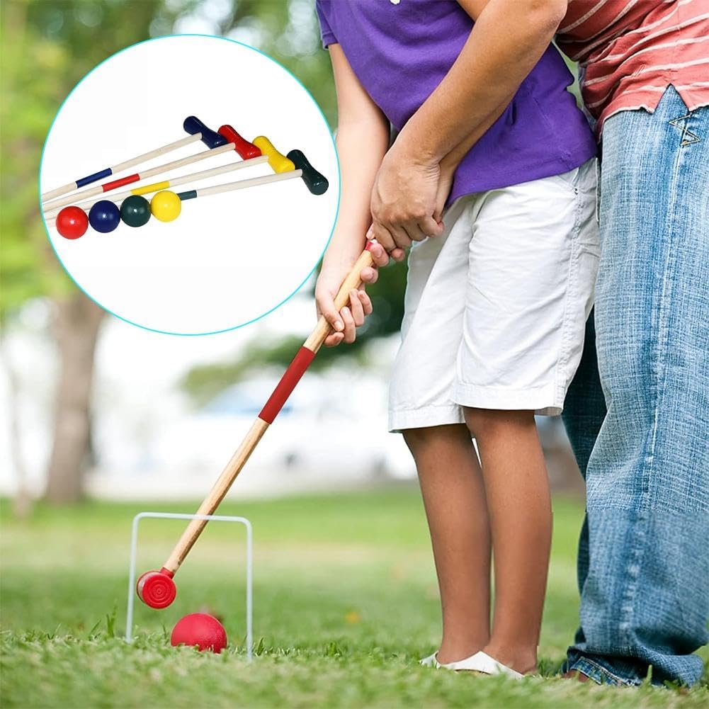Classico set per croquet in legno: "Perfetto per 4-6 giocatori, divertimento per bambini e adulti!" – Questo tradizionale gioco di croquet da giardino riunisce generazioni per una competizione amichevole nel cortile, al parco o durante le riunioni di famiglia. Accessori completi in legno di alta qualità: include tutto il necessario per un gioco professionale o informale. Con mazze in legno liscio, palline dai colori vivaci, wicket in metallo resistente e picchetti robusti, tutti realizzati per prestazioni durature e un gameplay classico. Struttura in legno liscia e sicura: la finitura lucida senza sbavature garantisce una comoda maneggevolezza. Realizzato con legno di alta qualità e tecniche tradizionali, ogni pezzo è finemente levigato per un'esperienza sicura e piacevole sia per bambini che per adulti. Sviluppa abilità e pensiero strategico: "Migliora la coordinazione occhio-mano incoraggiando allo stesso tempo una strategia amichevole" - Facile da imparare ma coinvolgente, questo gioco promuove la concentrazione, il lavoro di squadra e il gioco tattico, ideale per serate di gioco, picnic o feste all'aperto. Portatile e perfetto per il divertimento all'aperto: "Porta il divertimento in giardino, al parco o in spiaggia" - Progettato per un facile trasporto e una conservazione compatta, questo set è il tuo punto di riferimento per le giornate di sole fuori, creando momenti rilassanti e divertenti all'aria aperta.