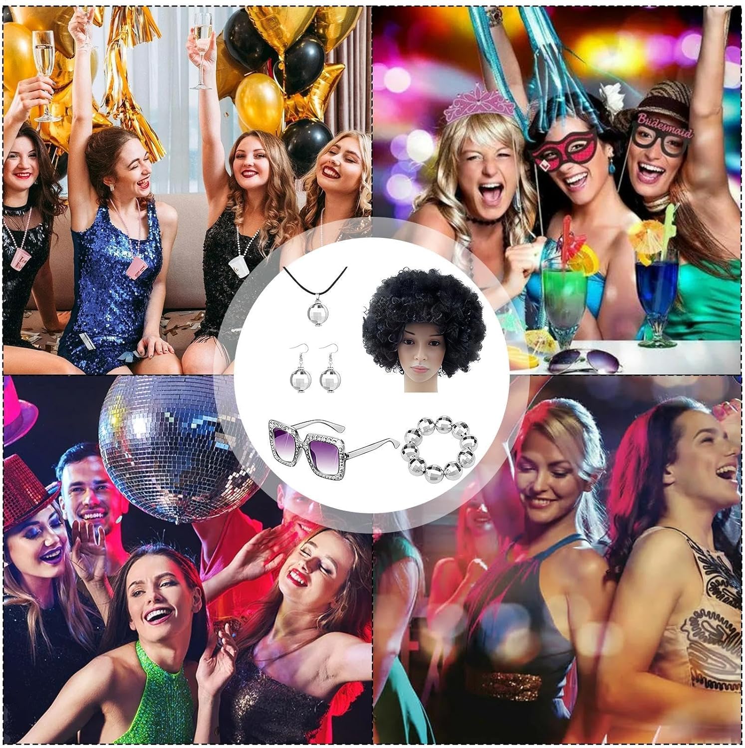 Descrizione prodotto per costumi da discoteca, da discoteca da donna anni '70 | Set di costumi da discoteca anni '70 con per palline da discoteca da 5 pezzi | per palla da discoteca, occhiali da sole, bracciale, parrucca afro, orecchini, collana Questo set include una splendida collana con palla da discoteca e 1 paio di orecchini che brilleranno sicuramente sotto qualsiasi palla da discoteca. Perfetti per qualsiasi festa in discoteca, i nostri gioielli sono caratterizzati da una forte lucentezza e una luce brillante che attira l'attenzione di tutti. Inoltre, è un regalo squisito per l'amante degli anni '70 nella tua vita. Specifica: Nome: set di da discoteca stile anni '70 per donna Materiale: fibra sintetica + PP Dimensioni del prodotto: come mostrato nell'immagine Peso: circa 230 g Lista imballaggio: 1 x capelli ricci corti stile anni '70 1 paio di orecchini con sfera da discoteca Collana con palla da discoteca x1 Bracciale con palla da discoteca x1 Occhiali da sole con montatura x1 Nota: 1. A causa dei diversi effetti di visualizzazione e di luce, il colore effettivo del prodotto potrebbe essere leggermente diverso dal colore mostrato nell'immagine. Grazie! 2. A causa della misurazione manuale, si prega di consentire una deviazione della misurazione di 1-3 cm. Avviso di sicurezza Non applicabile