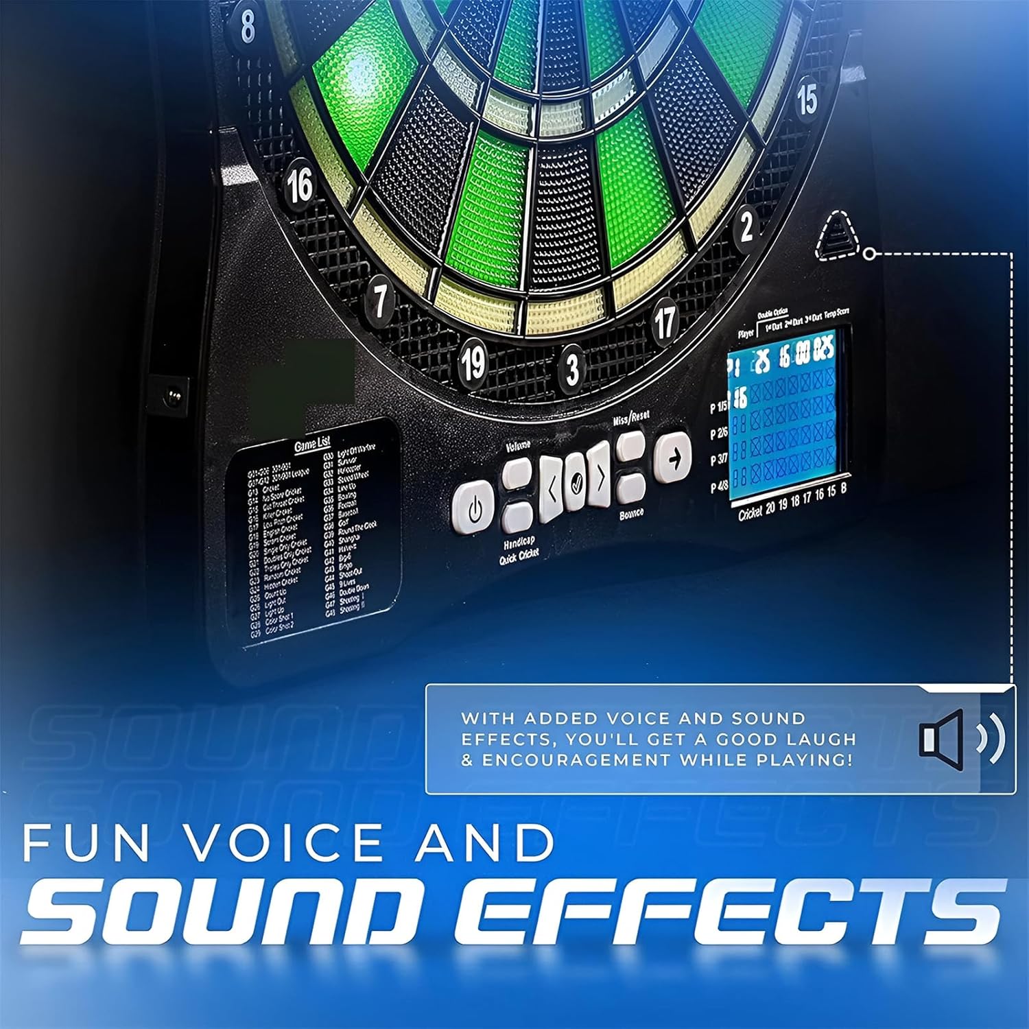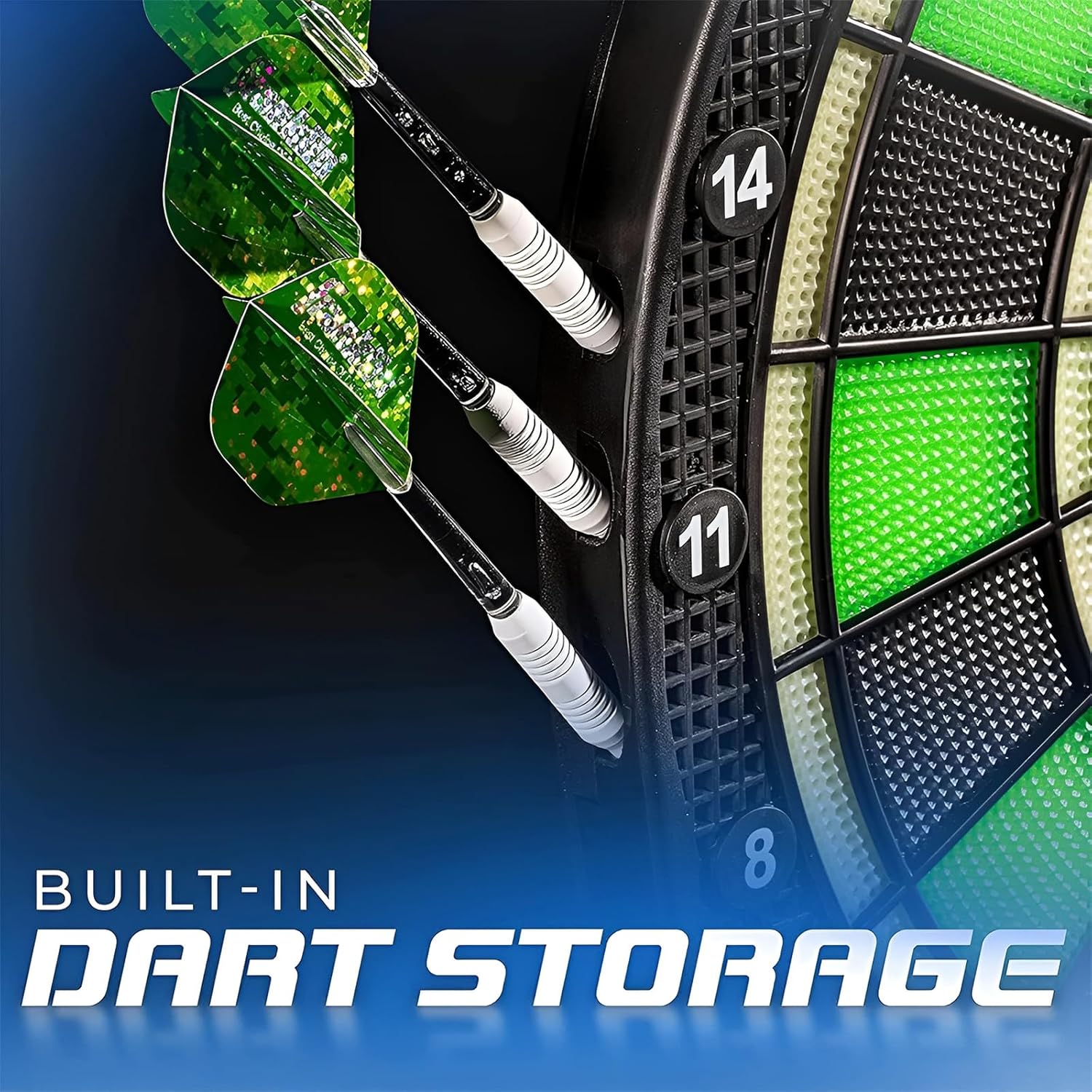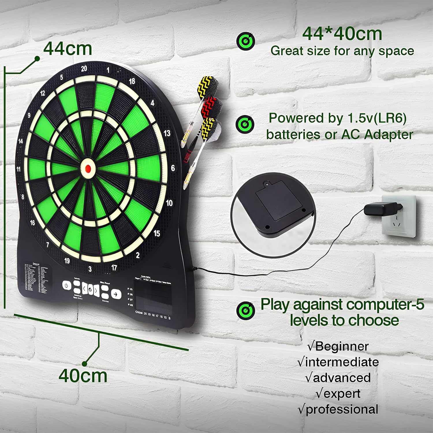 Board di dardo elettronico illuminato: maggiore visibilità con segmenti illuminati, perfetta per incontri sociali con amici e familiari. Include 6 freccette e 50 pin di sicurezza per il gioco immediato. Sistema di punteggio elettronico LCD: punteggio facile e accurato con display LCD. Interfaccia intuitiva per il monitoraggio dei punti senza sforzo, migliorando l'esperienza di gioco. 48 giochi con 315 variazioni: ampia gamma di 48 giochi e 315 variazioni. Dal classico a giochi target classici a basati sulla luce e in movimento, intrattenimento infinito per tutte le preferenze. Progettazione di superficie a nido d'ape duratura: materiali di alta qualità per durata, presa da dardo stabile e perdita minima di dardo. Costruito per resistere a un uso pesante e tiri difficili per un divertimento di lunga durata. Versatile per tutte le età e livelli di abilità: adatto a un massimo di 8 giocatori, ideale per l'uso domestico. Catering a giocatori di tutte le età e abilità, perfetti per gli appassionati di sport e una competizione amichevole.