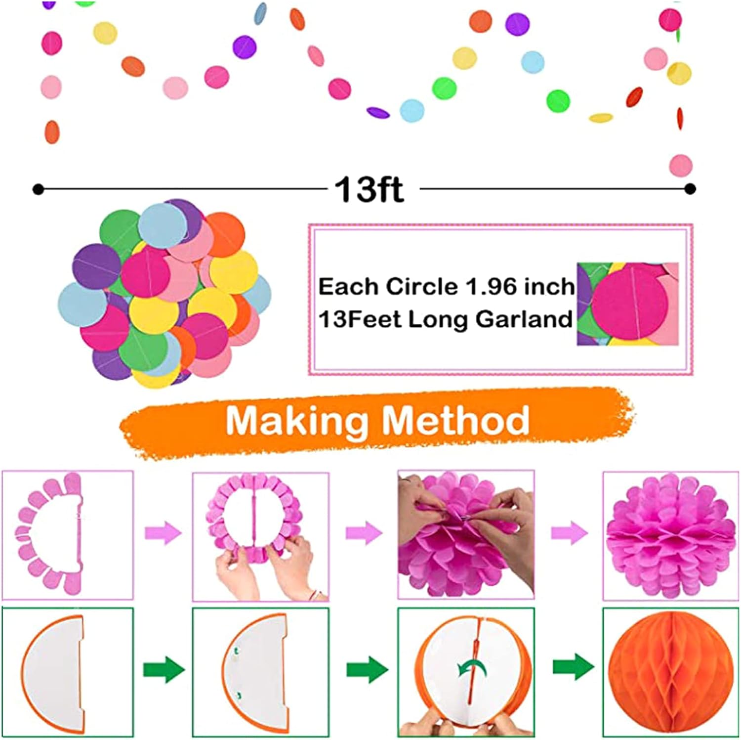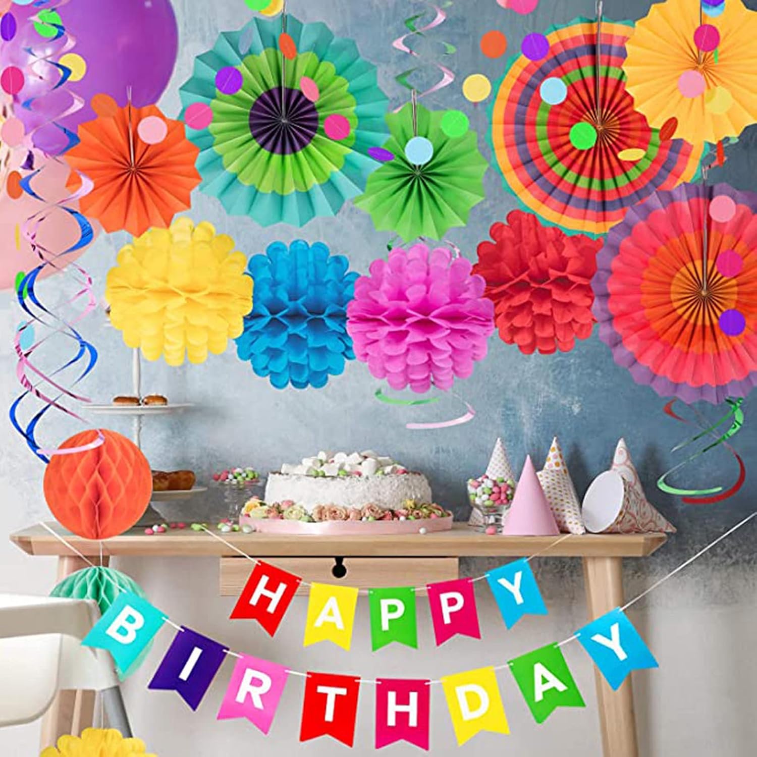 Decorazioni colorate per feste per famiglie adolescenti le palline di fiori sono molto belle Il compleanno per ha 5 metri di corda e ago, che è facile da realizzare Sono adatti per feste a tema come compleanno, baby shower, feste in piscina, feste, matrimoni di Capodanno Include: 6 ventagli di carta, 6 ventagli di carta, 3 striscioni, 14 vortici da appendere, 5 pompon di carta, 2 palline a nido d'ape. Colore: multicolore