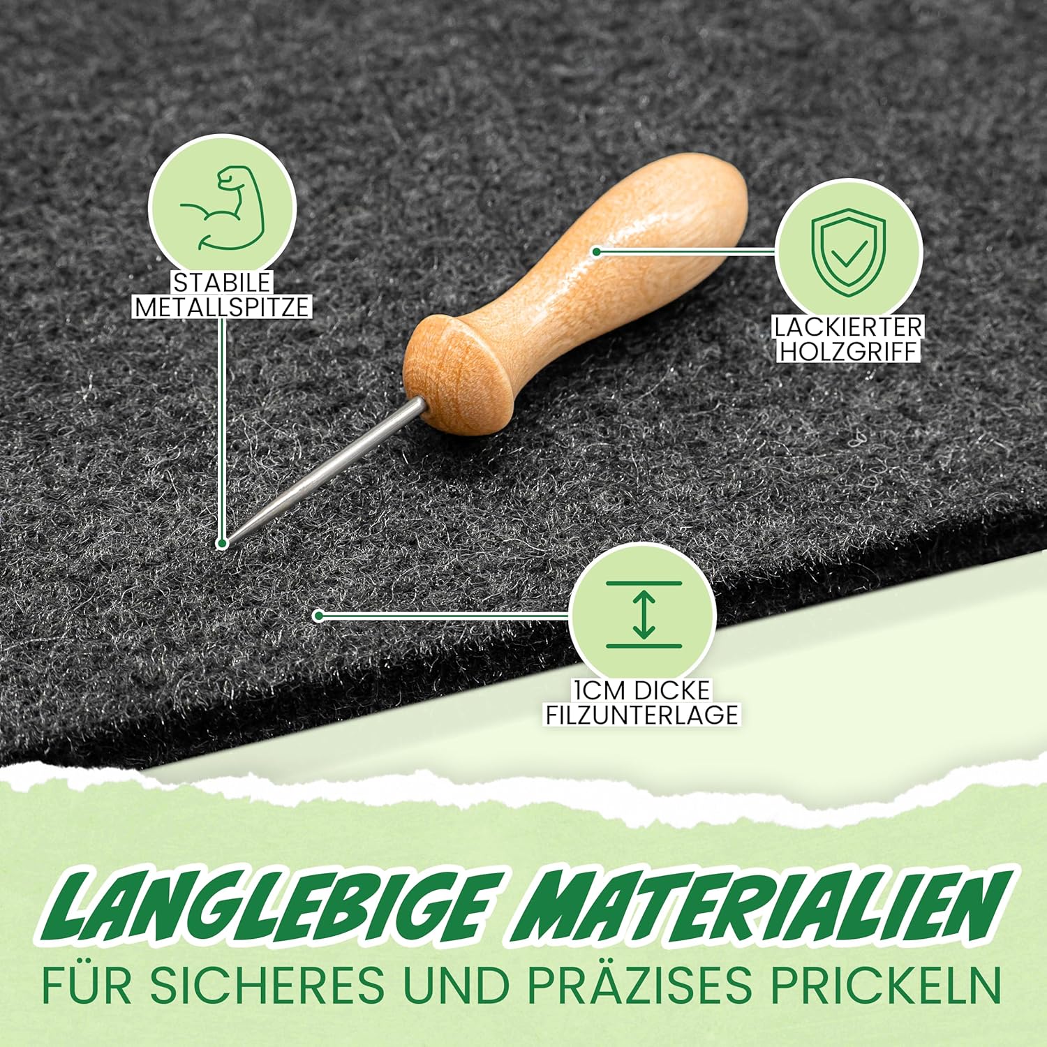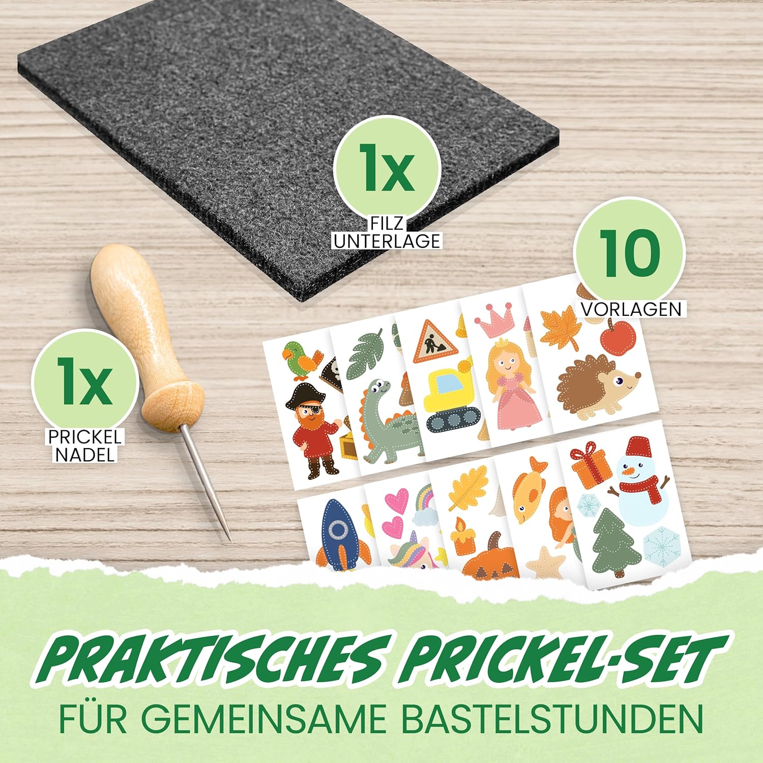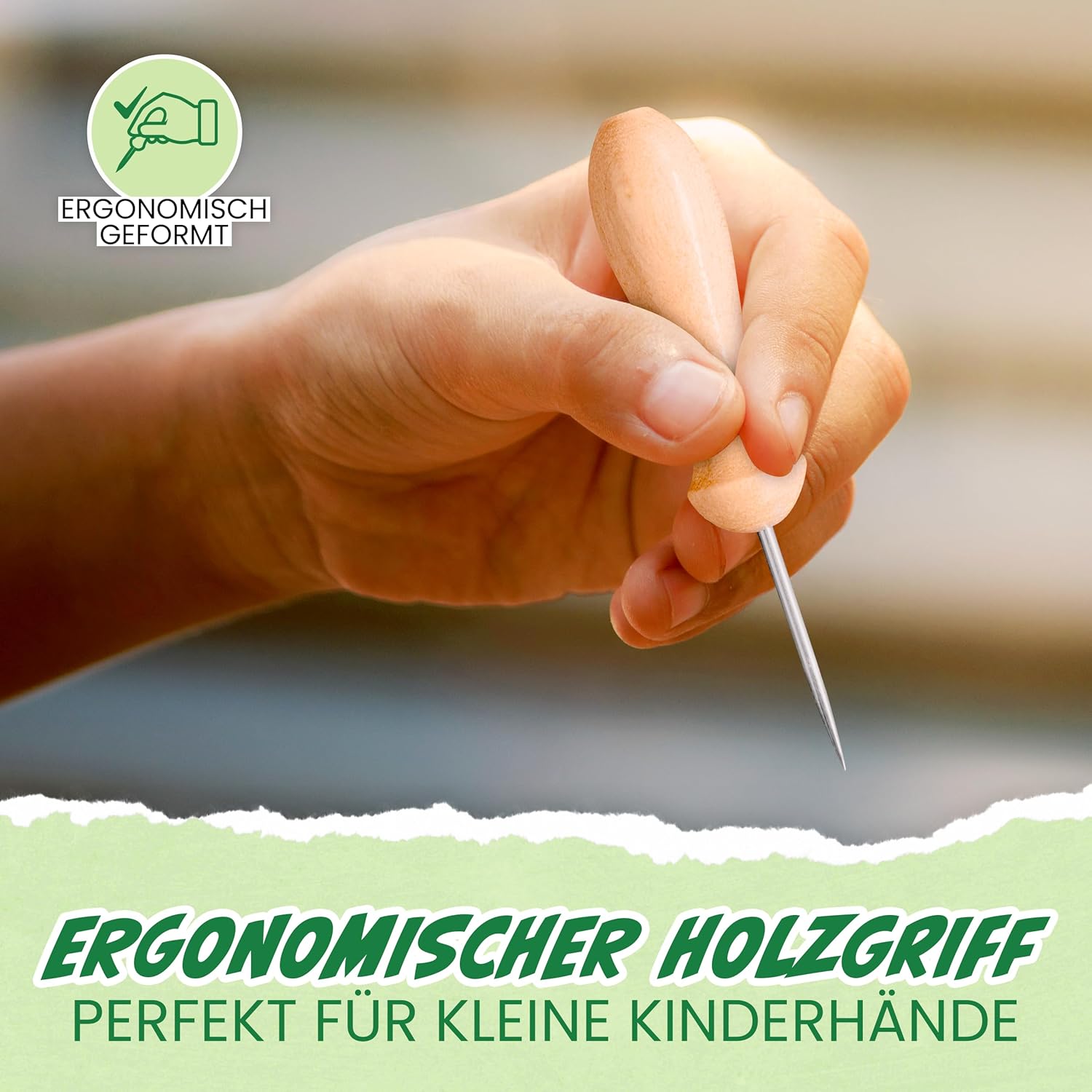 Sicuro e adatto ai bambini: il set di ferri da formaggio per bambini con manico ergonomico in legno si adatta perfettamente alle piccole mani. La robusta punta in metallo garantisce un formicolio preciso, ideale come set per bambini a partire dai 3 anni sotto supervisione. Materiali di alta qualità: il nostro set di formicoli per bambini contiene due ferri da formatura durevoli con manico in legno sostenibile con vernice resistente alla saliva priva di bordi o schegge e due supporti in feltro extra spesso. Utilizzo versatile: creatività senza limiti. Perfetto per le ore di bricolage a casa, all'asilo o a scuola. Che si tratti di immagini per finestre, lanterne o giochi educativi Montessori, con questo set di formicoli i bambini non conoscono limiti alla fantasia. Promuove la motorizzazione fine e la concentrazione: allena la coordinazione occhio-mano e la destrezza, rafforza la muscolatura per una scrittura successiva. Fantastica idea regalo per gli appassionati di fai da te: sia per compleanno, Natale o come sorpresa creativa di tanto in tanto – questo set creativo garantisce occhi luminosi dei bambini e ore di divertimento artigianale.