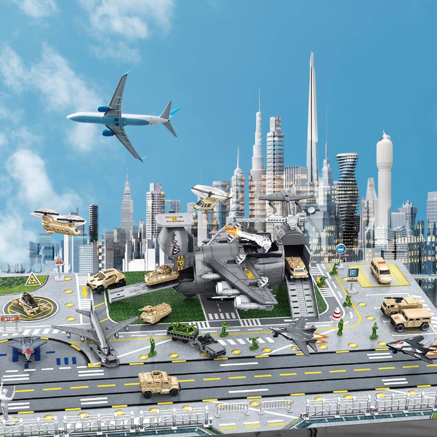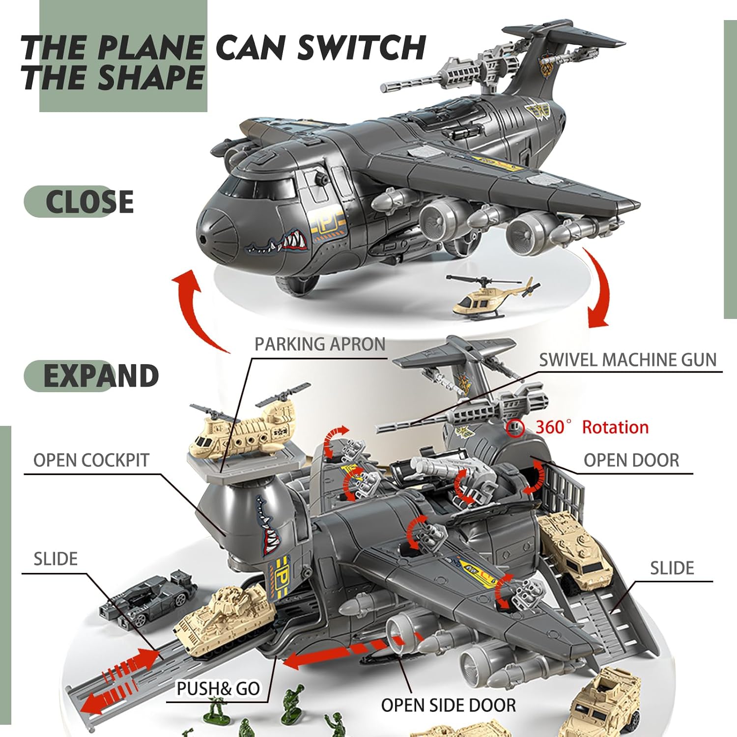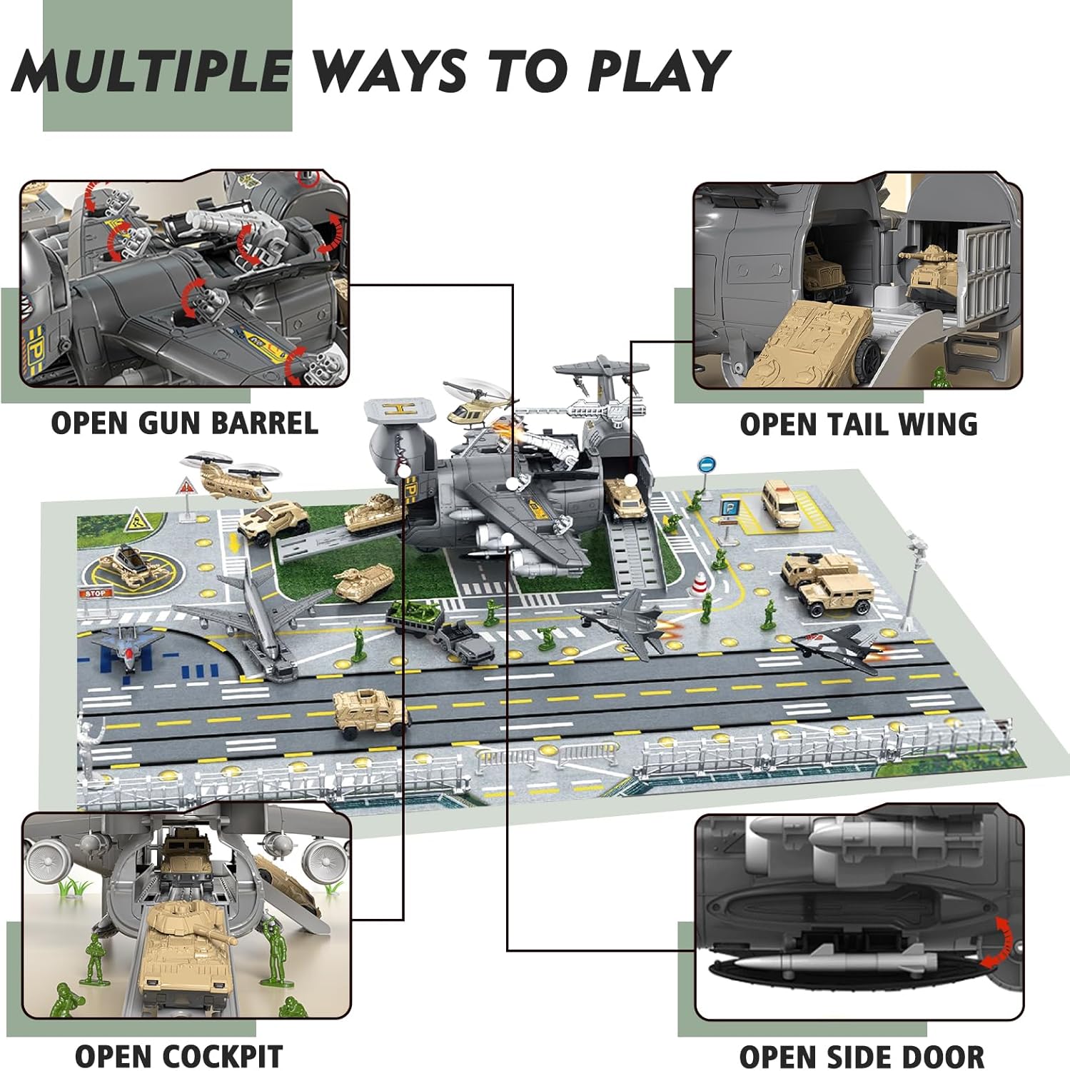 Set di giocattoli con aerei e auto militari: questo set di giocattoli contiene una vasta gamma di veicoli militari, aerei, mappe di gioco e modelli di personaggi, che possono essere utilizzati per simulare emozionanti scene di battaglia. Contiene 1 grande aereo da trasporto merci, 14 veicoli militari, 3 caccia, aerei, modelli di mini soldati, mappe di gioco da 80x55 cm (circa 80x55 cm) e altri accessori. Design realistico: la scacchiera dell'aereo militare è retrattile; il muso e la coda dell'aereo militare sono apribili; il portellone del cargo è apribile e il design è realistico. I dettagli realistici offrono maggiore giocabilità ai bambini e possono coltivare la loro immaginazione, la coordinazione occhio-mano e sono giocattoli educativi prescolari che promuovono lo sviluppo del cervello. Giocattoli di assemblaggio di aerei due in uno: l'aereo da trasporto può essere trasformato in due forme diverse e il coperchio anteriore dell'aereo da trasporto può essere aperto per diventare un passaggio. Può ospitare auto e anche auto e personaggi in miniatura possono essere riposti negli scomparti apribili. Risparmia spazio e facilita lo stoccaggio, aiutando i bambini a sviluppare buone abitudini di smistamento e stoccaggio. Assemblaggio interattivo: incoraggia i bambini ad assemblare autonomamente l'aereo da trasporto, promuovendo lo sviluppo della consapevolezza spaziale. Questa esperienza pratica migliora le capacità di problem solving e accresce la loro fiducia in se stessi mentre assemblano il proprio aereo. La grande portaerei è dotata di un centro di combattimento, cannoni e grembiuli, regalando ai bambini emozionanti avventure di combattimento militare. Sicuro e durevole: realizzato con materiali sicuri e adatti ai bambini, con bordi lisci per garantire una lunga durata e lunghe ore di gioco creativo. Lascia che il tuo bambino sperimenti le funzioni dell'aereo e la conoscenza dei trasporti.