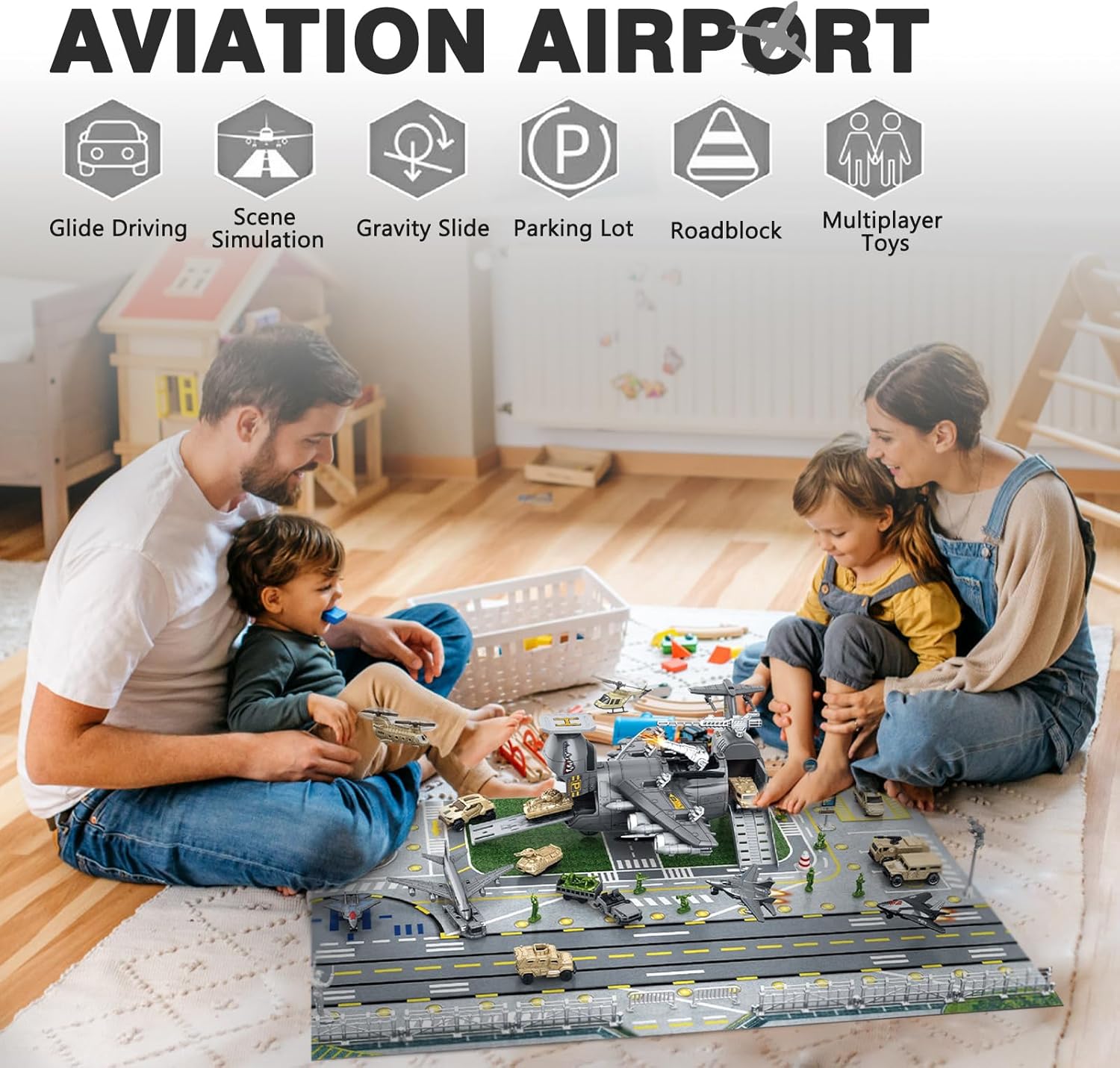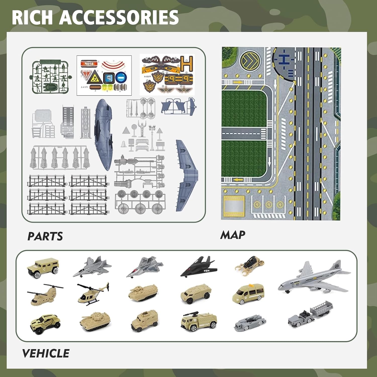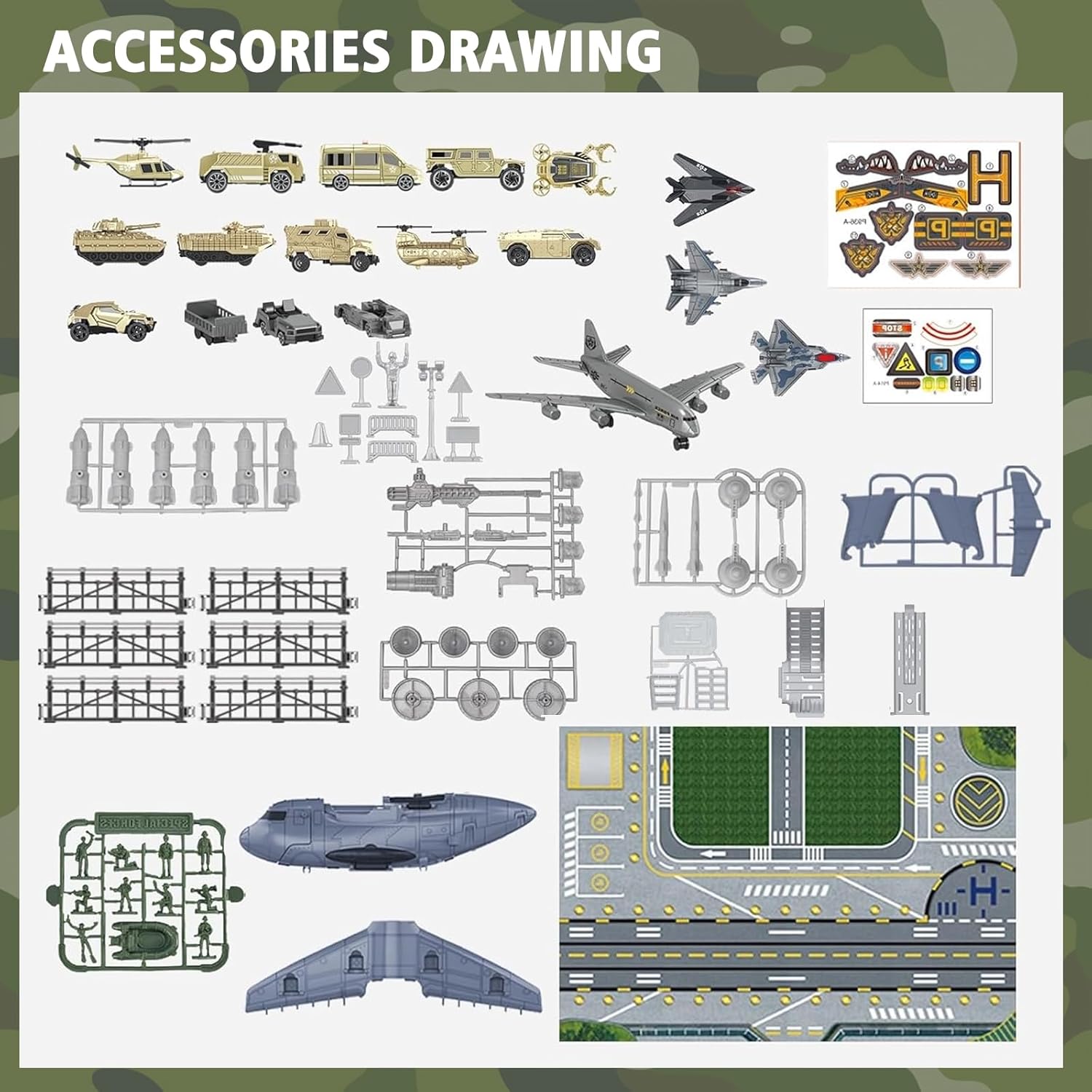 Set di giocattoli con aerei e auto militari: questo set di giocattoli contiene una vasta gamma di veicoli militari, aerei, mappe di gioco e modelli di personaggi, che possono essere utilizzati per simulare emozionanti scene di battaglia. Contiene 1 grande aereo da trasporto merci, 14 veicoli militari, 3 caccia, aerei, modelli di mini soldati, mappe di gioco da 80x55 cm (circa 80x55 cm) e altri accessori. Design realistico: la scacchiera dell'aereo militare è retrattile; il muso e la coda dell'aereo militare sono apribili; il portellone del cargo è apribile e il design è realistico. I dettagli realistici offrono maggiore giocabilità ai bambini e possono coltivare la loro immaginazione, la coordinazione occhio-mano e sono giocattoli educativi prescolari che promuovono lo sviluppo del cervello. Giocattoli di assemblaggio di aerei due in uno: l'aereo da trasporto può essere trasformato in due forme diverse e il coperchio anteriore dell'aereo da trasporto può essere aperto per diventare un passaggio. Può ospitare auto e anche auto e personaggi in miniatura possono essere riposti negli scomparti apribili. Risparmia spazio e facilita lo stoccaggio, aiutando i bambini a sviluppare buone abitudini di smistamento e stoccaggio. Assemblaggio interattivo: incoraggia i bambini ad assemblare autonomamente l'aereo da trasporto, promuovendo lo sviluppo della consapevolezza spaziale. Questa esperienza pratica migliora le capacità di problem solving e accresce la loro fiducia in se stessi mentre assemblano il proprio aereo. La grande portaerei è dotata di un centro di combattimento, cannoni e grembiuli, regalando ai bambini emozionanti avventure di combattimento militare. Sicuro e durevole: realizzato con materiali sicuri e adatti ai bambini, con bordi lisci per garantire una lunga durata e lunghe ore di gioco creativo. Lascia che il tuo bambino sperimenti le funzioni dell'aereo e la conoscenza dei trasporti.