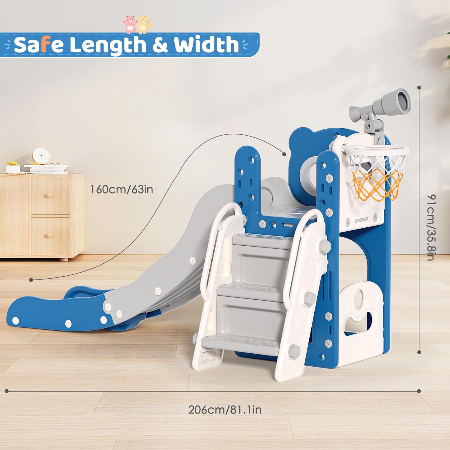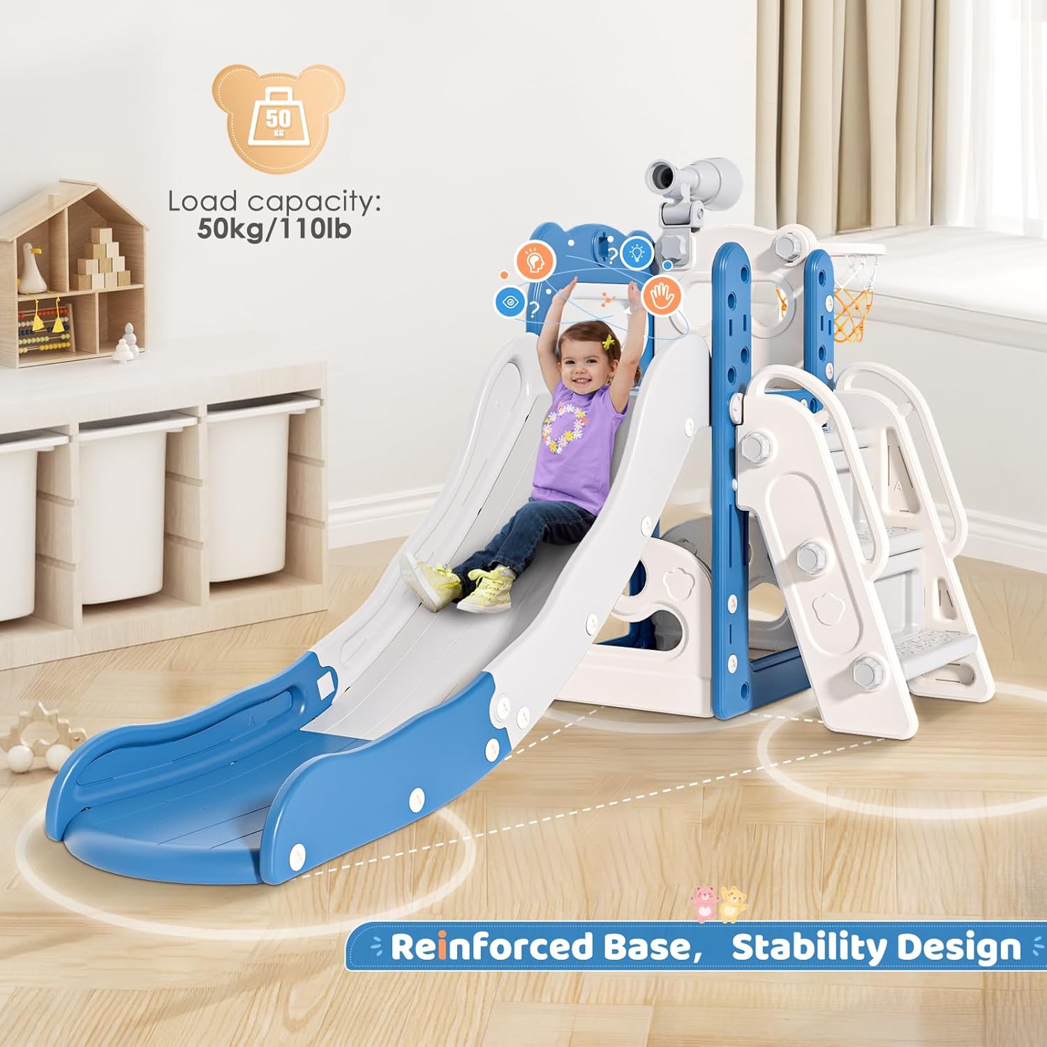 【Design sicuro e resistente】 Lo scivolo dispone di una lunga e ampia pista di scorrimento con zone di sicurezza, una scala completamente chiusa con pedali antiscivolo e un'elevata capacità di carico fino a 50 kg. Soddisfa gli standard di sicurezza ed è realizzata con materiali atossici e durevoli. Combinazione multifunzionale: il nostro scivolo per bambini offre molteplici funzioni, tra cui un emozionante scivolo, una scala da arrampicata, un canestro da basket per bambini e uno spazio per i giocattoli. Non solo i bambini si divertono a scivolare, arrampicarsi, lanciare cestini ed esplorare, ma sviluppano anche abilità importanti come l'equilibrio, la coordinazione motoria e la forma fisica. 【Design scientifico della parete divisoria】 La pista di scorrimento per bambini da 67 pollici dispone di 3 aree di scivolo scientificamente progettate – zone di accelerazione, decelerazione e tampone. L'area d'attesa offre ampio spazio e garantisce una splendida esperienza di scivolamento. Incoraggia i tuoi piccoli a intraprendere un"avventura scivolosa piena di risate mentre esplorano il brivido di ogni zona! Materiali facili da usare e durevoli: questo giocattolo da esterno per bambini è stato progettato per la facilità d'uso perché è realizzato in materiale HDEP ad alta densità ed ecologico, atossico e inodore. Il giocattolo per esterni è anche durevole e resiste all'usura quotidiana. Facile da installare: questo set da gioco per esterni contiene tutti gli accessori necessari e puoi seguire facilmente i passaggi nel manuale per un'installazione rapida. È progettato sia per uso interno che esterno ed è il regalo perfetto per dare ai tuoi bambini un'infanzia adorabile piena di risate.