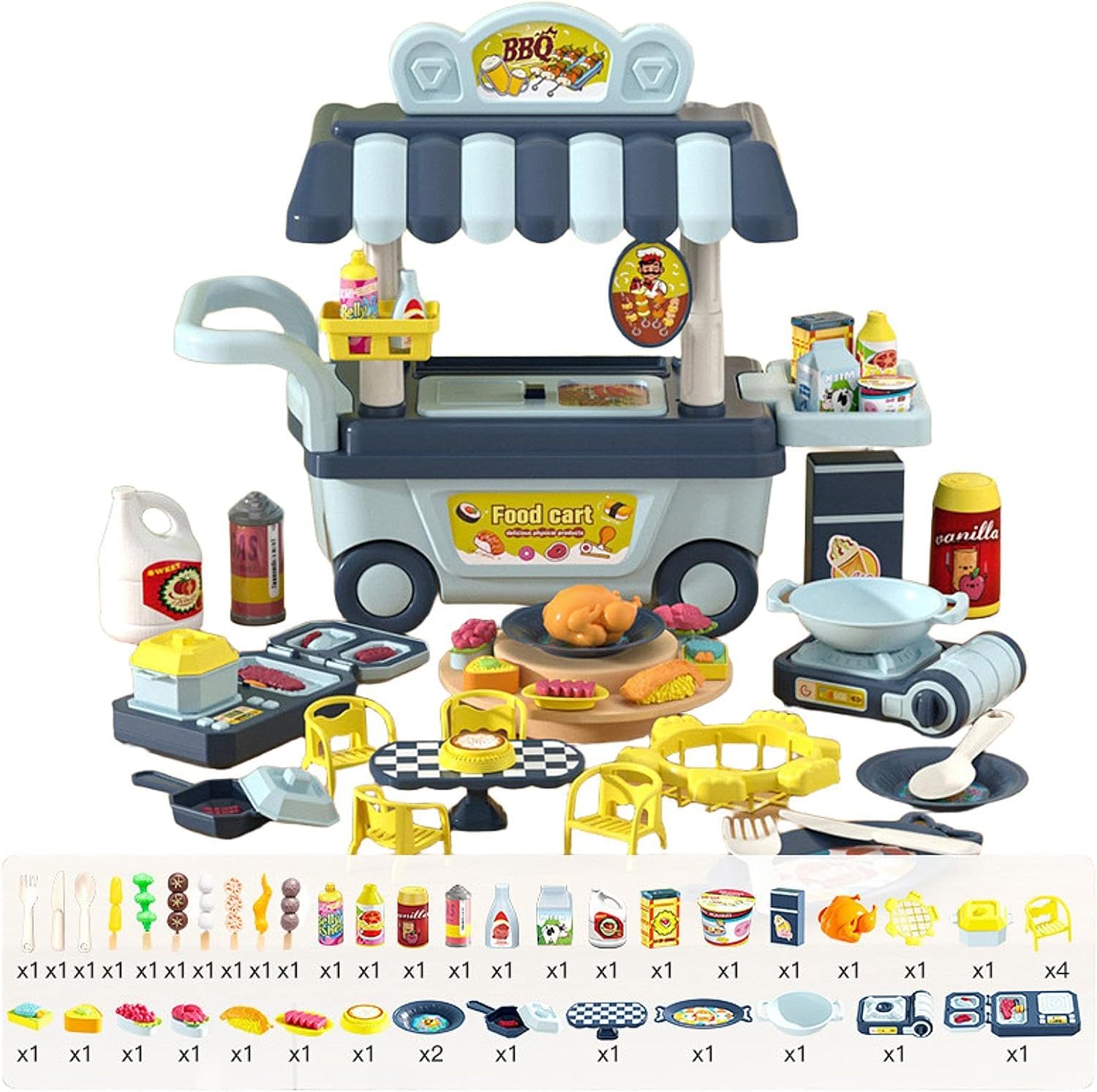 【Effetti sonori e luminosi】: Dotato di effetti sonori e luminosi, questo set da gioco per barbecue per bambini rende l'esperienza del barbecue più realistica, attirando l'attenzione dei bambini e aggiungendo divertimento alle loro attività di gioco di ruolo (alimentatore AA richiesto, ma non incluso) 【Design realistico】: questo mini set di giocattoli per barbecue per bambini è realizzato con accessori che assomigliano molto a un vero barbecue all'aperto, rendendo i bambini coinvolti nel gioco del barbecue e portando molto divertimento 【Gioco di ruolo】: In scenari di gioco di finzione, i bambini possono assumere ruoli come chef, cameriere/a o cliente. Attraverso l'interazione con i coetanei, ampliano le trame e le ambientazioni di gioco, aiutando a sviluppare abilità sociali e capacità di linguistica, promuovendo al contempo il pensiero logico e la capacità di problem solving, oltre a migliorare la motricità fine e la coordinazione occhio-mano. 【Vari accessori】: il set di gioco include una varietà di modelli alimentari realistici come verdura, frutta, carne e pane, oltre a utensili da cucina come piatti, ciotole, cucchiai, forchette e accessori per la tavola come tavolo e sedie. I bambini possono partecipare all'intero processo, dalla preparazione degli ingredienti alla cottura e al servizio dei pasti. 【Divertimento in cucina fai da te】: questo set di giocattoli con carrello da barbecue simulato supporta il gioco della grigliata fai da te. I bambini possono mescolare e abbinare diversi modelli di cibo in base alle loro preferenze e creatività, consentendo loro di esercitare appieno la loro immaginazione e le loro capacità creative.