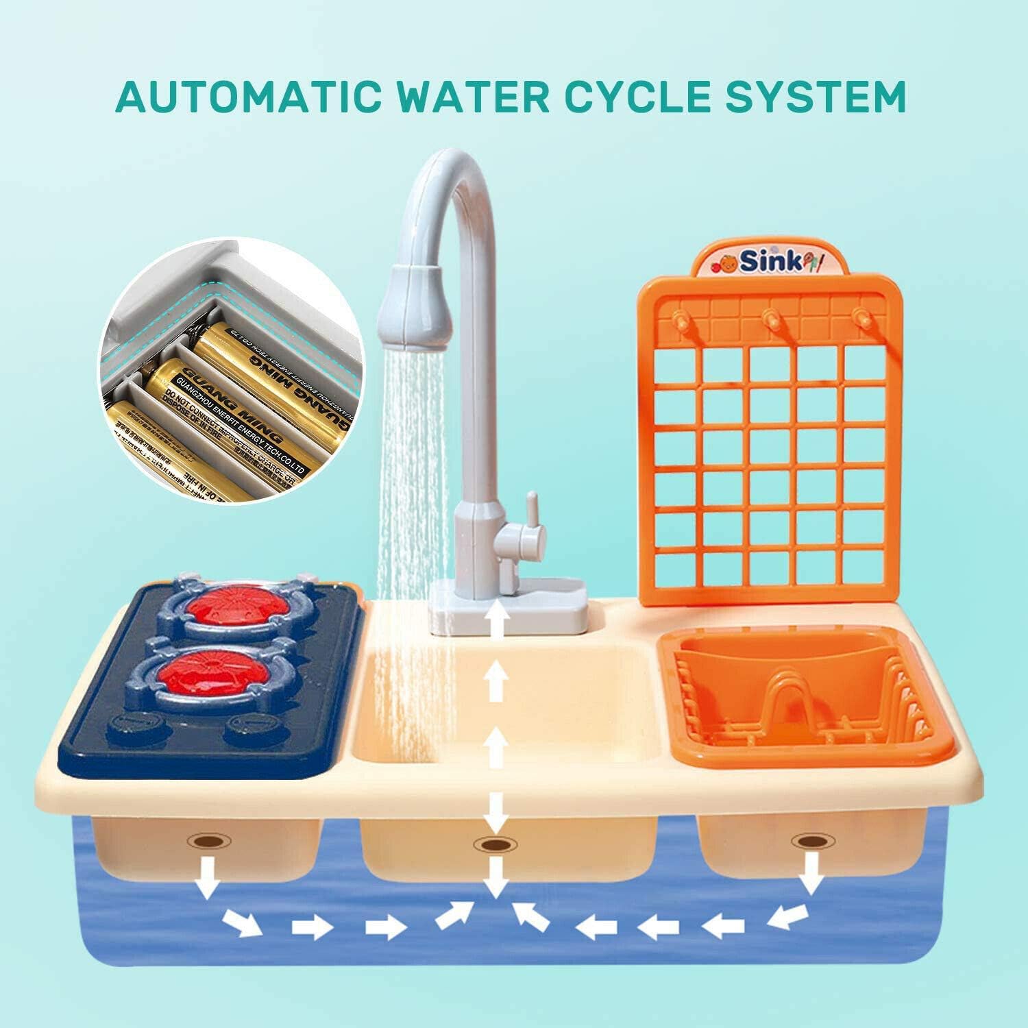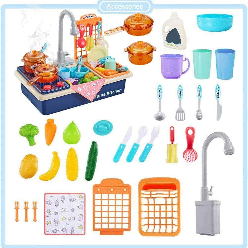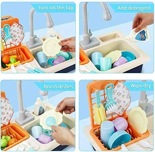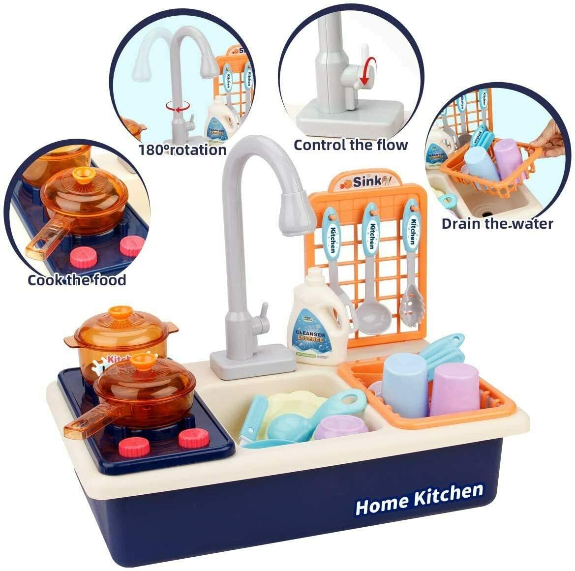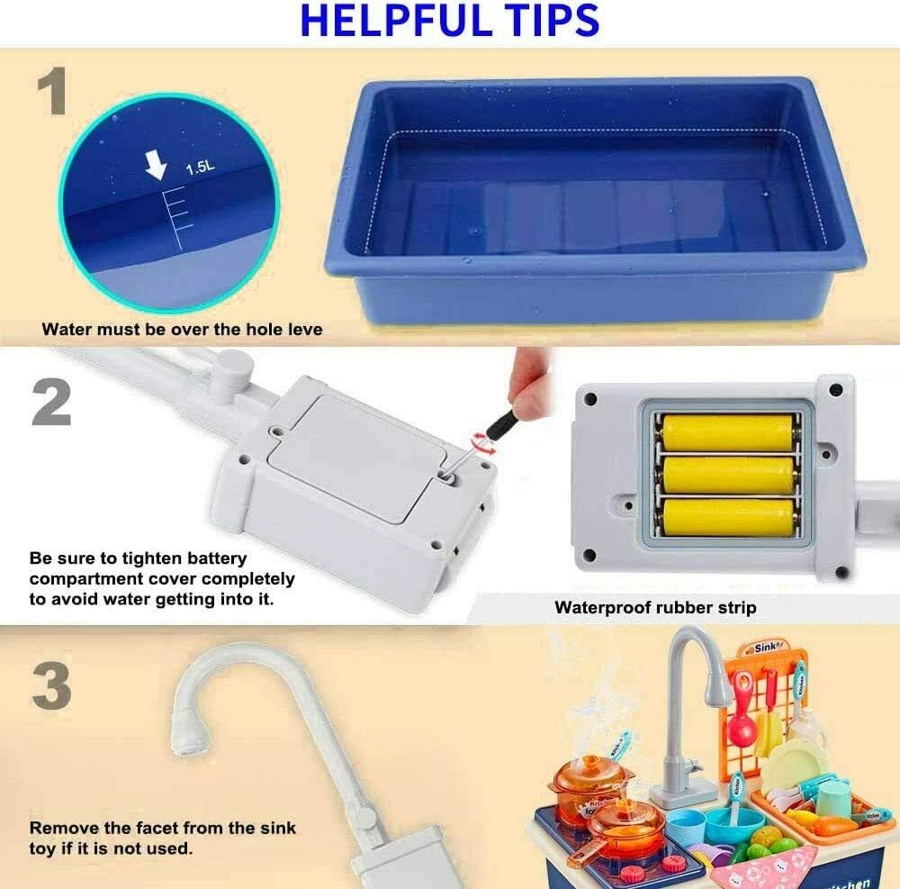 Introdurre set di giochi di ruolo: lavandino multifunzionale con stufa in materiale ABS inodoro; bordi lisci, senza borse, senza bordi taglienti su qualsiasi accessorio; resistente e facile da assemblare. Tavola da gioco con rubinetto elettrico: rubinetto a 180°, circolazione automatica dell'acqua per un flusso fluido e una velocità uniforme. Doppia la gioia con il lavandino da gioco e la stufa. Gioca stoviglie e utensili: una varietà di accessori per stoviglie e utensili da cucina di simulazione. Puoi lavare e cucinare allo stesso tempo. Supporto di scarico rimovibile: rack appositamente progettato per filtrare l'acqua e stoccare i piatti. Guida i tuoi figli a sviluppare l'abitudine di organizzarsi. Gioco di ruolo e riconoscimento: simulare frutta e verdura che possono essere tagliati e sbucciati. Condividi la gioia di cucinare insieme.