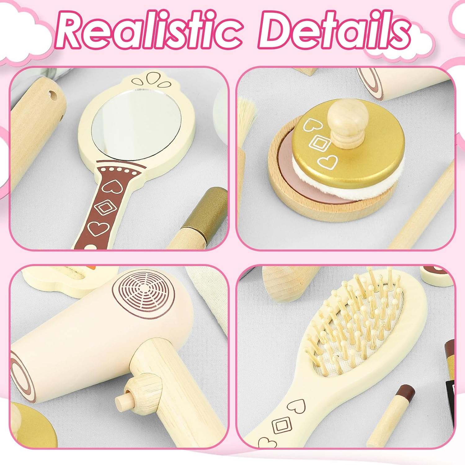 Set di accessori ricchi: con più di una dozzina di strumenti per il trucco e il salone di bellezza come rossetti, profumi, spazzole e piastre per capelli, questo set è perfetto per stimolare l'immaginazione dei bambini e farli godere di un divertimento di ruolo. 【 Struttura sicura 】 Realizzato in legno naturale e colore sicuro con bordi lisci, questo set di giocattoli per il trucco in legno assicura che le bambine possano giocare in modo sicuro e senza preoccupazioni. Design realistico: con dettagli realistici come bottiglie di profumo, pennelli morbidi e una piastra lisciante simulata, questo giocattolo per bambini favorisce l'apprendimento pratico e lo sviluppo sensoriale. 【 Soluzione portatile 】 Nella pratica custodia di questo set di trucco per bambini, tutti gli oggetti sono ben organizzati e possono essere facilmente trasportati in viaggio. Regalo ideale per ragazze: questo set di giocattoli da trucco in legno è un regalo premuroso per bambini da 3 a 7 anni per compleanni, vacanze o altre occasioni speciali. Promuove la creatività, il gioco immaginativo e l'interazione sociale.