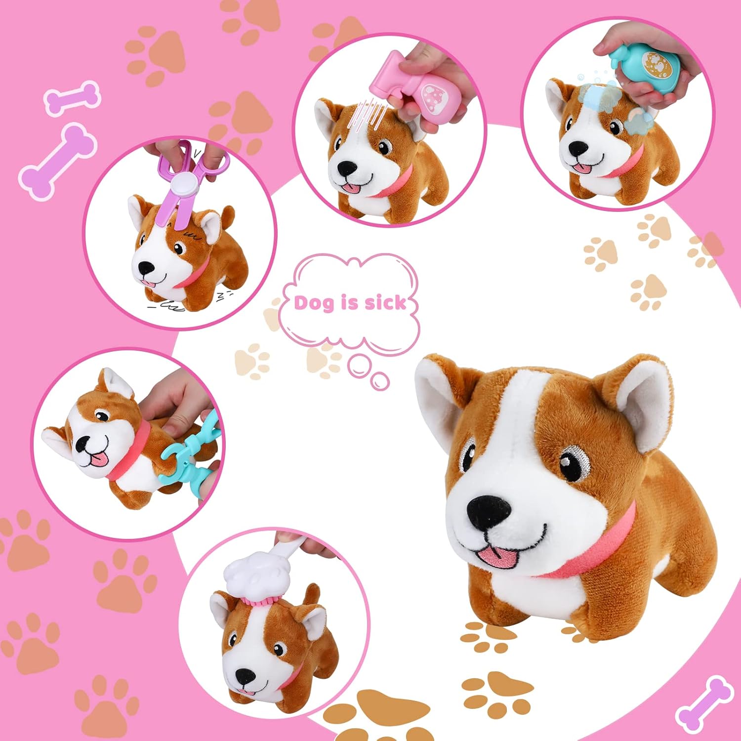 Set di giocattoli veterinari: il set da 20 pezzi include cane di peluche, stetoscopio, siringa, termometro, tagliacapelli, forbici, tagliaunghie, bilancia, pala, abbeveratoio, pettine, shampoo, unguento nutriente, ciotola per cibo, cibo per animali domestici, lattina, osso, palla per animali domestici, adesivo e custodia per il trasporto. Gli adesivi forniti permetteranno a tuo figlio di decorare la valigia come desidera e di godersi il divertimento di decorare e tenere animali domestici. Valigia con campanello e abbaio: i pulsanti sulla valigia possono suonare il campanello e gli animali domestici, richiedono 2 batterie AA (non incluse) per funzionare, dando ai bambini un vero senso di esperienza. La valigia contiene tutti gli accessori, ispira le abitudini di conservazione di tuo figlio e tuo figlio potrà portarla fuori come un vero animale domestico. [Esperienza reale] Lo stetoscopio può emettere luci e battiti cardiaci simulati. Tirando il cavo dietro il rifinitore si produce un vero suono vibrante. I termometri possono visualizzare temperature diverse. Il realismo è molto forte, aggiungendo divertimento a molti giochi. [Valore del gioco] Il set veterinario del gioco di simulazione ha vari strumenti e medici per la cura degli animali domestici, i bambini possono sperimentare come la cura quotidiana, la cura dei malati, l'alimentazione, il bagno degli animali domestici. Aiuta i bambini a sviluppare empatia, ad apprendere la responsabilità e a ridurre la paura dei bambini verso l'ospedale. Regalo perfetto: questo set per la cura degli animali domestici consente ai bambini di prendersi cura dei loro adorabili animali domestici sempre e ovunque. Splendidamente confezionato, è il regalo perfetto per le ragazze di compleanno, Natale o Festa dei bambini.