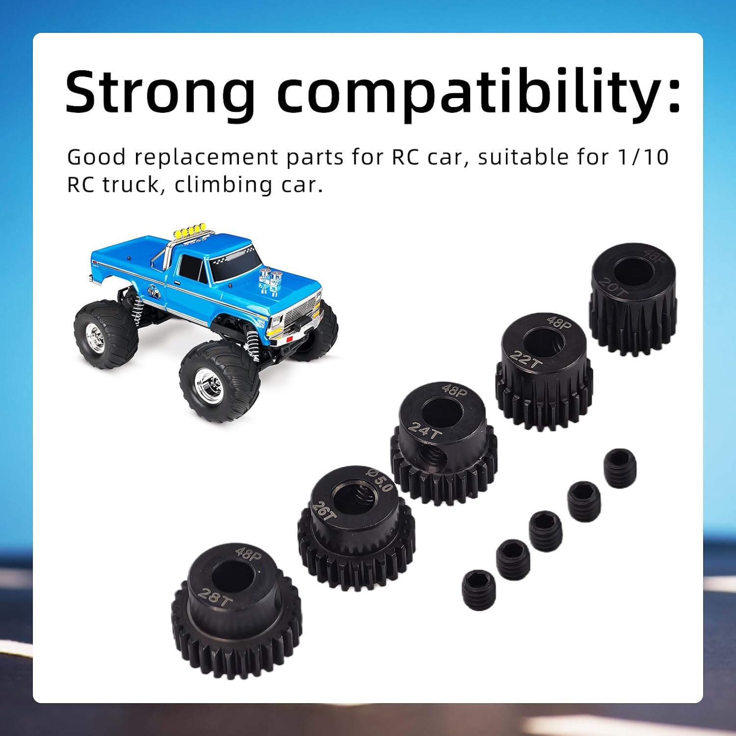 【5 dimensioni degli ingranaggi】Diametro dell'ingranaggio del motore del telecomando: 11 mm (20 denti), 12 mm (22 denti), 13 mm (24 denti), 14 mm (26 denti), 15 mm (28 denti), la confezione include anche 5 viti per macchine, specifiche M4 * 4, con un diametro di 4 mm e un'altezza di 4 mm 【Materiale in acciaio 45】 Realizzato in acciaio resistente e durevole, in modo che il gruppo ingranaggi abbia prestazioni eccellenti, il che aiuta a migliorare le prestazioni complessive dell'auto telecomandata, facile da installare, flessibile e resistente 【Pignone 48DP】48DP è il passo di ciascun dente del pignone e 20 denti, 22 denti, 24 denti, 26 denti, 28 denti è il numero di denti del pignone. Devi assicurarti che il tuo ingranaggio cilindrico e il pignone abbiano lo stesso passo, altrimenti i denti non si incastreranno 【Applicabile】Adatto per auto telecomandate, motori con dimensioni dell'albero (5 mm) (assicurarsi che l'albero del motore RC abbia lo stesso diametro), veicoli da arrampicata in montagna, non facilmente deformabili o danneggiabili, possono essere utilizzati come sostituzione degli accessori originali 【Fornitura】Riceverai 5 ingranaggi motore telecomandati e viti di regolazione per ciascun pignone. Ti piacerà la possibilità di modificare il rapporto di trasmissione per diverse condizioni della pista con un pignone a passo 48