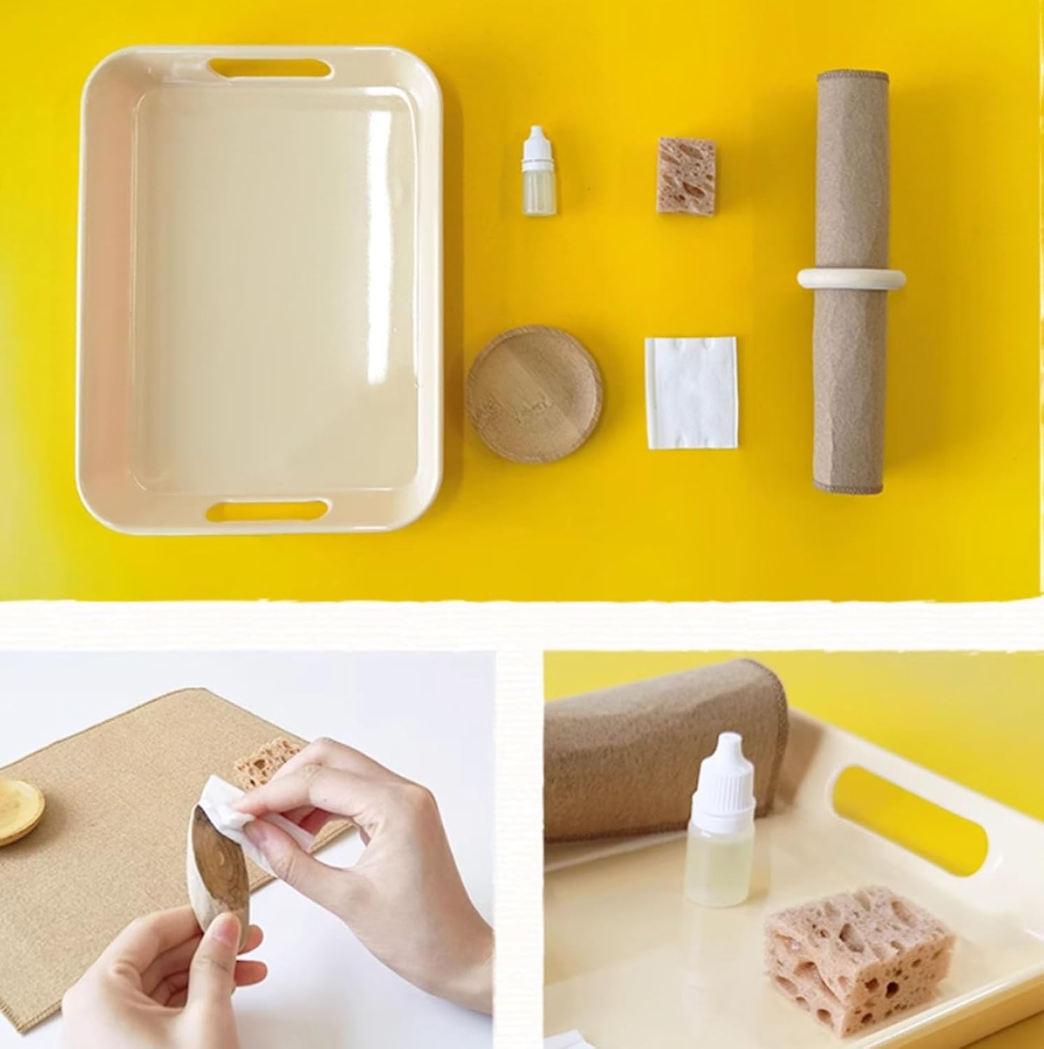 Nota: l'acqua di rame puro e l'olio di noci devono essere preparati da soli. Lavori di pulitura e lucidatura. Lascia che i bambini imparino a pulire e a prendersi cura delle cose. Promuovere la consapevolezza dei bambini sulla protezione dell'ambiente. Adatto a bambini dai 3 ai 6 anni.