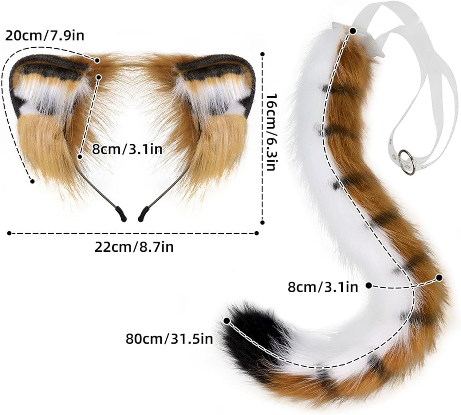 Descrizione : Design regolabile: il set di orecchie e coda di tigre è progettato con fili di ferro integrati, che consentono di piegarli e modellarli come desiderato. La distanza tra le orecchie può essere regolata e può anche essere staccata per comodità. La coda dispone anche di una cintura regolabile trasparente in vita per una vestibilità comoda. Materiale: realizzato in poliestere resistente, questo set di orecchie e coda per cosplay è progettato per durare, assicurandoti di poter goderti le tue feste in costume o le convention dei fumetti senza preoccuparti dell'usura. non adatto a bambini di età inferiore ai 6 anni. Dimensioni del prodotto: le orecchie di tigre misurano 20 cm x 8 cm, fascia 22 cm x 16 cm; la coda misura 80 cm x 8 cm, rendendolo un'aggiunta accattivante al tuo outfit cosplay. La confezione include: la confezione viene fornita con 1 fascia con orecchie di tigre e 1 coda di tigre, fornendo un set completo per le tue esigenze di cosplay. Uso versatile: questo set realistico di orecchie e coda di tigre è ideale per varie occasioni come feste di Halloween, convegni di fumetti, eventi cosplay o semplicemente per divertirsi a giocare a casa. Tabella delle taglie: orecchie: 20 cm x 8 cm. Cerchietto: 22 cm x 16 cm. coda: 80 cm x 8 cm. La confezione include: 1 fascia per capelli. 1 coda Nota: Si prega di considerare un margine di errore dovuto alla misurazione manuale e ai diversi monitor.