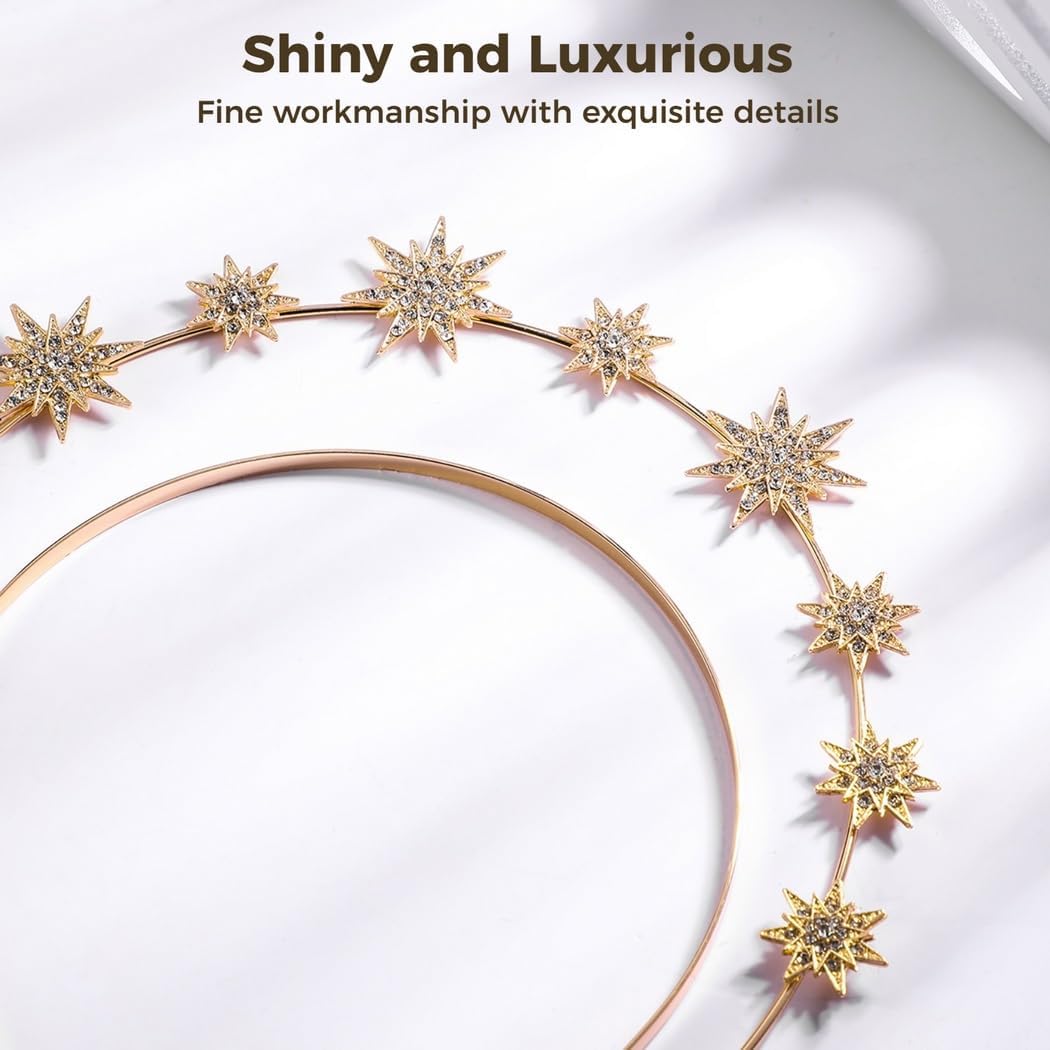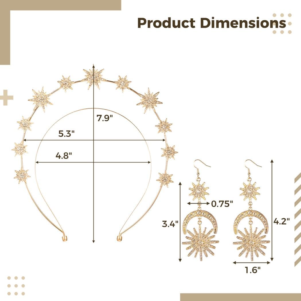 Elegante tocco da sposa: un set di corona e orecchini dorati abbaglianti, progettati per migliorare le caratteristiche del viso; aggiunge un fascino scintillante al tuo look da matrimonio; per far risaltare la sposa Vestibilità personalizzata: filo pieghevole con stelle in metallo e strass; gli orecchini pesano solo 27 g, rendendoli comodi da indossare tutto il giorno; facilmente regolabili per adattarsi a qualsiasi acconciatura Accessorio multievento: viene fornito con una corona aureola e orecchini abbinati; ideale per matrimoni, cosplay, feste di Halloween e altri eventi a tema Facile manutenzione: mantenere la corona e gli orecchini asciutti; pulire con un panno morbido dopo ogni uso; evitare il contatto con sostanze corrosive; rimuovere prima di dormire o fare esercizio fisico Regalo premuroso: un regalo per spose, damigelle, sorelle, madri o amici; un accessorio significativo da custodire per anni