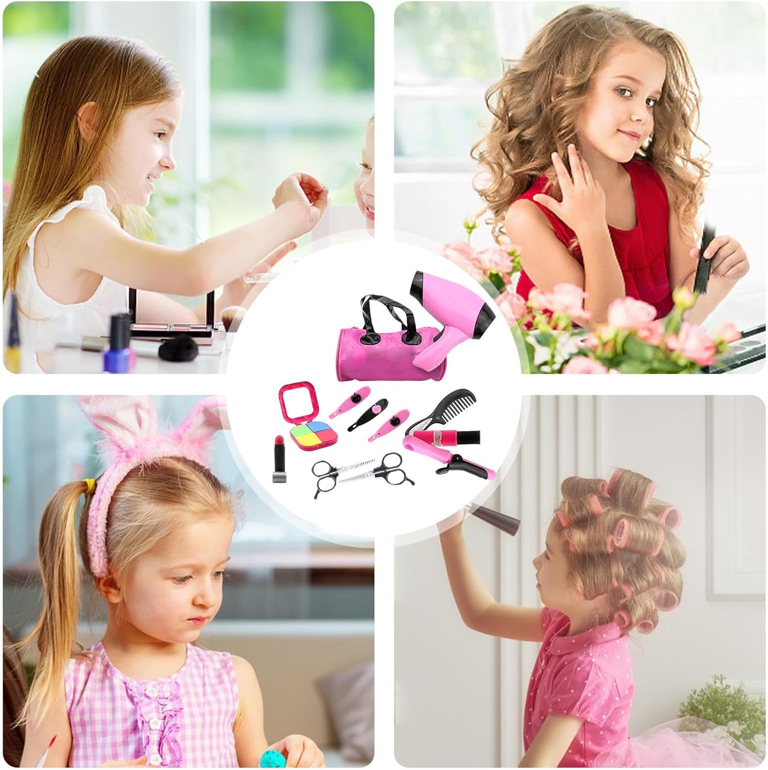 Apri facilmente: intrattenere la tua piccola principessa con il nostro finto kit per il trucco, completo di un asciugacapelli, kit di bellezza del regalo di compleanno per bambini vari ferri da arricciatura per diversi stili, 2 set di , specchio e una borsa per l'organizzazione senza sforzo. Funzionamento della batteria: con il nostro set di trucco finto realistico, le ragazze possono entrare nel mondo delle principesse. Include tutti gli strumenti necessari per il gioco fantasioso. Giocattolo di ruolo del salone per l'asciugacapelli che per bambini Due batterie AA da 1,5 V non sono incluse aggiunte al divertimento e al fascino per i bambini. Molto più durata: realizzata con materiale ABS robusto, il nostro finto set di trucco è costruito per durare. Set di giocattoli per acconciature per ragazze con impressionanti durabilità assicura che rimanga sicuro da usare mentre dura per un incredibilmente lungo. Rafforzare le capacità motorie: aumentare le capacità inventive e promuovere il controllo motorio fine con questo set di giocattoli per acconciature per ragazze con finta set di trucco. Incoraggiare la creatività, l'acconciatura di base e il divertimento del gioco di ruolo per lo sviluppo di tuo figlio. Delicato regalo: scatena il lato creativo dei tuoi bambini con questo set di trucco finto. Un regalo per le ragazze dai 3 anni in su, ideale per i compleanni, finta kit per il trucco e lo styling per le vacanze per ragazze o eventi in classe, questo set offre più divertimento e immaginazione.
