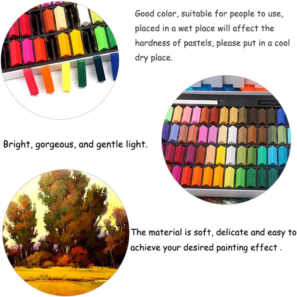 Il materiale è morbido e delicato, facile da colorare, buon effetto colorante. Usato per la pittura professionale, la polvere è più delicata, adatta a sbavature e sovrapposizioni di colori, e il colore è luminoso. Colore puro, facile da ottenere l'effetto di pittura ideale. I gessi sono colori vivaci, splendidi, delicati e brillanti, ricchi di colori e altamente resistenti alla luce, facili da miscelare, sicuri e atossici, solubili in acqua ed ecologici. La forma a quattro angoli è adatta per disegnare linee sottili e larghe e spalmare grandi aree. Facile da afferrare per i bambini. I bambini possono usarlo per graffiti, decorare o fare capolavori di marciapiedi, questi gessi possono completare tutte le attività. Utilizzabile anche come tintura per capelli una tantum; bagnare il gesso con acqua, applicarlo sui capelli, quindi attendere che i capelli si asciugino completamente. Fantastico gesso di colore misto, è una scelta ideale per pittori e artisti. Questo meraviglioso gesso è una scelta regalo interessante per qualsiasi ragazzo o ragazza che desidera ricevere un regalo. Ottimo per famiglie, scuole, asili, lavagne, cartelli commerciali, ecc.