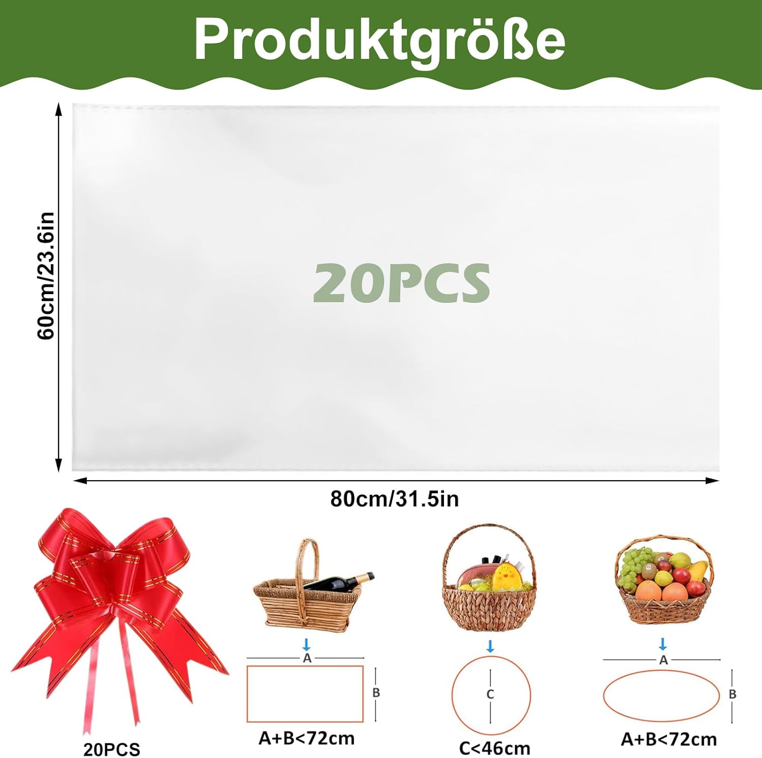 【Set completo di sacchetti regalo】 Questo set contiene 20 confezioni regalo trasparenti di grande formato (60 x 80 cm) e 20 fiocchi a farfalla preformati realizzati in nastro di seta rossa. I sacchetti di cellophane con meccanismo di trazione integrato consentono una chiusura rapida, ideale per eventi aziendali in cui sono necessari sacchetti trasparenti in grandi quantità. 【Confezione regalo di grandi dimensioni】 Con 60 x 80 cm, questi sacchetti di carta regalo trasparenti offrono molto spazio per oggetti di grandi dimensioni come giocattoli di peluche, confezioni di fiori o combinazioni regalo in più parti. L'apertura trasparente della confezione regalo facilita il riempimento ed è particolarmente adatta per matrimoni o feste di compleanno in cui i sacchetti di cellophane sostituiscono i tradizionali imballaggi pieghevoli. 【Pellicola regalo trasparente per alimenti】 Questa pellicola regalo è realizzata in materiale alimentare senza sostanze o odori nocivi, quindi può entrare in contatto diretto con sac à poche, cioccolato o altre bomboniere. I grandi sacchetti di cellophane fungono da strato barriera contro umidità e polvere, ideali per mantenere i dolci freschi mentre sei in movimento. 【Ottica altamente trasparente】 I 20 sacchetti regalo trasparenti offrono una visibilità cristallina del contenuto attraverso un rotolo di pellicola professionale per regali di qualità. La pellicola di carta da regalo è extra rinforzata per evitare strappi e proteggere anche regali di Natale pesanti o oggetti fragili. I sacchetti regalo trasparenti conferiscono ai regali un aspetto professionale, sia che si tratti di sacchetti di pasticceria o di composizioni floreali. 【Ampia gamma di usi】 Che si tratti di fogli regalo trasparenti, mazzi di fiori, baby shower o decorazioni natalizie, questi sacchetti trasparenti possono essere utilizzati universalmente. La pellicola regalo trasparente è perfetta per caramelle, bottiglie di vino, opere d'arte o scatole per snack come bomboniere. I sacchetti di cellophane uniscono l'uso pratico alla presentazione estetica per qualsiasi applicazione di confezioni regalo trasparenti nel settore privato o aziendale.