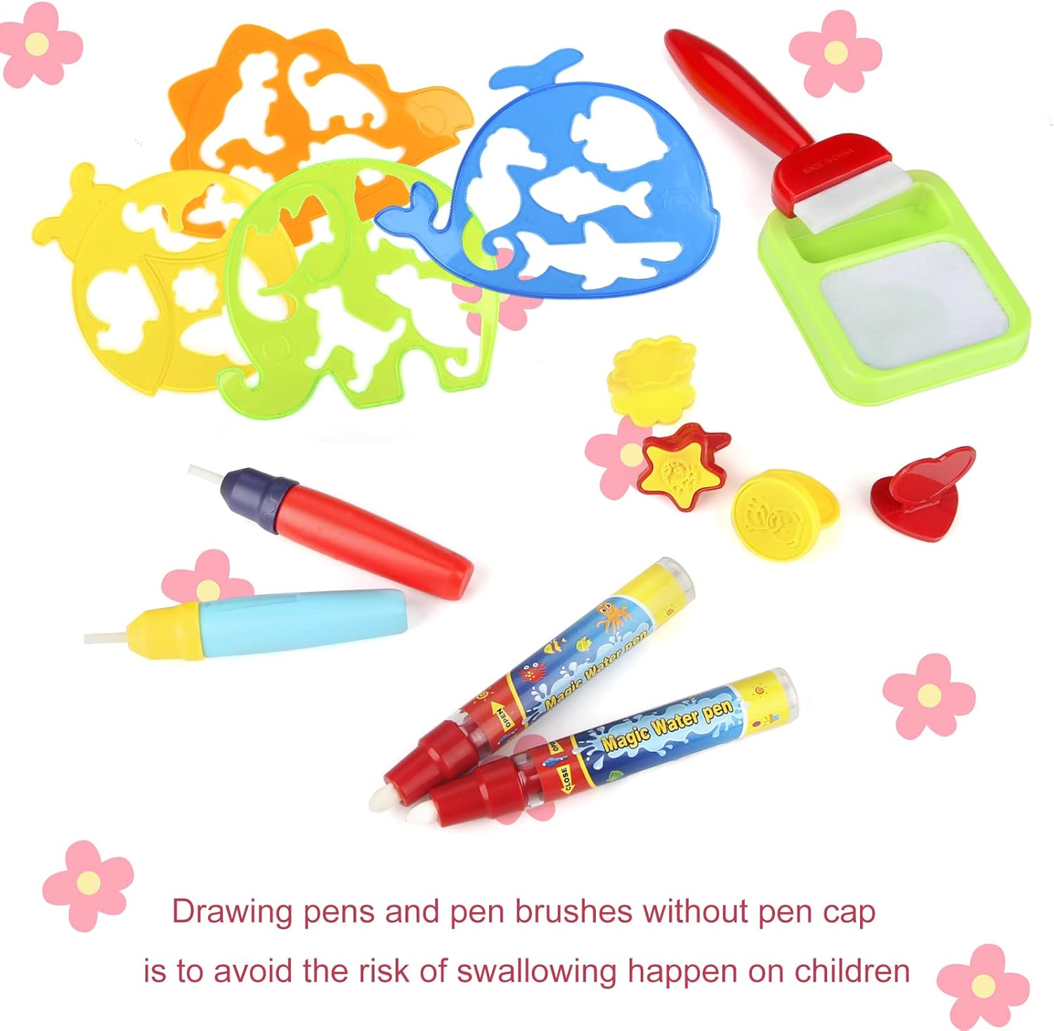 Set completo di accessori: 2 penne, 2 pennelli, 4 disegni di animali, 2 disegni di numeri, 2 disegni di lettere, 4 timbri, 1 tampone di inchiostro, 1 pennello grande Semplice e facile da usare: basta riempire le penne con acqua pulita e iniziare a disegnare Rispettoso dell'ambiente: niente inchiostro, niente vernice, non tossico ed ecologico, esperienza di disegno senza problemi; nessuna macchia sui vestiti del bambino, sui pavimenti o sulle pareti Ideale per gli scarabocchi ad acqua dei bambini: questo set per scarabocchi ad acqua viene fornito con accessori sufficienti per essere un sostituto ideale per le attività di disegno ad acqua dei bambini Design sicuro: le penne magiche ad acqua non sono dotate di tappi per evitare rischi di soffocamento per i bambini, garantendo un utilizzo sicuro