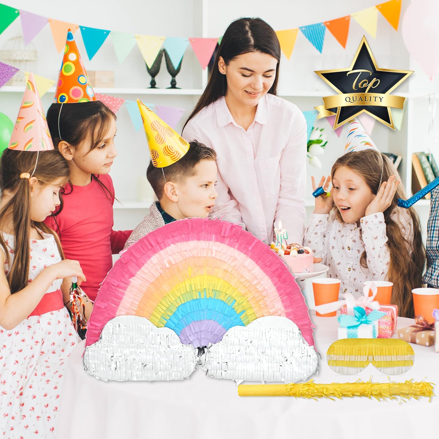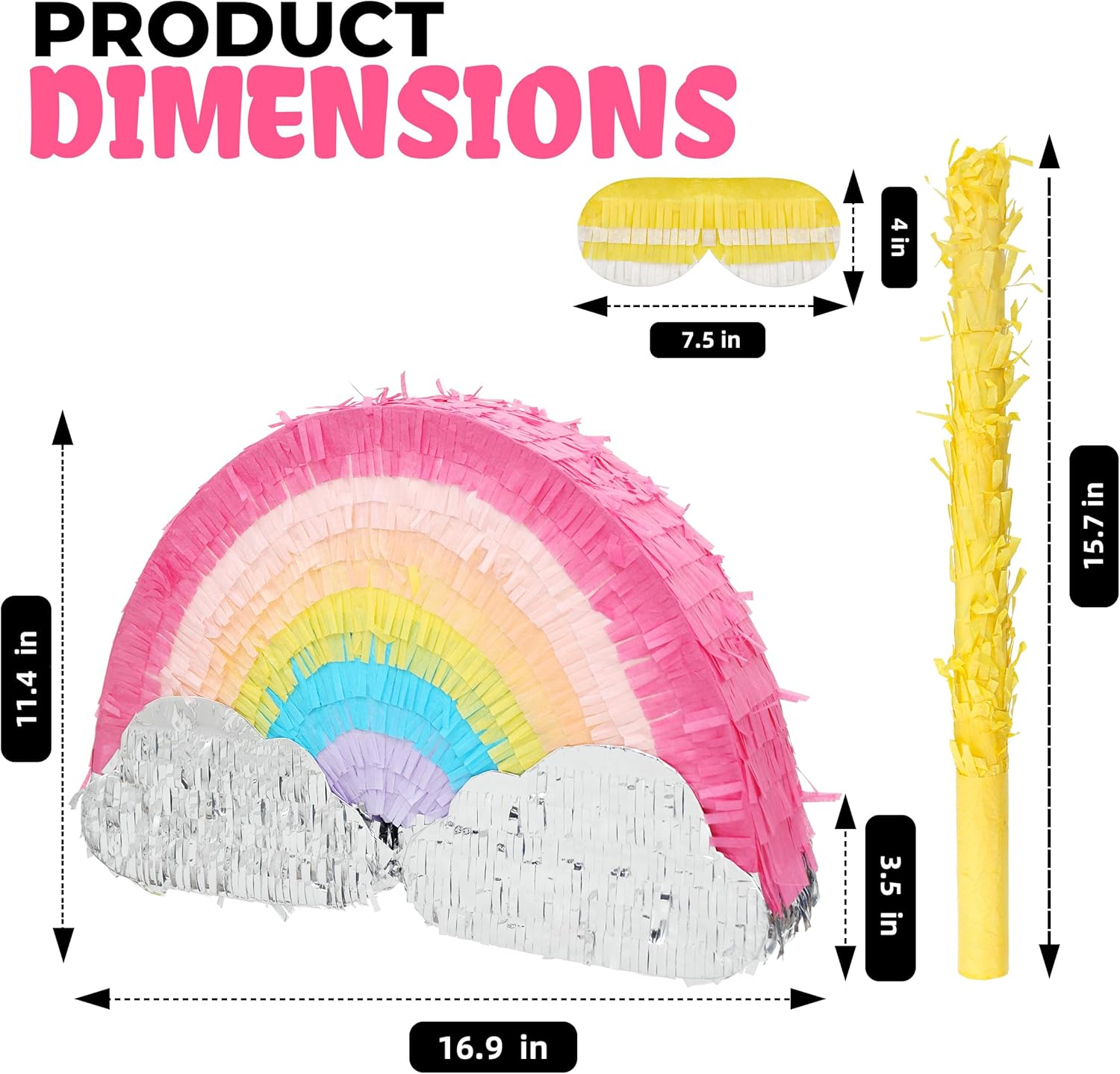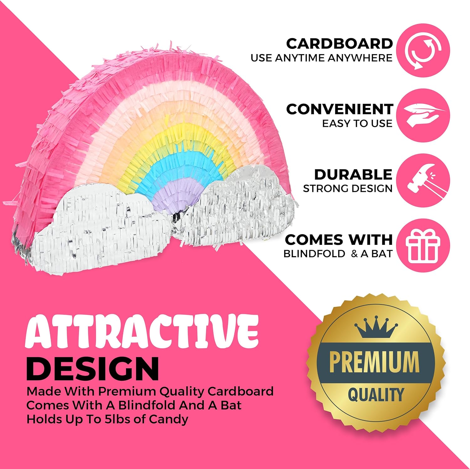 Qualità premium: la pignatta misura 41,9 x 21,6 x 8,9 cm. Realizzato in cartone resistente e di alta qualità. Decorato con carta crespa su carta adesiva, anello in plastica ad alta resistenza per appendere. Il materiale di alta qualità garantisce la sua durata e un aspetto elegante. Viene fornito con una benda e una mazza per rendere più divertente. Facile da riempire: la pignatta è dotata di un foro prefabbricato e di un robusto occhiello nella parte superiore per appenderlo facilmente. C'è un adesivo di apertura sulla porta di riempimento. È possibile riempire fino a 2,3 kg di pignatta, riempire frutta, caramelle, cioccolatini, mini giocattoli e appenderlo dove vuoi. Perfetto per una festa divertente: usa l'arcobaleno come decorazione per feste o fai fare a turno gli ospiti per cercare di rompere la pignatta per rilasciare tutte le caramelle all'interno. Può essere utilizzata per vari eventi: la nostra adorabile pignatta arcobaleno è perfetta per essere utilizzata per vari eventi come feste di compleanno, feste scolastiche, feste a tema e altri eventi simili. Sia i bambini che gli adulti potrebbero divertirsi a rompere l'arcobaleno! Garanzia di rimborso senza rischi: ci dedichiamo a fornire ai nostri clienti prodotti della migliore qualità. Tuttavia, se non sei soddisfatto al 100% del prodotto, rimborseremo felicemente il tuo acquisto, senza domande!