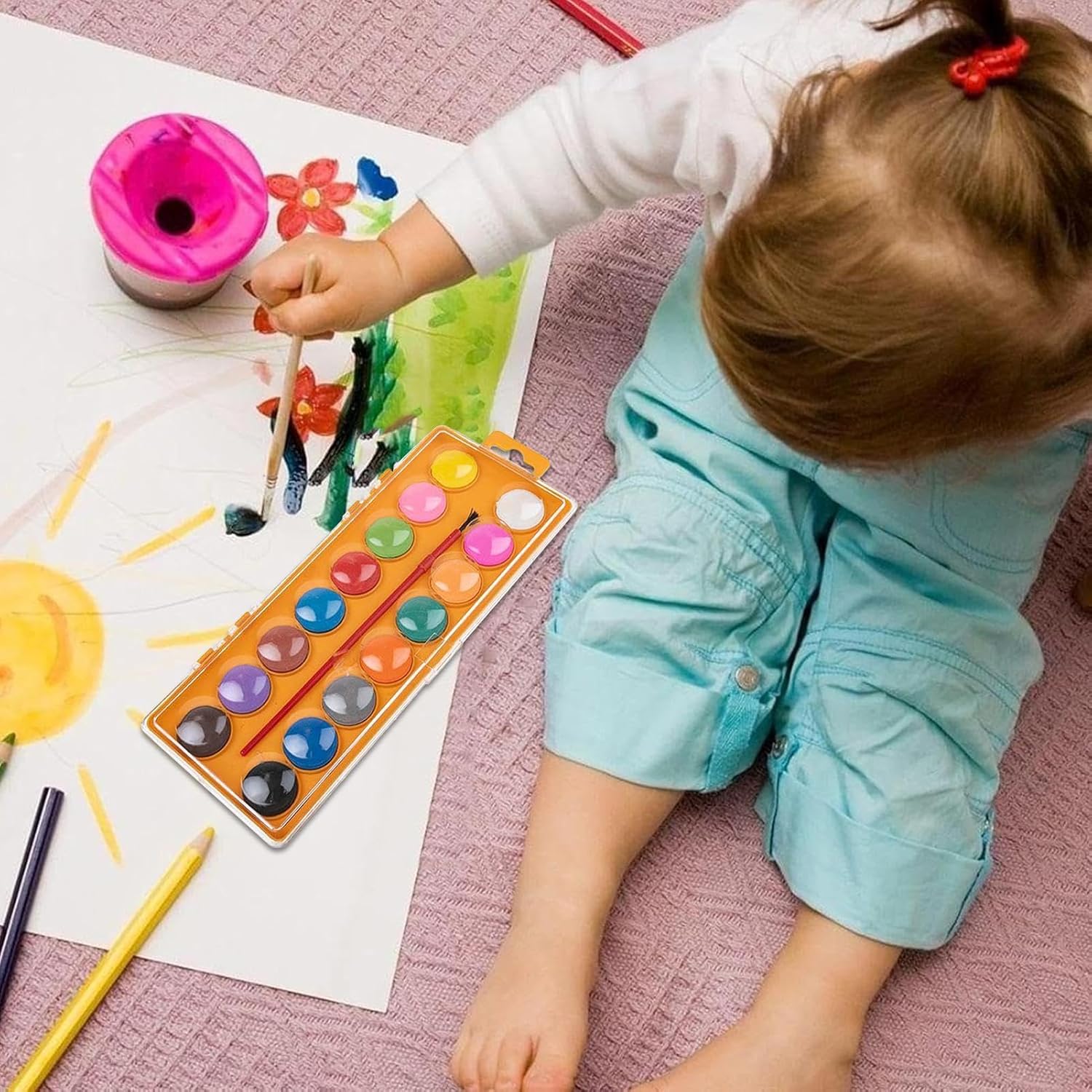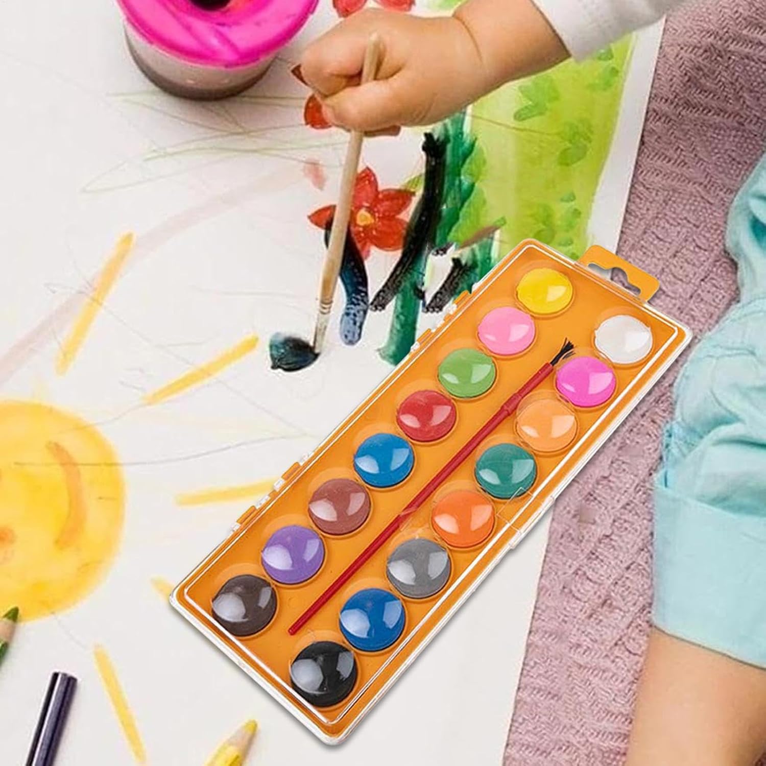 Tavolozza vibrante a 16 colori: questo set include 16 colori ad acquerello ricchi e vivaci, fornendo una vasta gamma di sfumature per creare splendide opere d'arte, perfette per principianti, hobbisti e giovani artisti. Set portatile da viaggio: progettato per una facile portabilità, questo set di acquerelli compatto viene fornito con una comoda custodia, che lo rende ideale per la pittura in movimento e i viaggi, consentendo di creare arte ovunque. Set completo con pennello: il set include un pennello di alta qualità, che assicura di avere tutti gli strumenti necessari per pennellate e miscelazioni precise, ideale per ottenere effetti acquerello dettagliati e lisci. Perfetto per bambini in età prescolare e hobbisti: adatto a tutti i livelli di abilità, questo set di acquerelli è perfetto per bambini, artisti dilettanti o chiunque cerchi di esplorare la pittura ad acquerello come hobby divertente e rilassante. Sicuro: realizzato con materiali sicuri per i bambini, questo set è sicuro per i bambini e ideale per attività educative e creative, consentendo una pittura senza preoccupazioni.