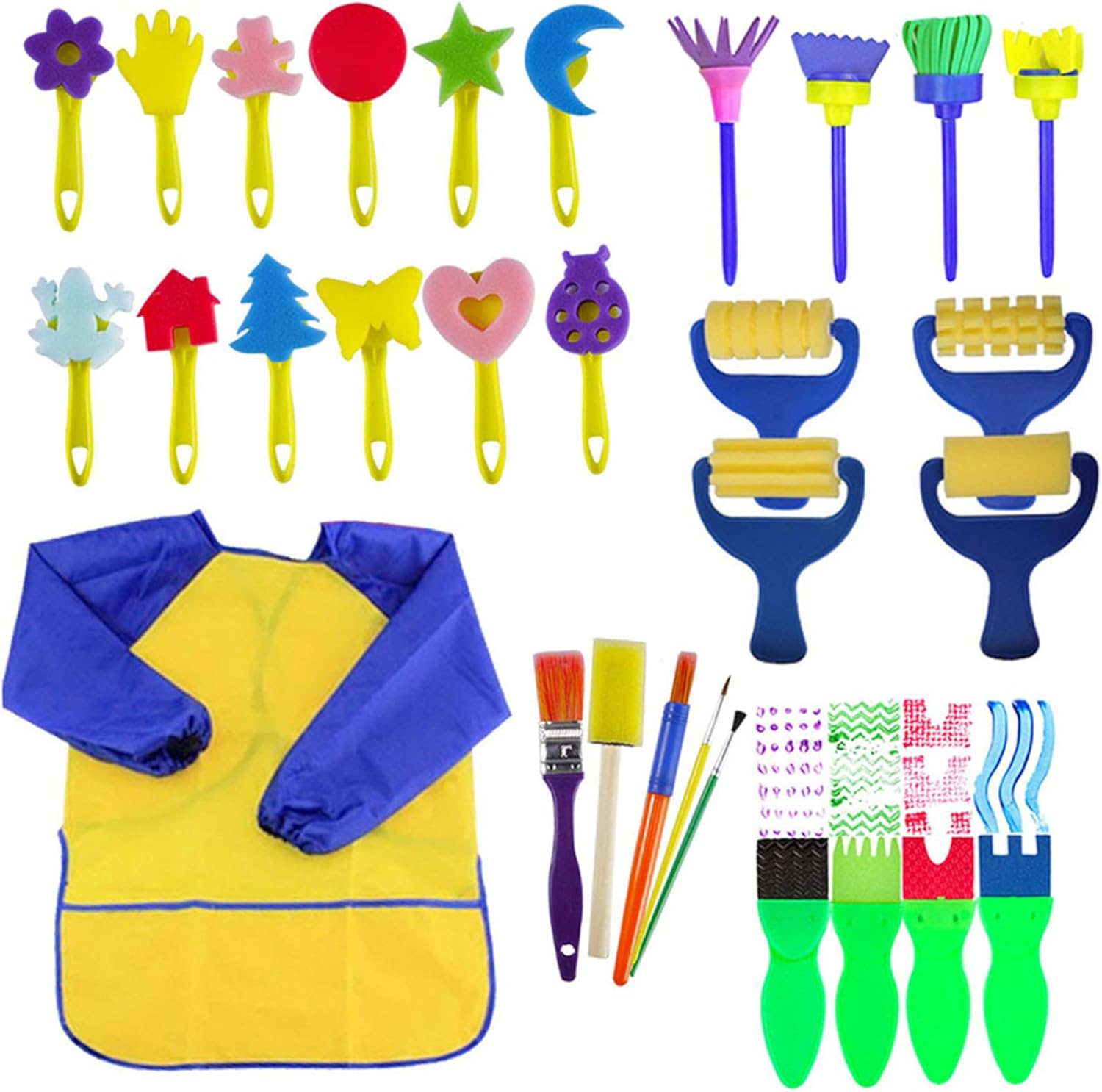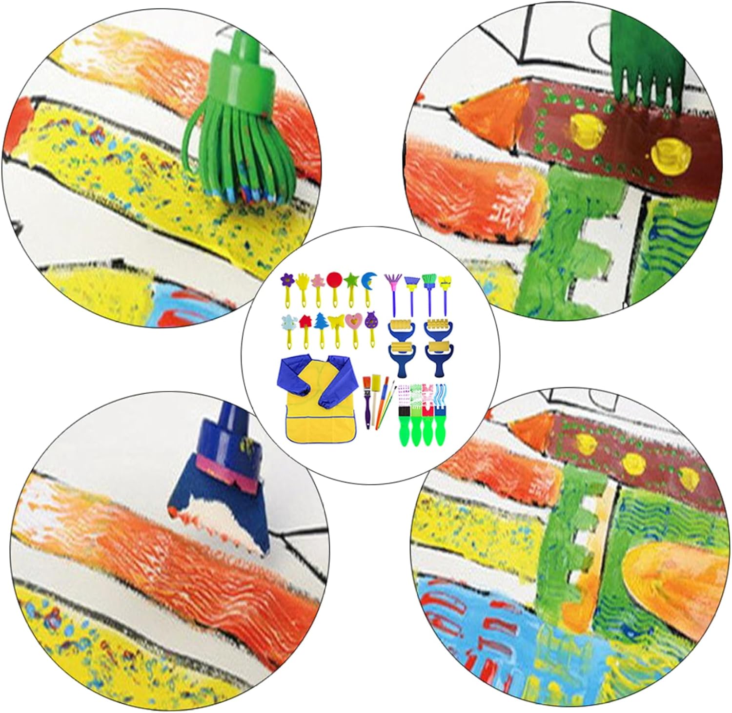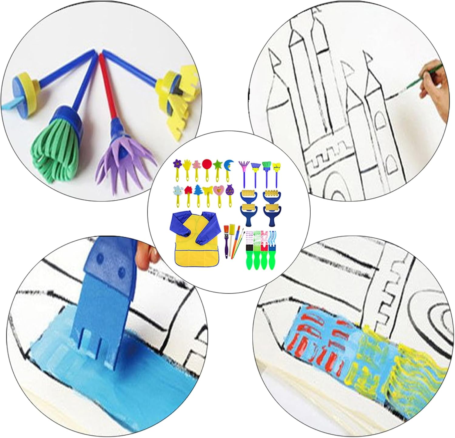 I pennelli per bambini sono realizzati principalmente in spugna che assorbe l'acqua, schiuma ed EVA, non tossici e sicuri, i manici sono in plastica, facili da afferrare e utilizzare Il set da pittura per bambini può aiutare i bambini a rafforzare i muscoli delle mani e delle dita e a sviluppare le capacità motorie Il kit spugna per pennelli per bambini è adatto per vasi da pittura per l'artigianato e l'uso della pittura dei bambini Il kit di strumenti da disegno per pennelli per pittura con bavaglini impermeabili riduce la difficoltà di pulizia dell'intero processo, rendendo la pulizia un gioco da ragazzi i bambini imparano gli strumenti di pittura e permettono a ogni bambino e bambino in età prescolare di provare il divertimento e la gioia della creazione