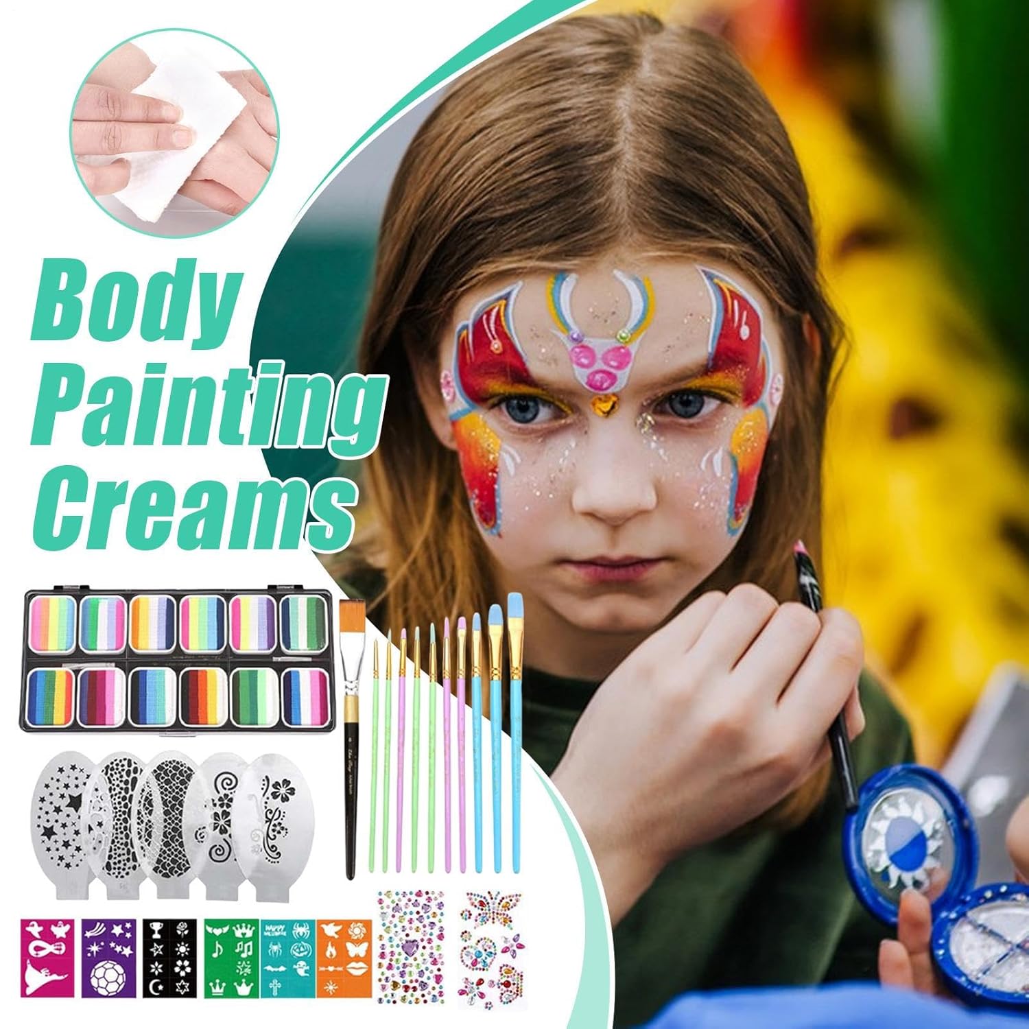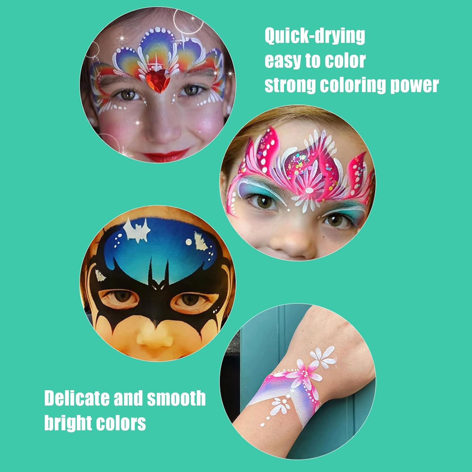 Strumento di progettazione creativa: offre progetti creativi per feste a tema, spettacoli teatrali, Halloween e incontri sociali, flessibili in modo affidabile in una varietà di occasioni di celebrazione e scenari di eventi. Design facile da pulire: la formula speciale per bambini garantisce un'applicazione uniforme, è delicata sulla pelle sensibile e consente un'adeguata pulizia con solo acqua Copertura perfetta: consente effetti di colore intensi con toni brillanti e una forte copertura per l'espressione artistica Set versatile per il trucco: questo kit completo per la pittura del viso contiene pennelli, stencil e strass per una varietà di applicazioni. Il design adatto ai principianti e il pacchetto pronto all'uso semplificano la creazione di design unici durante festival o feste. Colore affidabile: sperimenta la consistenza cremosa e l'elevata spalmabilità con la vernice per il viso idrosolubile. Si flette naturalmente con le espressioni facciali e garantisce una finitura resistente alle crepe per progetti creativi di lunga durata.