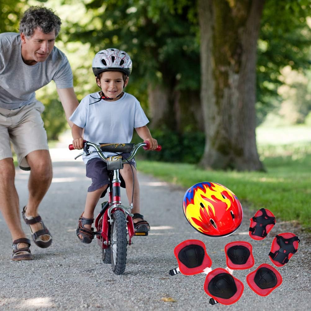 Applicazione: ginocchiere, gomitiere e polsiere offrono ai tuoi bambini una protezione completa durante lo sport. Questo set di protezioni per sport all'aria aperta si adatta a molti diversi sport all'aria aperta, come scooter, skateboard, bicicletta, roller. Materiale confortevole e di alta qualità: realizzato in ABS di alta qualità, spugna traspirante, non solo traspirante, confortevole, ma anche protettivo, per i bambini. Dimensioni: circonferenza della testa: ca. 20,0-21,0 pollici/50-54 cm. Nota: si prega di scegliere in base alla circonferenza della testa. Dimensioni del ginocchio e del gomito: il cinturino regolabile multiplo e la fibbia laterale assicurano una vestibilità adeguata per i tuoi bambini, adatta a varie circonferenze del ginocchio. Casco dai colori vivaci con design a fiamma, migliora il coraggio, l'energia, l'entusiasmo del tuo bambino per lo sport. Set di protezioni per bambini 7 in 1: set di protezioni da 7 pezzi, ti offre una protezione completa e perfetta mentre fai sport.