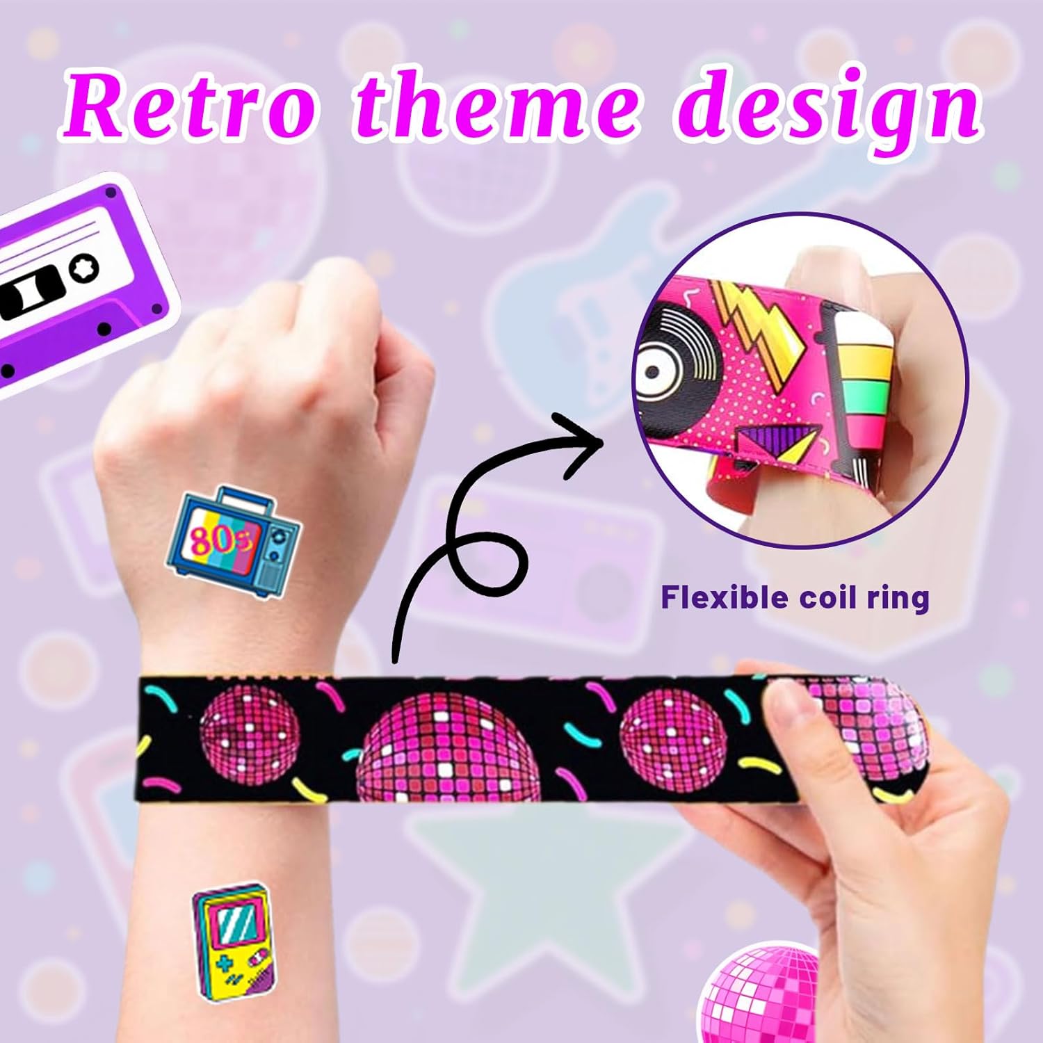 Il set di 74 pezzi include 24 braccialetti a scatto e 50 adesivi colorati, ideale come regalo per le feste di compleanno dei bambini – perfetto per sacchetti regalo, riempimenti per cono scolastico o ricompense in classe con fascino retrò Facili da usare e pronti all'uso: i braccialetti a scatto si adattano automaticamente al polso con un leggero schiocco – ideali per bambini dai 3 anni in su, sicuri e divertenti allo stesso tempo Design retrò colorati in rosa, nero e bianco rendono i braccialetti e gli adesivi davvero accattivanti – ideali per gli amanti del vintage e per chi ama un'atmosfera di festa nostalgica Materiali di alta qualità garantiscono sicurezza e comfort: i braccialetti hanno un nucleo in metallo robusto con rivestimento morbido, gli adesivi sono resistenti alla luce e agli strappi – perfetti per l'uso quotidiano Versatili nell'uso – come riempimento per pinata, premio per lotterie, ricompensa scolastica o contenuto per calendario dell'Avvento: questo set è un compagno pratico per ogni festa, celebrazione o attività scolastica