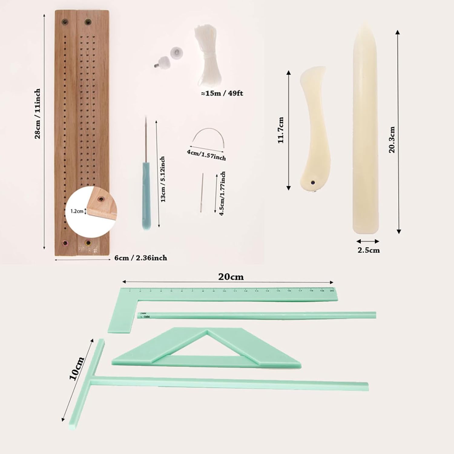 Può essere decorato con carta stampata, nastri, cartone, nastro decorativo, francobolli e altre decorazioni. Scrapbooking può essere fatto su album, quaderni, fogli, carte, cartoline e pianificatori. Adatto per album di ritagli, progetti di rilegatura, album fotografici, copertine di quaderni. Questo set di righelli guida spaziatura ti aiuta nel lavoro di rilegatura, come tagliare gli angoli, posizionare correttamente il cartone, disegnare linee sulle copertine di diversi tipi di album, creare strutture con dorso. Tutti i righelli per rilegatura sono ben confezionati in una custodia, di facile accesso. Righello a forma di L utilizzato per posizionare le coperture e mantenere i margini necessari per fissarle. Il righello a forma di T allinea le copertine e il dorso e segna la distanza corretta per facilitare la piegatura e la forma del tuo album. La guida di separazione con due posizioni di 2 mm e 1,5 mm segna la distanza tra le coperture in modo che possano essere piegate. Strumento angolare quadrato utilizzato per tagliare gli angoli per contrassegnare la carta in eccesso prima del rivestimento. Ogni set include righello a forma di L, righello a forma di T, guida spaziatrice, quadrato per tagliare gli angoli, punteruoli, filo da cucito, 2 elementi di fissaggio, ago curvo, ago da cucito in metallo, base in legno per punzonatura e custodia per il trasporto.
