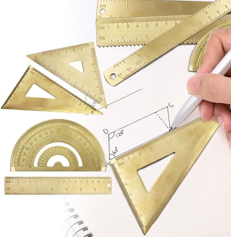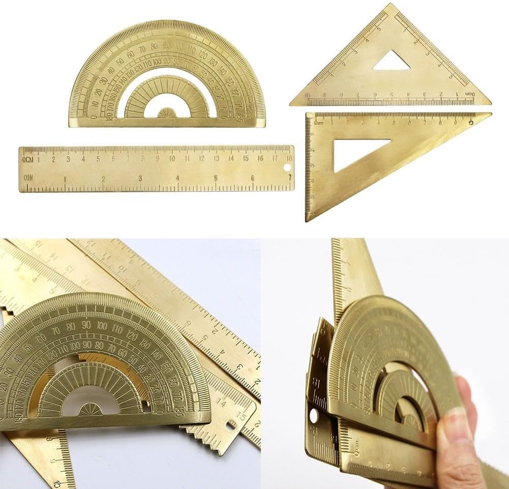 Materiale in ottone: realizzato in robusto ottone massiccio, questo set di righelli è costruito per resistere all'uso quotidiano senza piegarsi o consumarsi nel tempo, perfetto per studenti e professionisti. [Strumenti di disegno accurati] Ogni articolo è realizzato pensando, con superfici lucide che migliorano la precisione per tutte le esigenze di misurazione nel lavoro di ingegneria e progettazione. [Usi multifunzionali] Questo set di cancelleria funge da righello, segnalibro o strumento creativo, per coloro che amano aggiungere stile al proprio spazio di lavoro mantenendo la funzionalità. Progettato per la creatività: il righello triangolare e il goniometro sono dotati di speciali fori di posizionamento per aiutarti a disegnare angoli senza sforzo mentre ispira sforzi artistici. Facile da trasportare: misura 18 cm con varie gamme, questo set compatto è perfetto per l'uso in movimento in ambienti scolastici, uffici o durante progetti artistici.