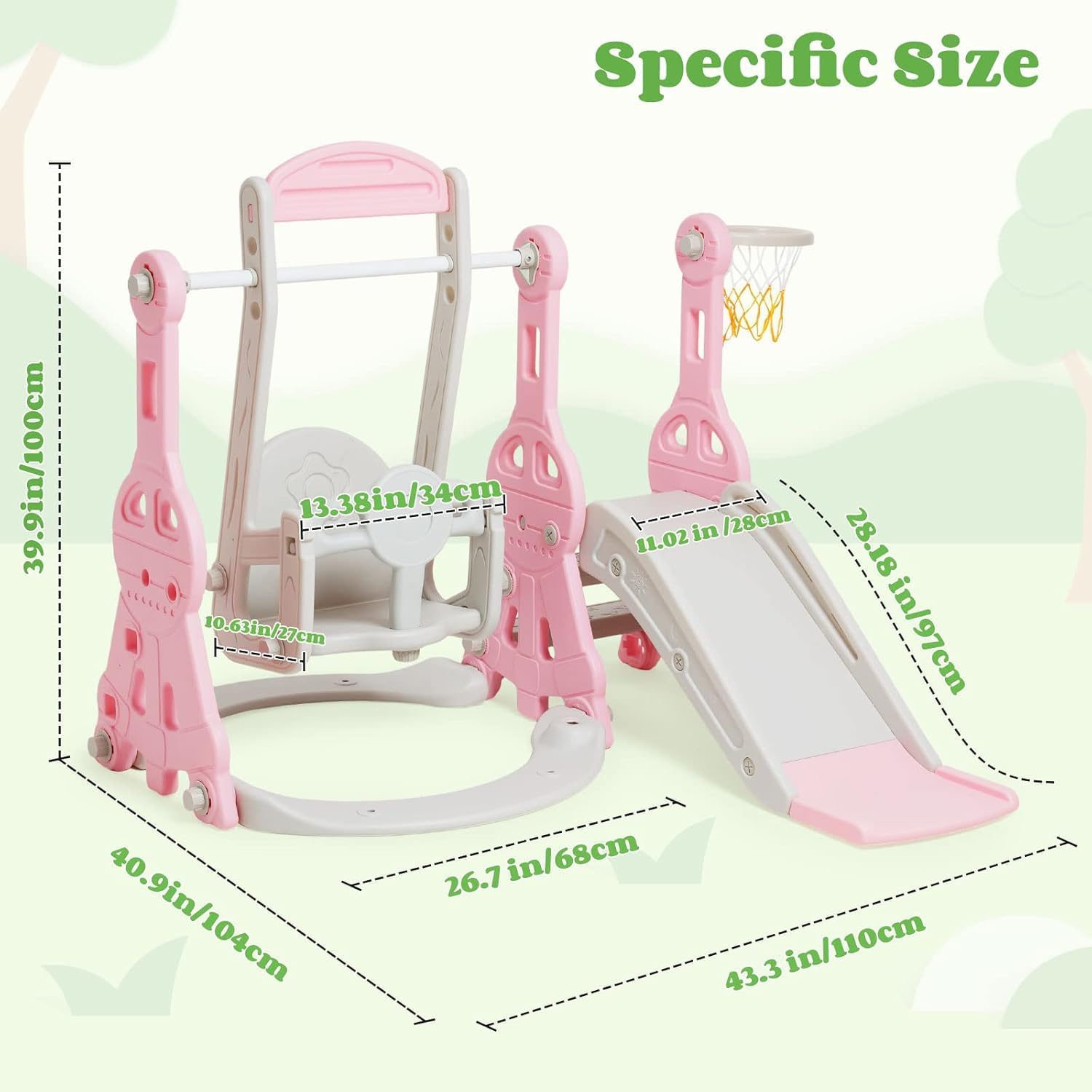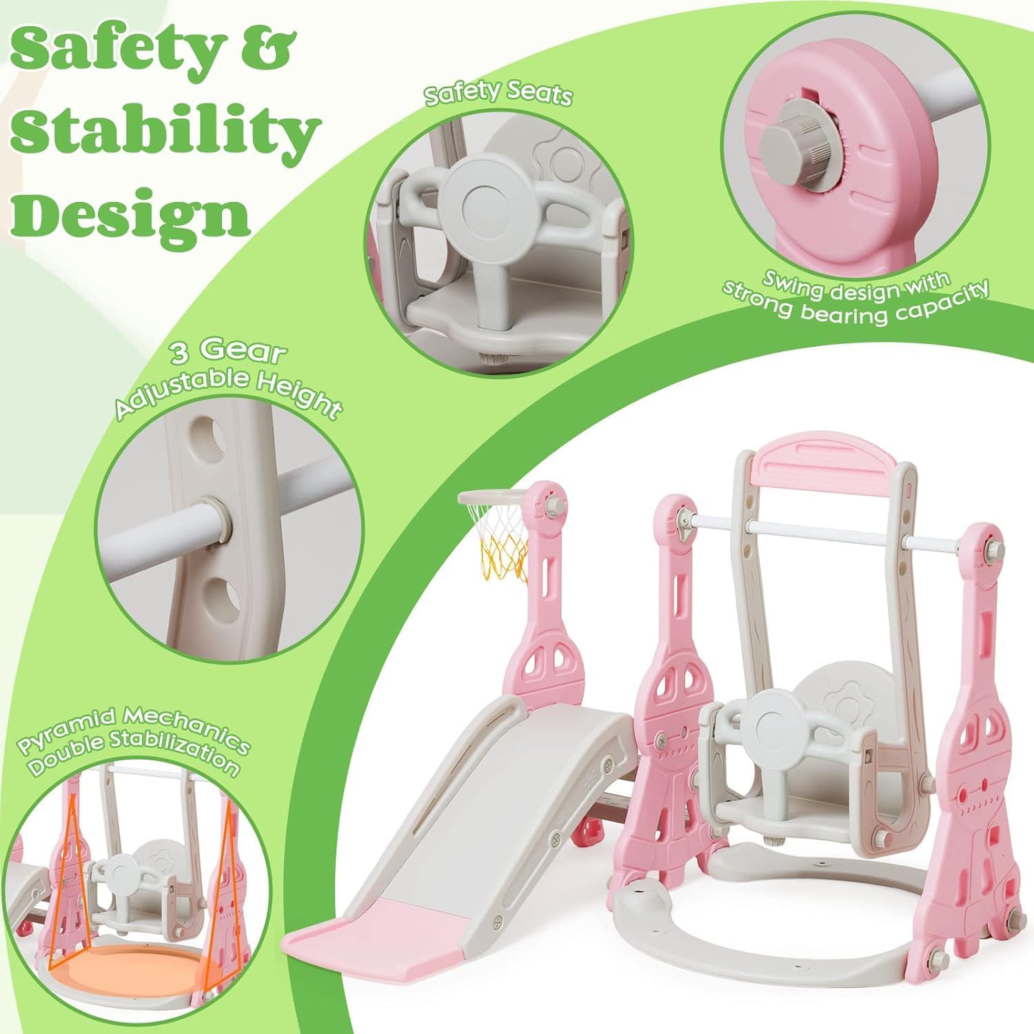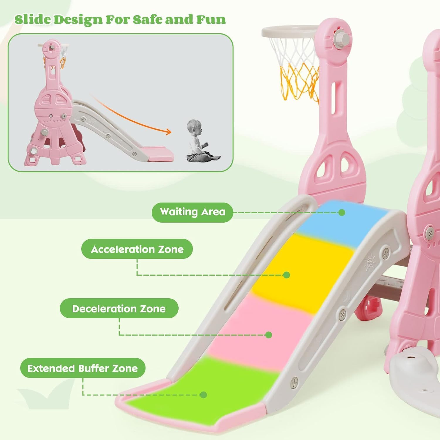 Set 4 in 1 Todder Slide & Swing Set: questo adorabile scivolo viene fornito in una vivace forma di dinosauro. Con braccioli progettati in modo intelligente, i bambini sono più sicuri quando salgono sulle scale prima di iniziare il viaggio di scorrimento. Il nostro set di gioco per bambini offre anche una varietà di attività per i bambini. È dotato di un anello da basket, gioco di arrampicata e dispositivo swing incluso per un maggiore divertimento. 【 Design del pedale anti-skid】 Il pedale ha una struttura antiscivolo che aumenta l'attrito, è esteticamente piacevole e può garantire la sicurezza dei bambini. L'estremità dello scivolo presenta una pendenza scivolosa extra lunga con un buffer che garantisce un'esperienza di scorrimento sicura e controllata. I bambini si fermeranno nell'area buffer invece di scivolare sul pavimento. Scivolo per bambini sicuro e stabile: questo set di scivoli e altalene è realizzato in HDPE di alta qualità + materiali PP, atossico, inodore e uniformemente rinforzato, rigorosamente testato e certificato per garantire stabilità e durata della rutch e dell'altalena. L'altezza dell'altalena può essere regolata per ospitare una gamma più ampia di età, e l'altalena viene fornita con uno schienale e una protezione intermedia, ringhiera protettiva ispessita e un telaio stabile. La distanza tra i pedali di 13 cm offre ai bambini un maggiore senso di sicurezza. Facile da assemblare: nessun attrezzo professionale, basta seguire le istruzioni chiare e precise, collegare ogni parte con viti piccole o grandi, quindi stringere, risparmiando tempo e fatica. Se avete domande durante il montaggio di questa pellicola, vi preghiamo di contattarci e risponderemo immediatamente al vostro messaggio entro 24 ore. Scivolo per bambini per interni ed esterni: utilizzato all'interno o nel cortile, questo set da gioco offre un parco giochi divertente e sicuro per il vostro piccolo. Molteplici possibilità di gioco: swing, scivolo, anello da basket (compreso il basket) per liberare la natura atletica dei bambini, rafforzare il loro entusiasmo per lo sport e godersi un'infanzia felice.