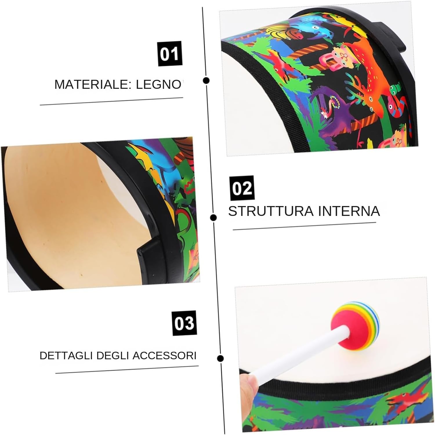 Materiali Durevoli: Costruito con materiali sicuri e atossici per bambini, finitura in legno liscia e assenza di bordi affilati, questo tamburo offre durabilità e affidabilità, consentendo ai più piccoli di esplorare il ritmo e i suoni in un ambiente domestico protetto e stimolante, ideale per lo sviluppo a coordinazione e e capacità auditive Stimola l'Esplorazione Musicale: Il set di batteria per bambini cattura l'attenzione con effetti sonori creativi che migliorano l'udito e la vista, stimolando una curiosità naturale per la musica e il ritmo, ideale per l'interazione nelle fasi 'infanzia Coordinazione Migliorata: Questo tamburo per bambini produce suoni diversi in base alla posizione di percussione, aiutando a sviluppare la coordinazione occhio-mano e la crescita e abilità manuali, creando un ambiente ideale per l'esplorazione sensoriale e il divertimento durante il gioco Chiarezza Musicale Ricca: Il tamburo per bambini genera un chiaro e gradevole, potenziando l'esperienza uditiva di alta qualità e rendendo il gioco musicale più divertente per i bambini mentre esplorano il ritmo Strumento Educativo Colorato: Questo tamburo infantile presenta tonalità brillanti studiate per catturare l'attenzione e ispirare la curiosità, favorendo l'esplorazione durante le attività creative a casa o all'asilo, per lo sviluppo sensoriale