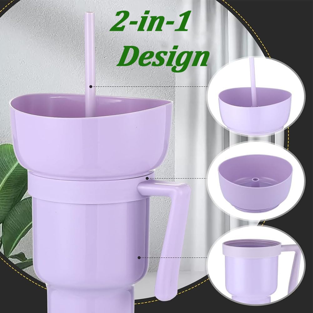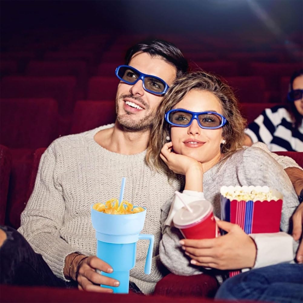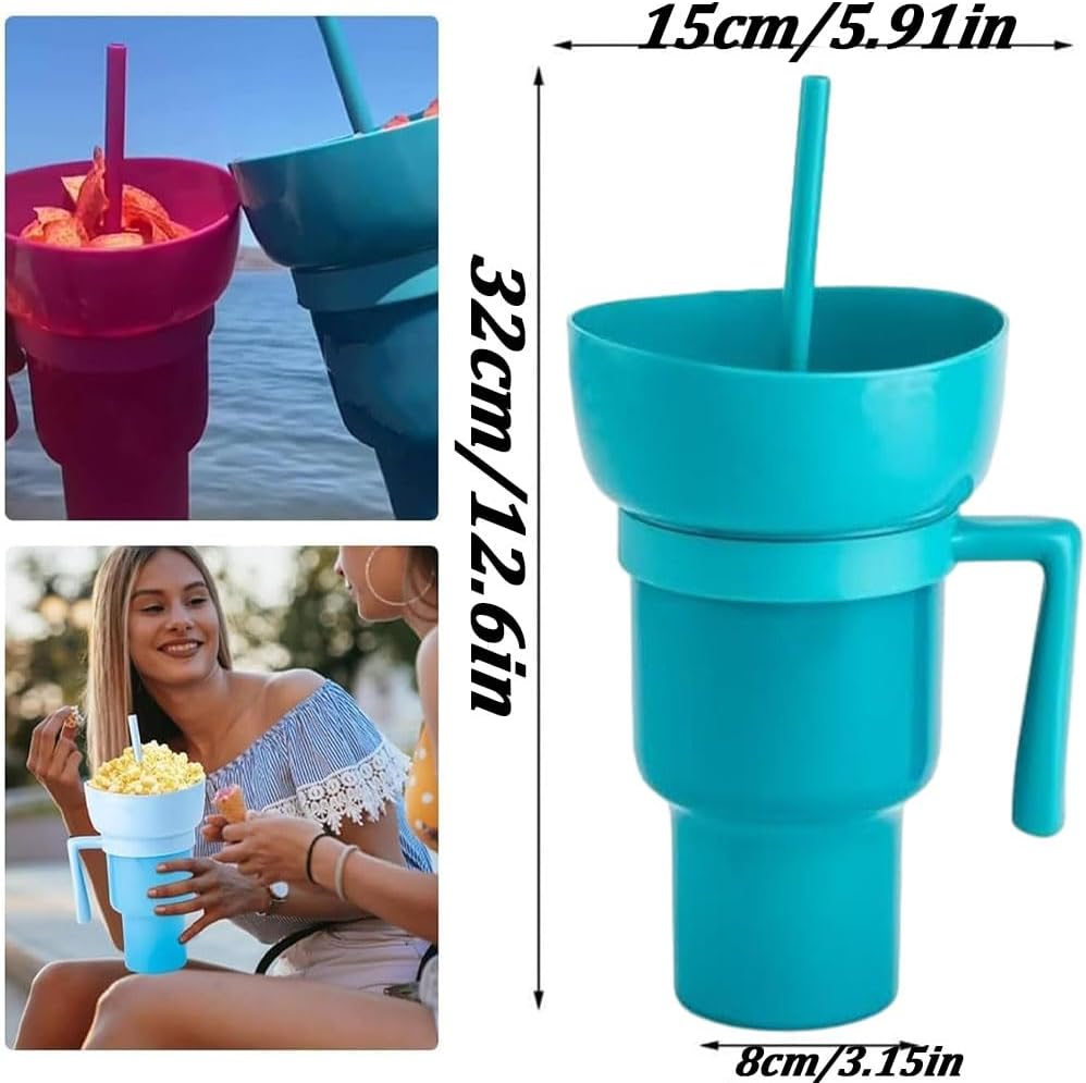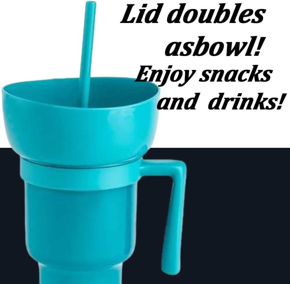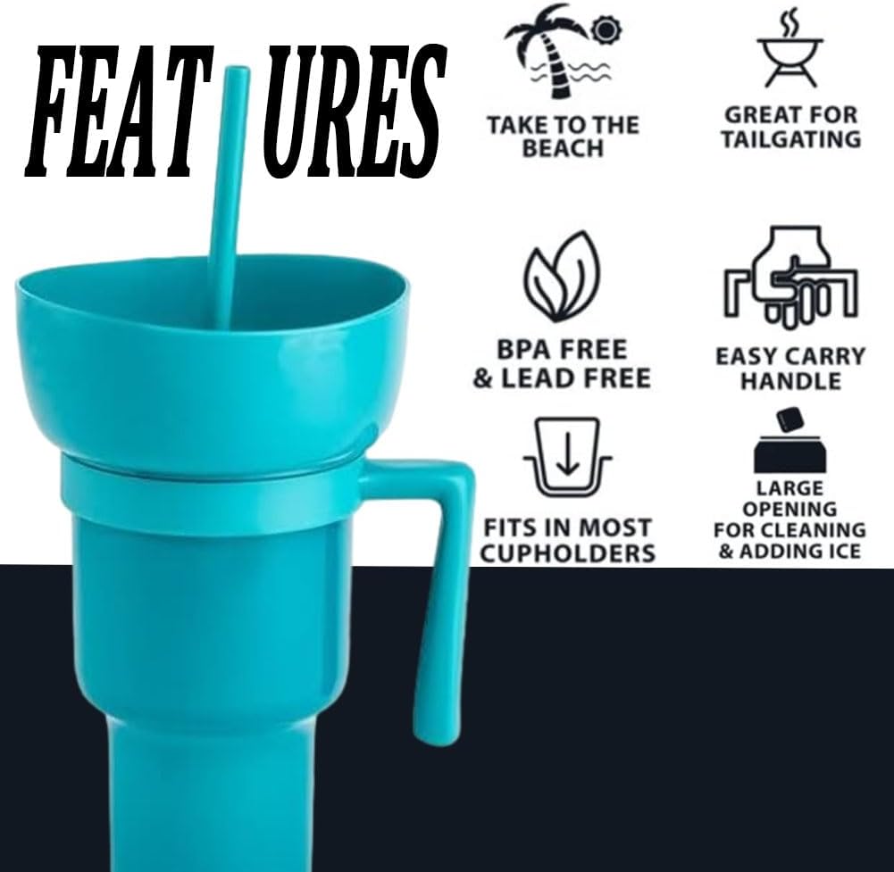Design 2 in 1: una ciotola per snack rimovibile sulla parte superiore del bicchiere da 907,2 g consente di gustare snack (popcorn, patatine, caramelle) e bevande contemporaneamente Coperchio a tenuta stagna: l'innovativo coperchio sigilla saldamente per evitare fuoriuscite, e la cannuccia inclusa consente di sorseggiare facilmente con una sola mano Materiale durevole: realizzato in plastica di alta qualità, robusta, affidabile e a prova di perdite Uso versatile: ideale per serate di cinema, eventi sportivi, viaggi su strada o uso quotidiano. La ciotola per snack si stacca per una facile pulizia e il manico ergonomico garantisce un facile trasporto Grande capacità di 907 ml: abbastanza grande da contenere un ampio volume di bevande, riducendo la necessità di ricariche frequenti