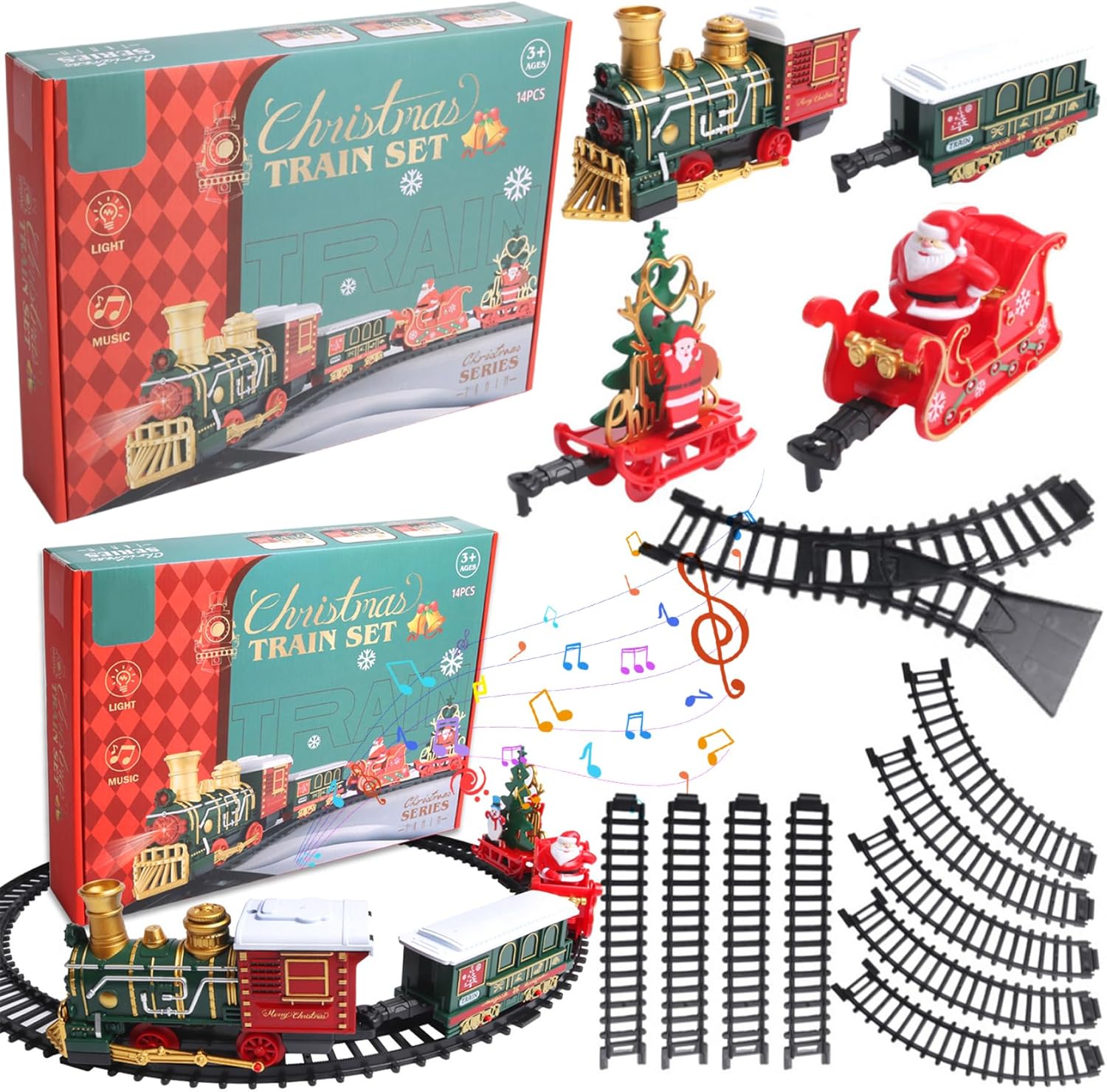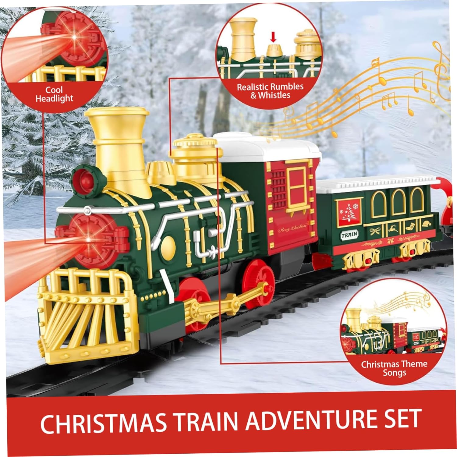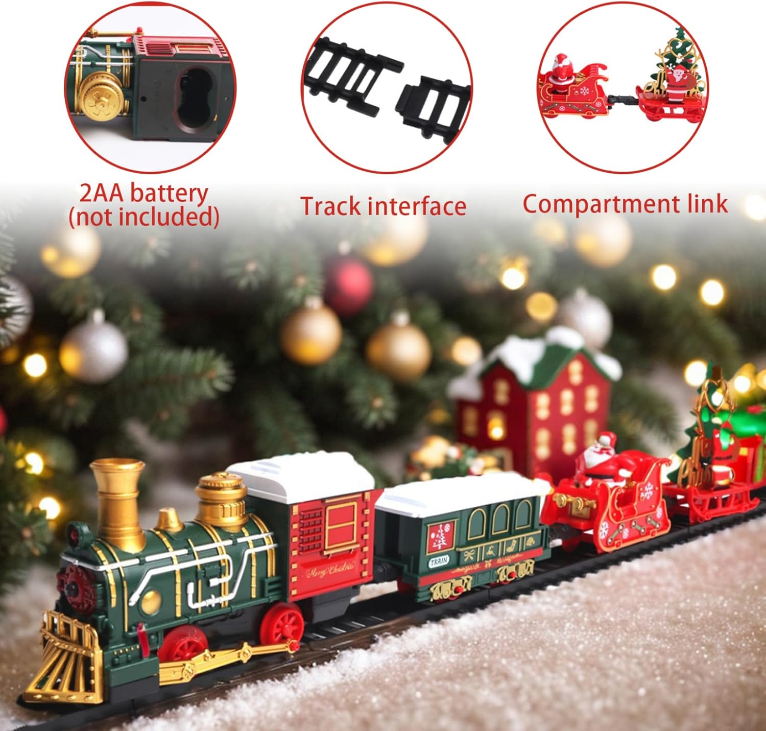 Assemblaggio intuitivo: non sono necessarie istruzioni complesse per godersi la magia del nostro set di treni!.Basta assemblare i binari e fissarli con i fermi inclusi per una configurazione senza soluzione di continuità..Basta premere l'interruttore e l'incanto ha inizio: perfetto per un'esperienza di vacanza senza problemi. Design sicuro: realizzato con materiali plastici di qualità, questo set di trenini natalizi è progettato per durare e longevità, rendendolo adatto alle mani dei più piccoli..Con bordi lisci e arrotondati, questo treno garantisce un'esperienza di gioco sicura, consentendo ai bambini di vivere deliziose avventure senza preoccupazioni. Squisite decorazioni natalizie: trasforma la tua casa in un paese delle meraviglie invernale con il nostro set di trenini natalizi splendidamente decorato..Dotato di carrozze affascinanti e di un faro abbagliante, questo squisito treno crea un'atmosfera magica perfetta per diffondere l'allegria natalizia e creare ricordi festivi. Intrattenimento versatile: che sia annidato sotto l'albero di Natale o sistemato tra i regali delle feste, questo set di treni porta gioia ai bambini dai 3 agli 8 anni e intrattenimento infinito per ogni occasione..Non è solo una decorazione;.è un'attività festosa che aggiunge calore ed eccitazione alla tua casa. Luci e suoni incantevoli: eleva lo spirito natalizio con le luci e la musica integrate del treno, suonando le classiche canzoni di Natale e Capodanno..Basta inserire 2 batterie AA (non incluse) e guardare come questo delizioso treno dà vita alle celebrazioni natalizie con i suoi suoni allegri e l'atmosfera luminosa.