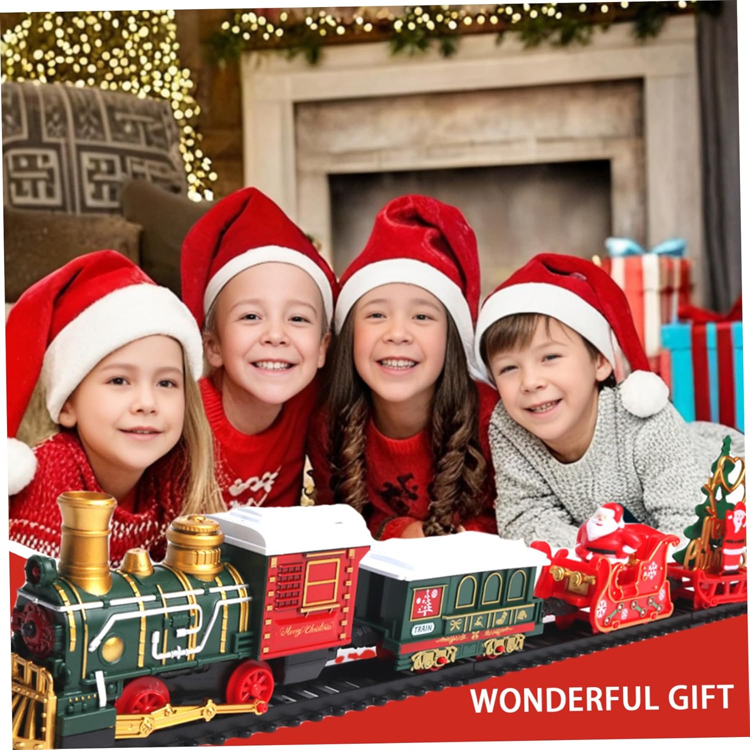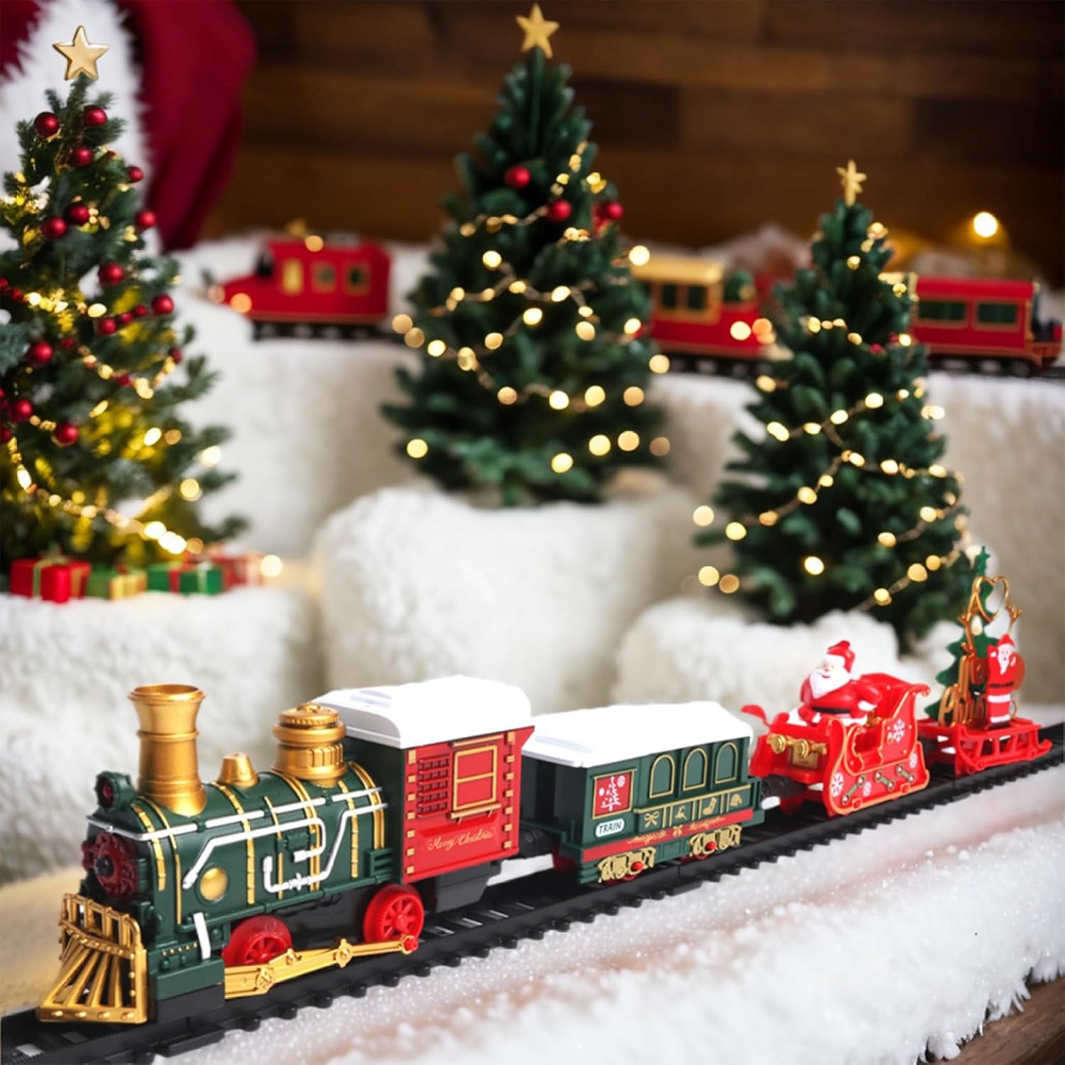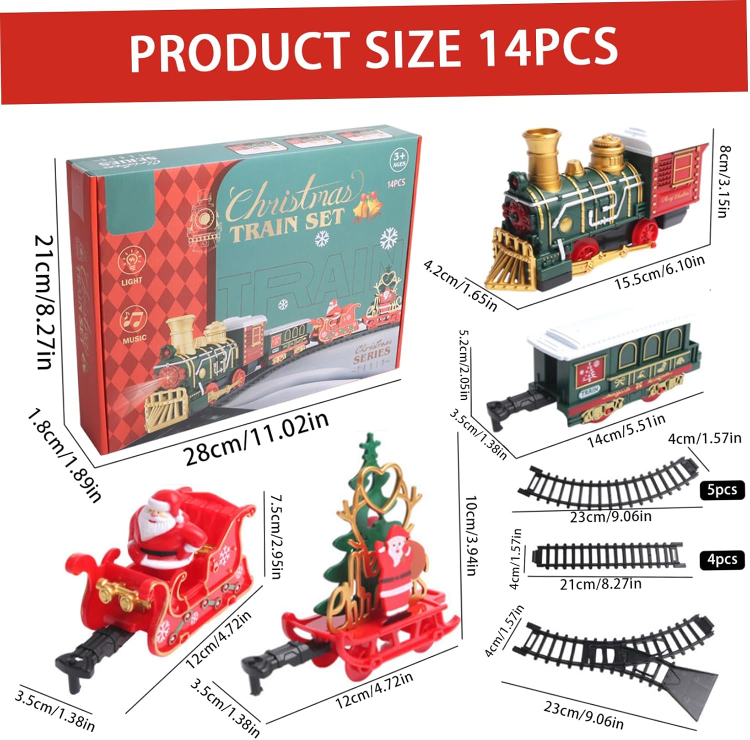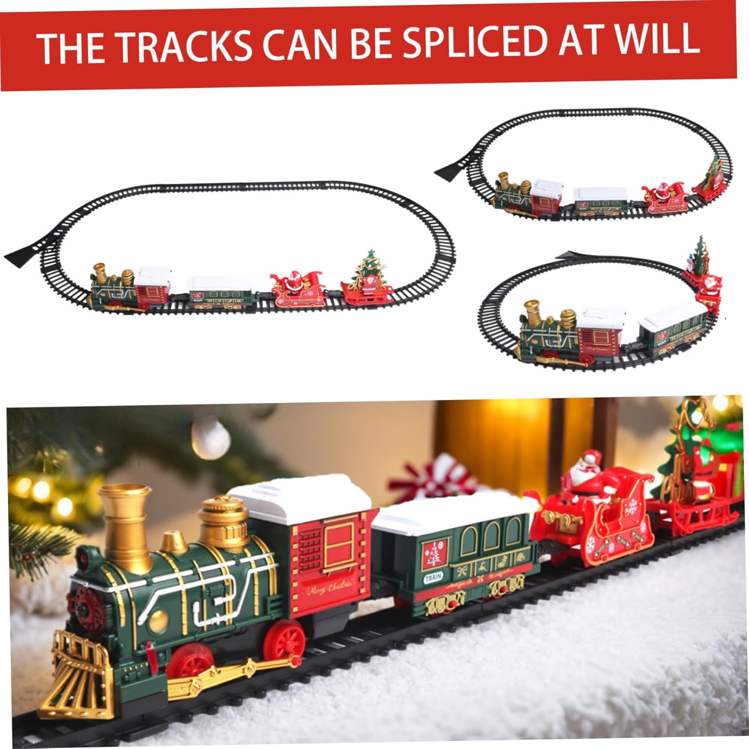Assemblaggio intuitivo: non sono necessarie istruzioni complesse per godersi la magia del nostro set di treni!.Basta assemblare i binari e fissarli con i fermi inclusi per una configurazione senza soluzione di continuità..Basta premere l'interruttore e l'incanto ha inizio: perfetto per un'esperienza di vacanza senza problemi. Design sicuro: realizzato con materiali plastici di qualità, questo set di trenini natalizi è progettato per durare e longevità, rendendolo adatto alle mani dei più piccoli..Con bordi lisci e arrotondati, questo treno garantisce un'esperienza di gioco sicura, consentendo ai bambini di vivere deliziose avventure senza preoccupazioni. Squisite decorazioni natalizie: trasforma la tua casa in un paese delle meraviglie invernale con il nostro set di trenini natalizi splendidamente decorato..Dotato di carrozze affascinanti e di un faro abbagliante, questo squisito treno crea un'atmosfera magica perfetta per diffondere l'allegria natalizia e creare ricordi festivi. Intrattenimento versatile: che sia annidato sotto l'albero di Natale o sistemato tra i regali delle feste, questo set di treni porta gioia ai bambini dai 3 agli 8 anni e intrattenimento infinito per ogni occasione..Non è solo una decorazione;.è un'attività festosa che aggiunge calore ed eccitazione alla tua casa. Luci e suoni incantevoli: eleva lo spirito natalizio con le luci e la musica integrate del treno, suonando le classiche canzoni di Natale e Capodanno..Basta inserire 2 batterie AA (non incluse) e guardare come questo delizioso treno dà vita alle celebrazioni natalizie con i suoi suoni allegri e l'atmosfera luminosa.