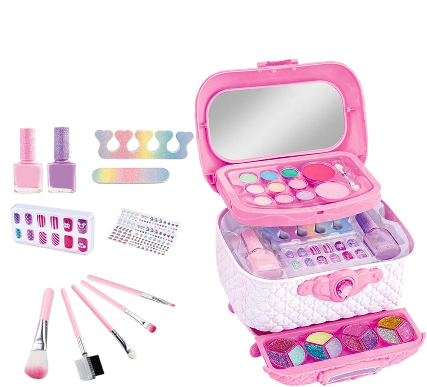 Divertimento che aumenta la fiducia: progettato per le ragazze dai 4 ai 12 anni, questo kit di trucco per bambini offre un'attività emozionante e di rafforzamento della fiducia che combina il miglioramento estetico con la creatività. Con divertenti giochi interattivi, è l'ideale per migliorare le tue abilità divertendoti. Set compatto e portatile: questo set trucco per bambini compatto e portatile è la soluzione di archiviazione ideale, offrendo al tuo bambino una disposizione intelligente e più scomparti per tutti i suoi cosmetici. STRUMENTI DI BELLEZZA COMPLETI: Con una selezione di smalto per unghie, lima per unghie, ombretto, crema per sopracciglia e viso, rossetto in cera per labbra e lucidalabbra, polvere colorata e pennello per il trucco, questo set di trucco per bambini offre un'esperienza di bellezza completa. Materiali sicuri e lavabili: combinando materiali sicuri e lavabili con standard di sicurezza riconosciuti, il nostro set trucco per bambini garantisce un uso delicato sulla pelle dei bambini. Gli ingredienti solubili in acqua lo rendono sicuro per i bambini. Inoltre, è facile da pulire dopo aver giocato, rendendolo un regalo senza preoccupazioni per i genitori. Regalo ideale: questo set di trucchi per bambini stimola la creatività e aumenta la fiducia in se stessi. È un giocattolo emozionante per il gioco di ruolo e promuove divertenti attività genitore-figlio. Il set iniziale ideale è perfetto per spettacoli e feste ed è un ottimo regalo
