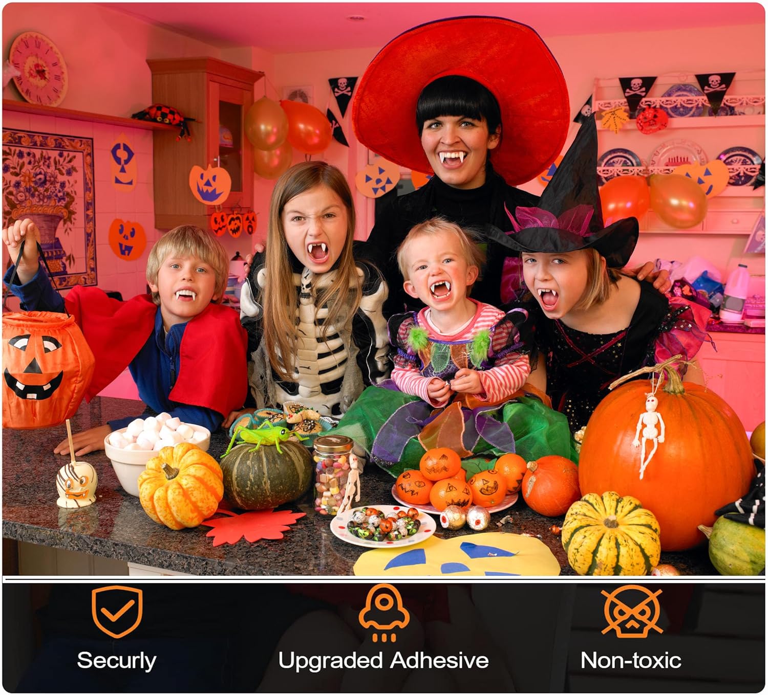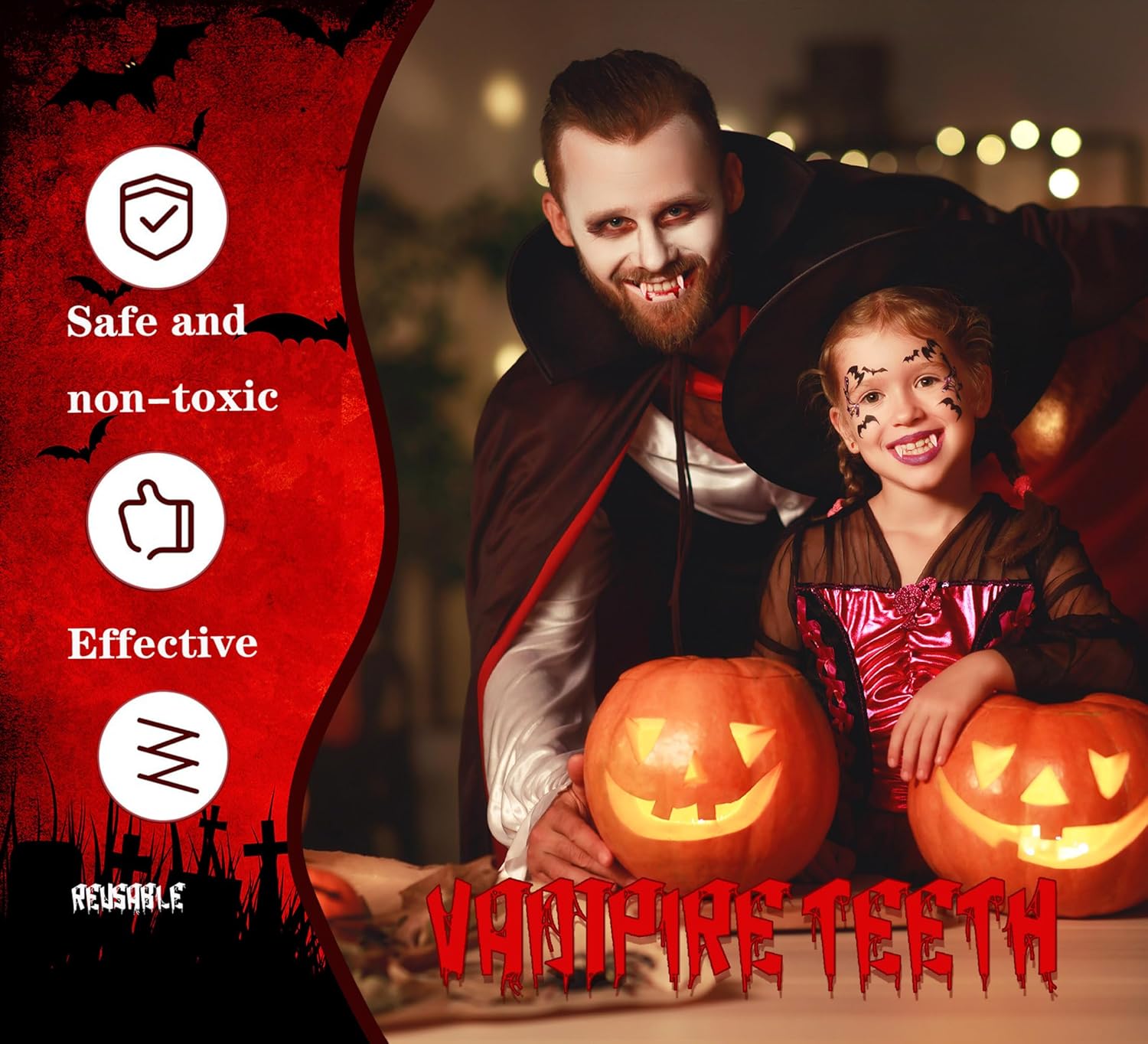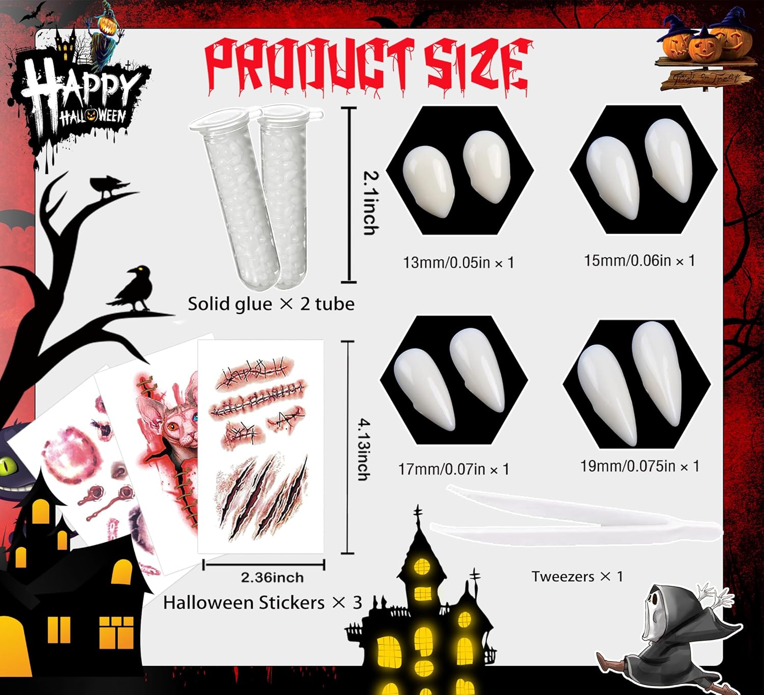 Set completo: il set di 10 zanne da vampiro include 4 denti di diverse dimensioni per garantire una perfetta vestibilità per diverse dimensioni della bocca Qualità professionale: denti da vampiro dall'aspetto realistico realizzati con materiali resistenti per un autentico miglioramento del costume Facile applicazione: viene fornito con 2 tubi di pellet adesivo dentale per un uso sicuro e confortevole durante gli eventi di Halloween Uso versatile: perfetto per feste di Halloween, eventi in costume, spettacoli teatrali, riunioni cosplay e celebrazioni a tema horror Opzioni di formato: quattro diverse misure disponibili nel set per ospitare adulti e bambini più grandi per la migliore vestibilità possibile