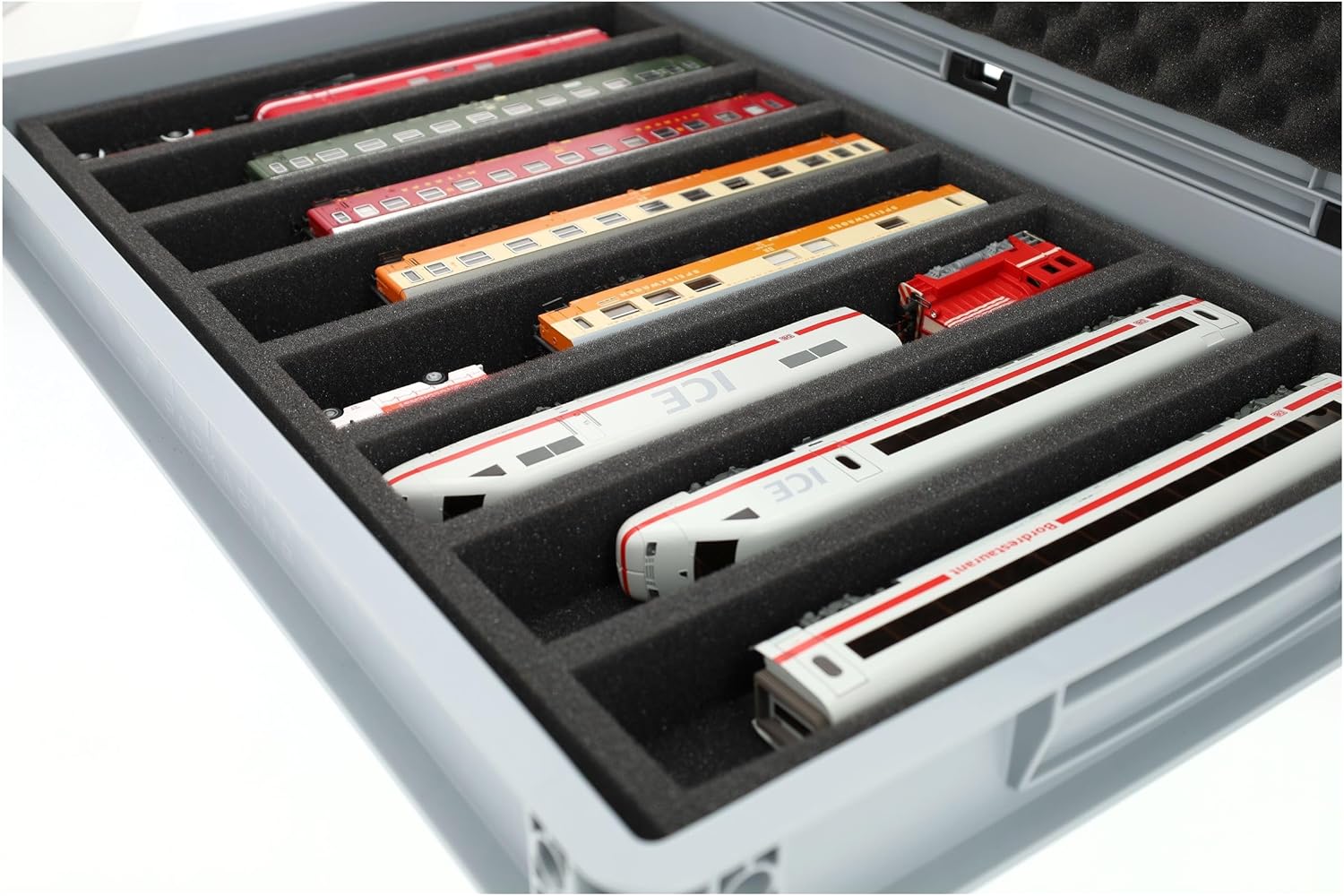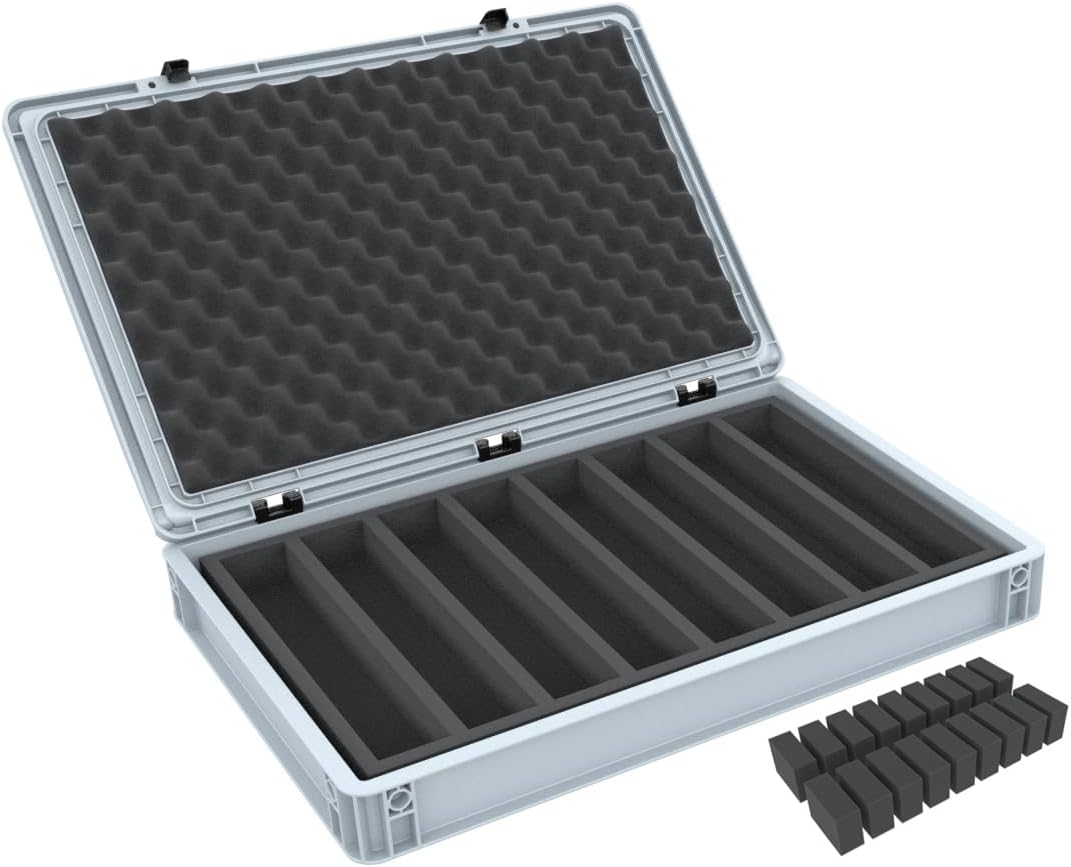 Set Feldherr Eurobox 60 x 40 cm per modellismo ferroviario - Scartamento H0 - Contenitore Euro compatto e robusto con inserto in schiuma con 8 scomparti per lo stoccaggio orizzontale di locomotive, vagoni e veicoli Dimensioni del compartimento: ca. 320 x 55 x 40 mm - Inserto su misura per una tenuta sicura - possibili diversi modelli per scomparto Set composto da: Eurobox robusto e impilabile con coperchio incernierato, inserto in schiuma, base livellabile e copertura del coperchio - Ammortizzazione ottimale e protezione completa durante il trasporto Pratica maneggevolezza grazie alle dimensioni compatte (dimensioni esterne della scatola: 600 mm x 400 mm x 90 mm) e impugnature incassate - può essere impilato per risparmiare spazio sullo scaffale o utilizzato in viaggio 👉 Tutte le figure e i componenti del gioco mostrati servono per confrontare le dimensioni e non sono inclusi. I modelli stampati in 3D possono presentare piccole imperfezioni. Le immagini del prodotto mostrano le possibili applicazioni, i colori possono variare.