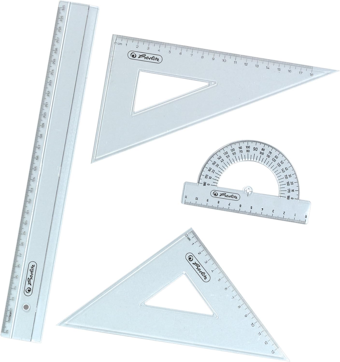 1 goniometro 2 triangoli (acuti e isosceli) 1 righello 30 cm in plastica trasparente 5 conf.
