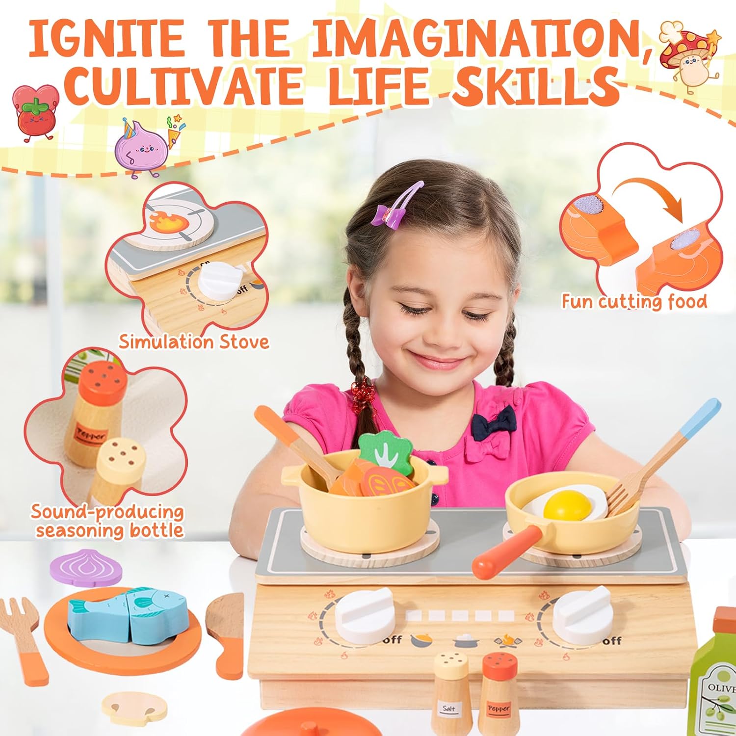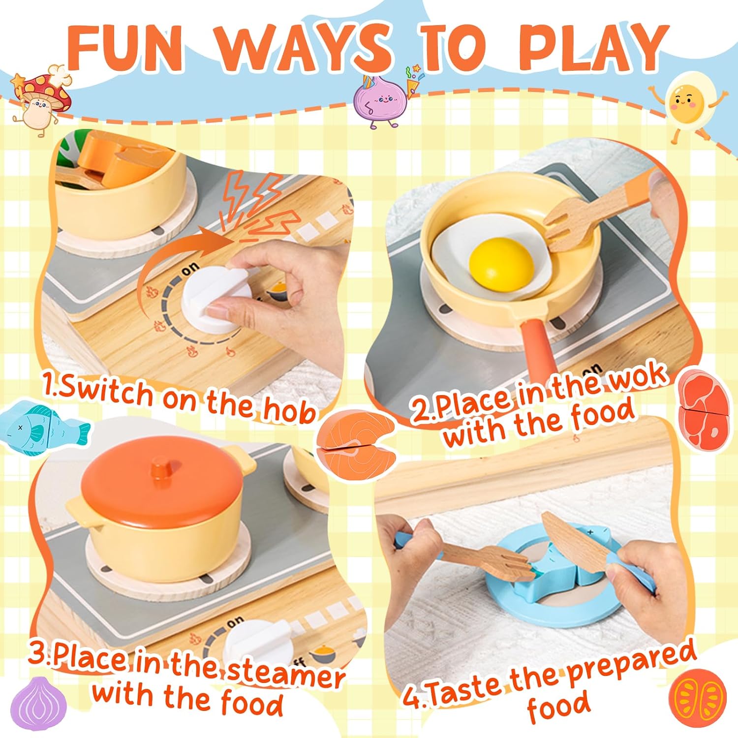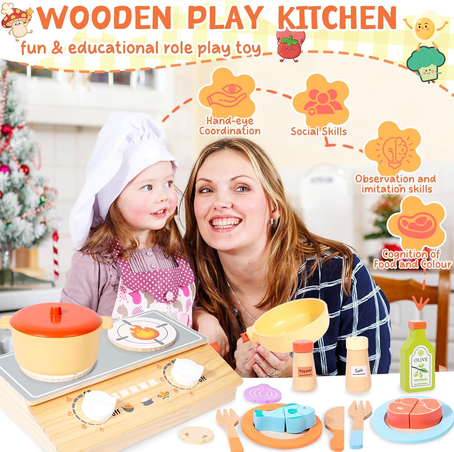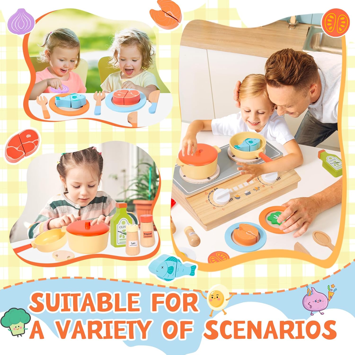 ACCESSORI DA CUCINA COMPLETI PER BAMBINI - Il set da cucina per bambini include utensili da cucina,una spatola realistica,piatti da portata,accessori per verdure e carne e una finta stufa a legna con manopola girevole.Questo set completo di accessori soddisfa le esigenze culinarie dei bambini,elimina la necessità di giocare da soli e stimola il loro senso di scoperta MATERIALI SICURI E DI ALTA QUALITÀ - Realizzati in legno massello naturale,gli accessori da cucina in legno per bambini sono inodori e presentano una superficie calda e liscia.I bordi sono accuratamente lucidati per evitare sbavature.Questo rende i componenti resistenti e anti-caduta,garantendo un gioco sicuro per i bambini durante tutta la loro crescita CREA LA TUA CUCINA - La stufa a legna è progettata perfettamente per l'altezza dei bambini,consentendo loro di disporre gli accessori a proprio piacimento e simulare la cottura/frittura.Crea facilmente il tuo "angolo cottura",stimola il senso di appartenenza e la creatività e immergiti nel piacere di cucinare INTERAZIONE FAMILIARE E GIOCO DI RUOLO - I genitori possono "cucinare" con i propri figli come clienti o assistenti.Questa esperienza interattiva favorisce il legame genitore-figlio e sviluppa le capacità pratiche e la consapevolezza sociale dei bambini.Il fornello funge sia da giocattolo che da contenitore.Gli accessori possono essere riposti comodamente e facilmente all'interno,rendendo il gioco divertente e pratico IL REGALO PERFETTO PER I BAMBINI - Confezionato in una graziosa e colorata scatola,perfetta per compleanni e festività.Il giocattolo è accattivante,divertente e tiene i bambini lontani dai dispositivi elettronici.È un regalo premuroso che esprime i tuoi pensieri ed è uno dei preferiti dai bambini