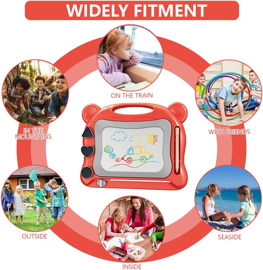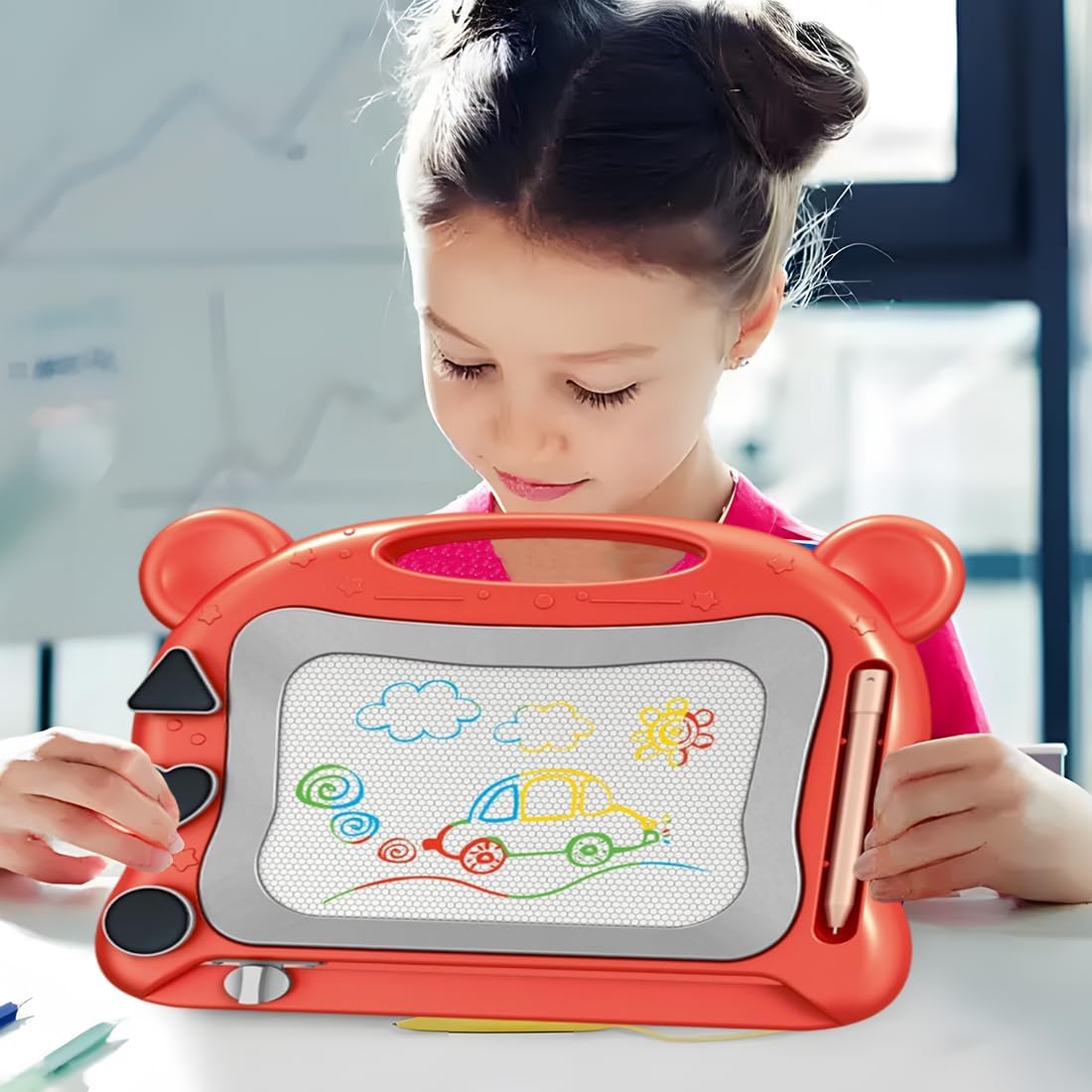 Esperienza creativa: Stimola la fantasia e le capacità di disegno del tuo bambino con questa lavagna magica, ideale per bambini dai 3 anni in su. Perfetta per sviluppare la creatività in modo giocoso e creare le prime opere d'arte Quattro zone colorate: La lavagna magnetica per bambini offre aree in blu, rosso, giallo e verde per favorire il riconoscimento dei colori e rendere il disegno ancora più divertente. Uno strumento ideale per l'espressione creativa Apprendimento giocoso: Con 3 timbri tematici (cuore, cerchio, triangolo), questa lavagnetta magica aiuta i bambini dai 2 anni a sviluppare la motricità fine e le abilità di composizione in modo divertente Perfetta per viaggiare: Grazie al design compatto e leggero, questa lavagna cancellabile bambini è il compagno ideale per viaggi, tragitti in auto o momenti di attesa. Apprendimento e divertimento ovunque e in qualsiasi momento Sicura e resistente: Realizzata con materiali privi di BPA e dotata di protezioni, questa lavagnetta magnetica bambini garantisce un'esperienza di gioco sicura e durevole per i piccoli artisti