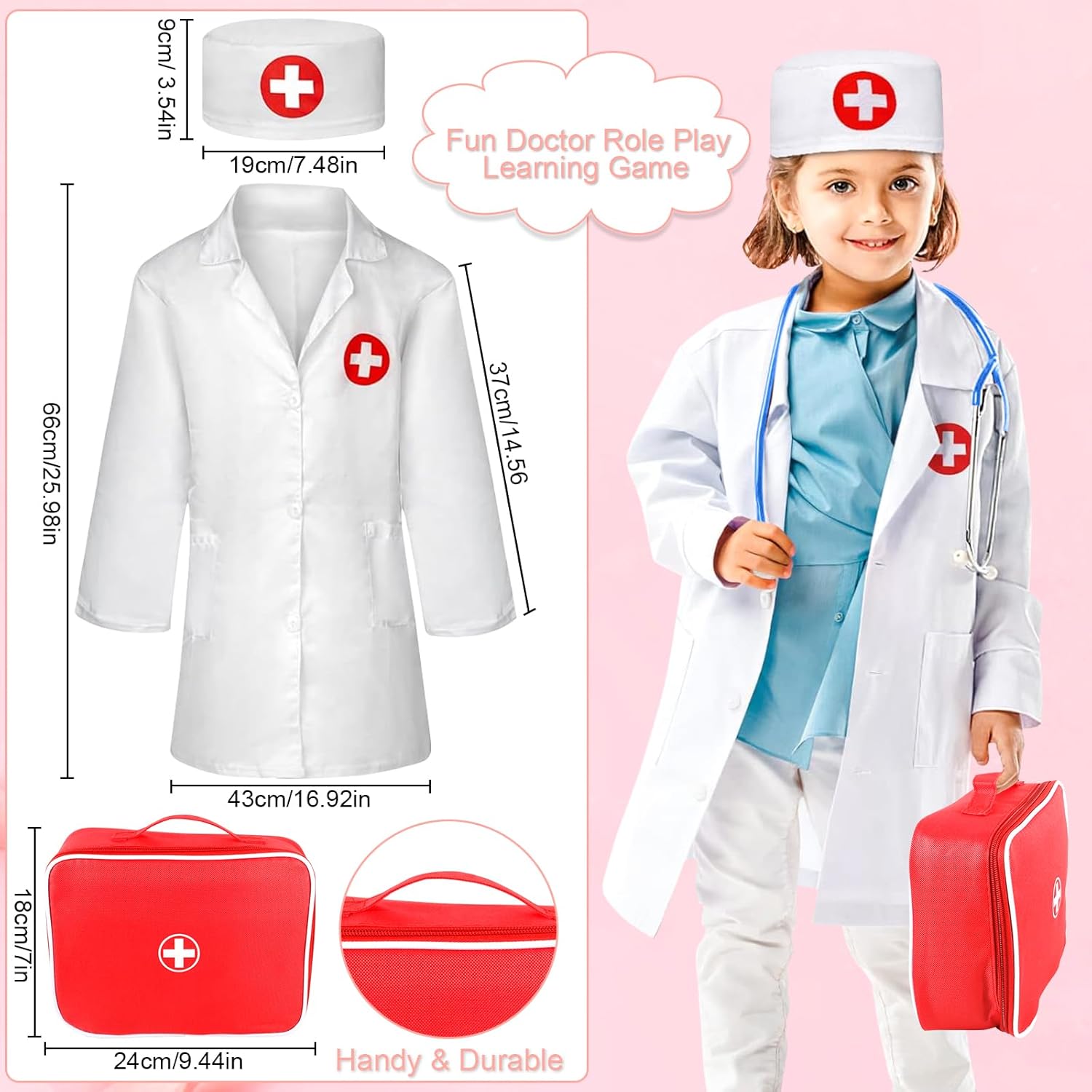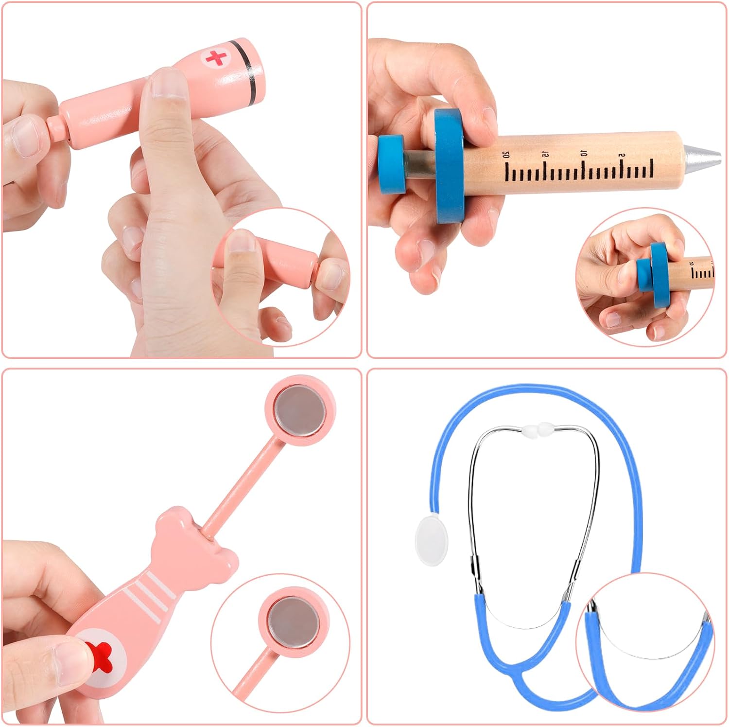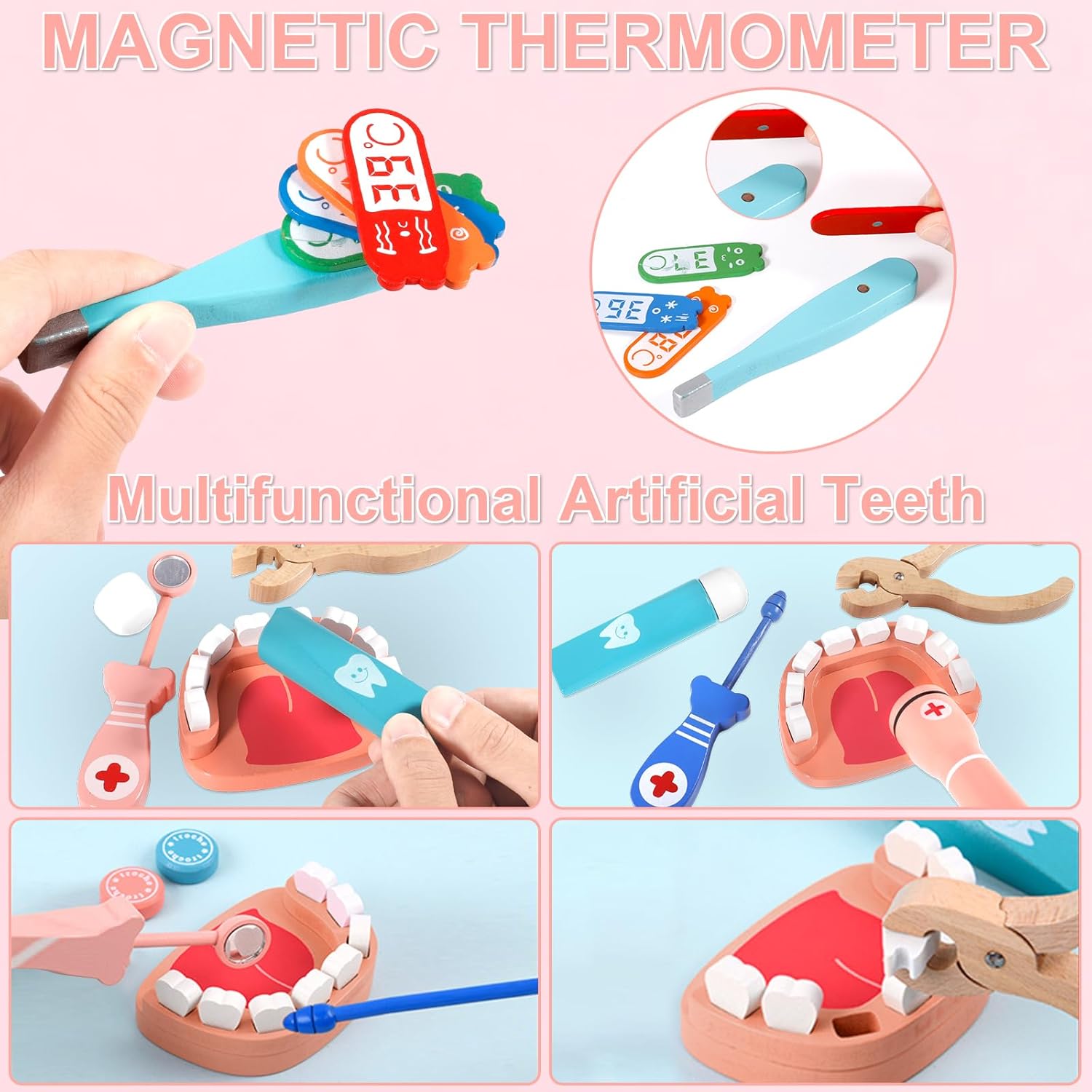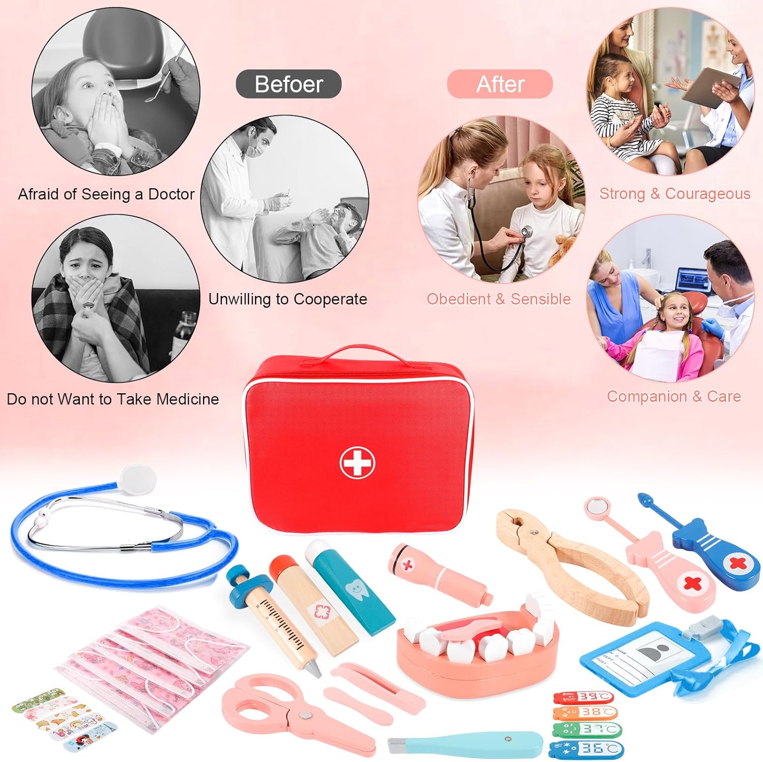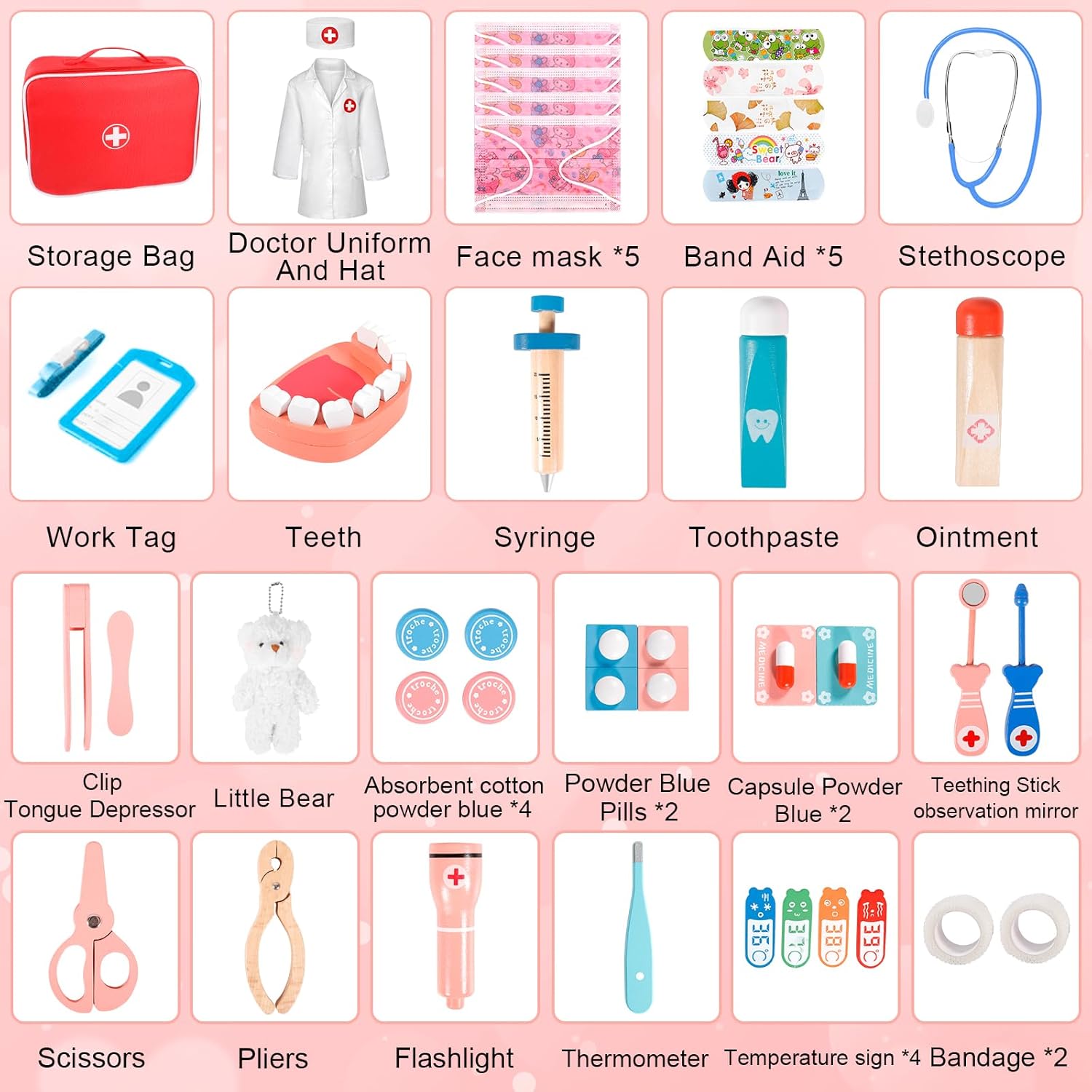 🧰 【42 Pcs Set di Giocattoli da Dottore per Bambini 】: Questo set da dottore per bambini include: Doctor Box, 5 maschere, 5 bende, 2 capsule, 2 pillole, stetoscopio, permesso di lavoro, denti, siringa, dentifricio, medicina per ferite, torcia elettrica, pinzette, rosa abbassalingua, pupazzo orso, specchio di osservazione, bastoncino molare, termometro, 4 taglieri per la misurazione della temperatura, 4 cotone assorbente simulato, 2 bende, berretto medico, camice medico ecc. 💊 【Materiale Sicuro ed Ecologico】: Realizzato in legno vergine e plastica sicuri e di alta qualità, robusto e durevole, con una superficie liscia e senza sbavature. Non farà male alle mani dei bambini. Vernice a base d'acqua, odore non tossico, non irritante, non facile da sbiadire. Sicuro al 100% per i bambini. 🩹【Giocattoli di Ruolo Educativi】: Un set completo di accessori per giocattoli medici può educare i bambini sulle forniture mediche, aiutarli a familiarizzare con l'uso degli strumenti medici e a superare la loro paura interiore dell'ignoto. Aiuta i bambini ad acquisire fiducia e a diventare più coraggiosi e forti! Continua a crescere divertendoti. 🩺 【Facile da Trasportare e Riporre】: Dotato di una borsa in tessuto medico di alta qualità e resistente, che può contenere tutti gli accessori per giocattoli medici e impedire ai bambini di perdere oggetti. Può essere portato ovunque e puoi goderti divertenti momenti di gioco con gli amici, lasciare che i bambini imparino a condividere e comunicare e migliorare il rapporto tra amici. 🎁 【Regalo Perfetto per Bambini dai 3 ai 10 Anni】: Che si tratti di Natale, compleanno, festa, festa dei bambini e qualsiasi altra festività, questo set di meravigliosi giochi da dottore è un regalo perfetto per i bambini 3 4 5 6 8 9 10 . È anche un buon gioco genitore-figlio, che può coltivare la relazione con i bambini e aiutare i bambini a esplorare cose sconosciute.