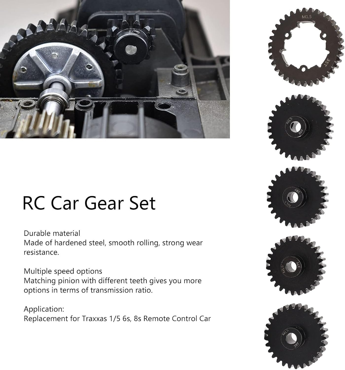 【Compatibilità versatile】 Questo set di ingranaggi premium sostituisce direttamente i tuoi veicoli telecomandati in scala 1/5 6S e 8S. Assicurati un aggiornamento e mantieni le prestazioni che ti aspetti dalla tua amata auto RC 【Uso versatile】 Include un ingranaggio cilindrico a 35 denti, insieme a una selezione di quattro pignoni (27T, 28T, 29T, 30T), tutti lavorati con precisione secondo le specifiche di 1,5 moduli. Inoltre, riceverai una chiave dedicata, tre viti e quattro viti di fissaggio per l'installazione 【Facile da usare】 Il rapporto di trasmissione è la chiave per sbloccare il vero potenziale della tua auto RC. Questo kit versatile ti consente di ottimizzare le caratteristiche di velocità e accelerazione in base alle tue preferenze personali. Mescola e abbina i pignoni per trovare l'equilibrio perfetto per la tua guida 【Materiale di alta qualità】 Realizzati in acciaio temprato ad alta resistenza, questi ingranaggi sono costruiti per resistere ai rigori della guida fuoristrada ad alte prestazioni. L'attenzione ai dettagli e alla produzione garantisce una trasmissione affidabile della potenza e una durata eccezionalmente lunga 【Design unico】 La perfetta continuità è garantita grazie alla resistenza all'usura e alla struttura robusta del set di ingranaggi. Puoi fidarti di questi componenti per offrire prestazioni costanti e affidabili, chilometro dopo chilometro, per il tuo veicolo RC