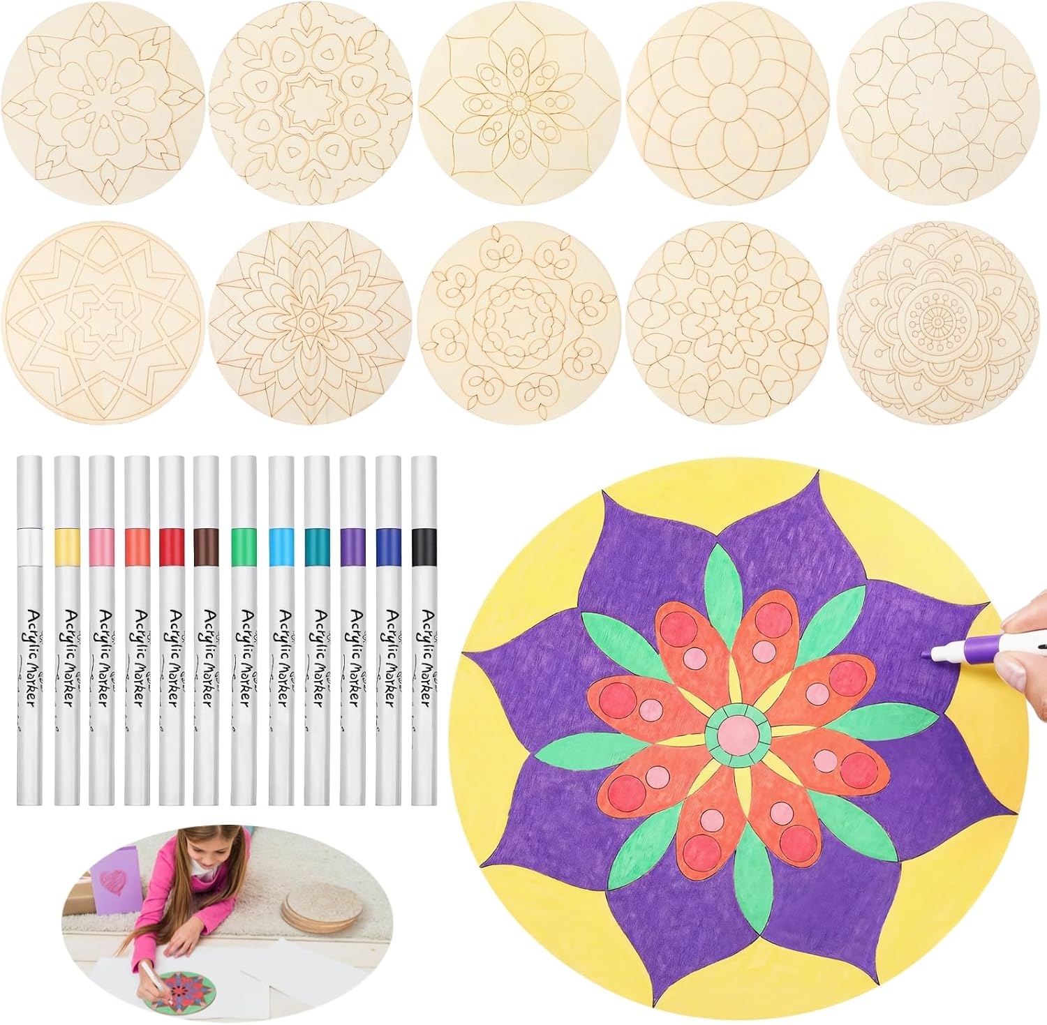 Pacchetto fai da te completo: il set include dieci mandala in legno e dodici pennarelli diversi; una soluzione completa per creare da solo o con i tuoi cari Progetti di mandala personalizzati: usa fette di legno vuote e pennarelli vivaci per dare vita a visioni di mandala uniche; per ricordi o esposizioni premurosi Fette di legno di alta qualità: superfici in legno lisce con dettagli pretagliati; mantiene l'inchiostro uniforme; ideale per pezzi finiti per accentuare qualsiasi stanza Molteplici usi creativi: per decorazioni personalizzate a matrimoni o a casa; progetta pezzi straordinari per riflettere qualsiasi celebrazione o spazio Adatto a tutti i livelli di abilità: ideale per famiglie o singoli individui; offre un'edizione artistica rilassante e pratica per tutte le età