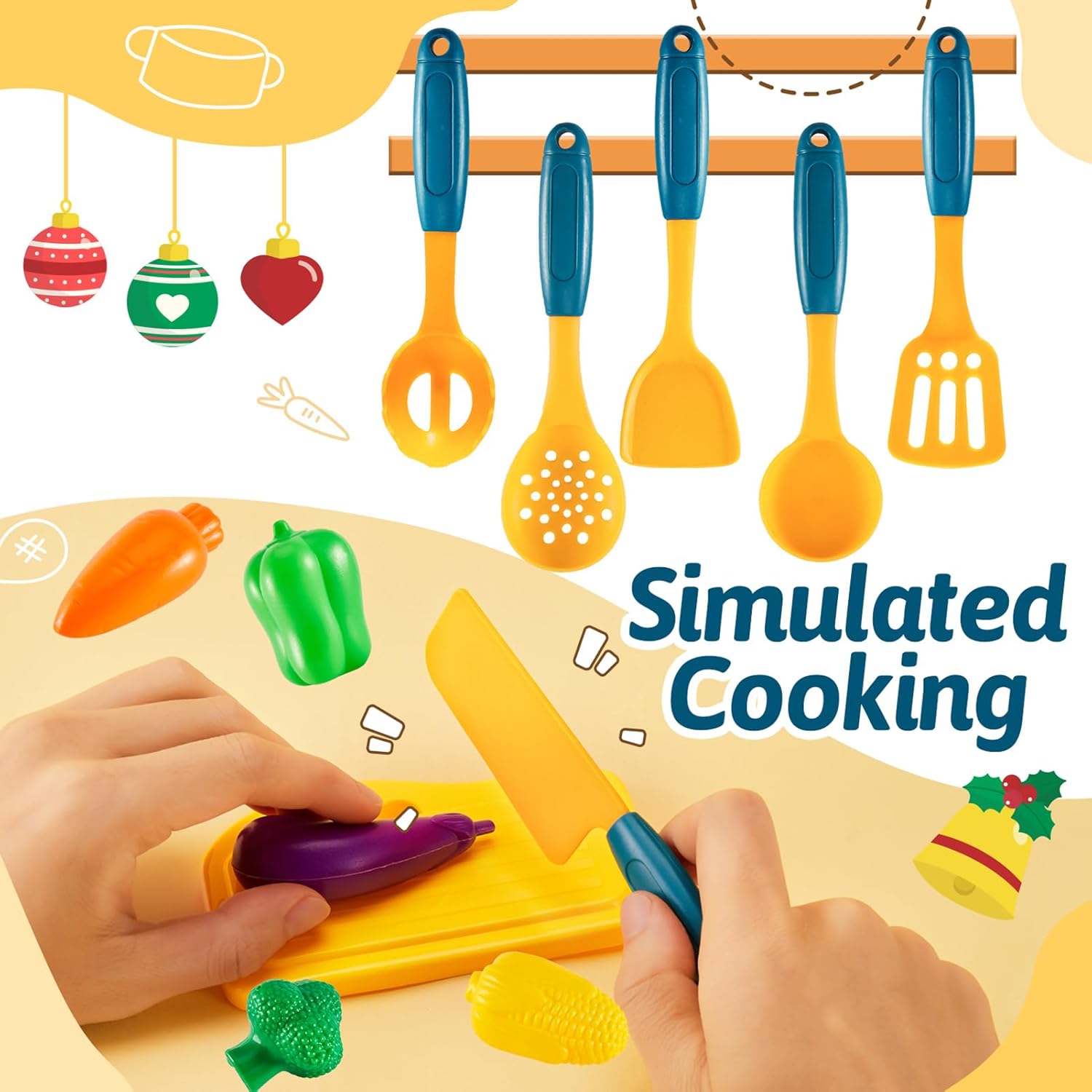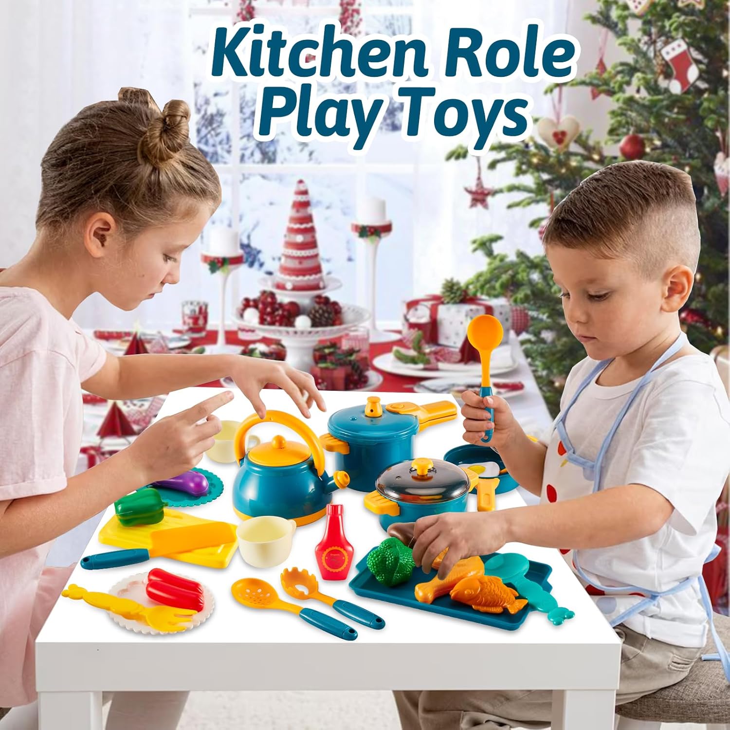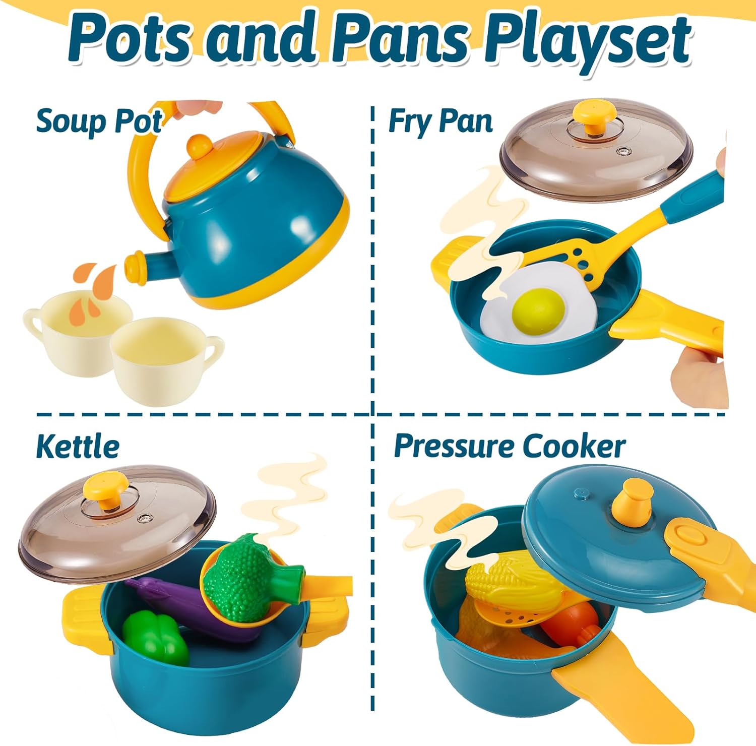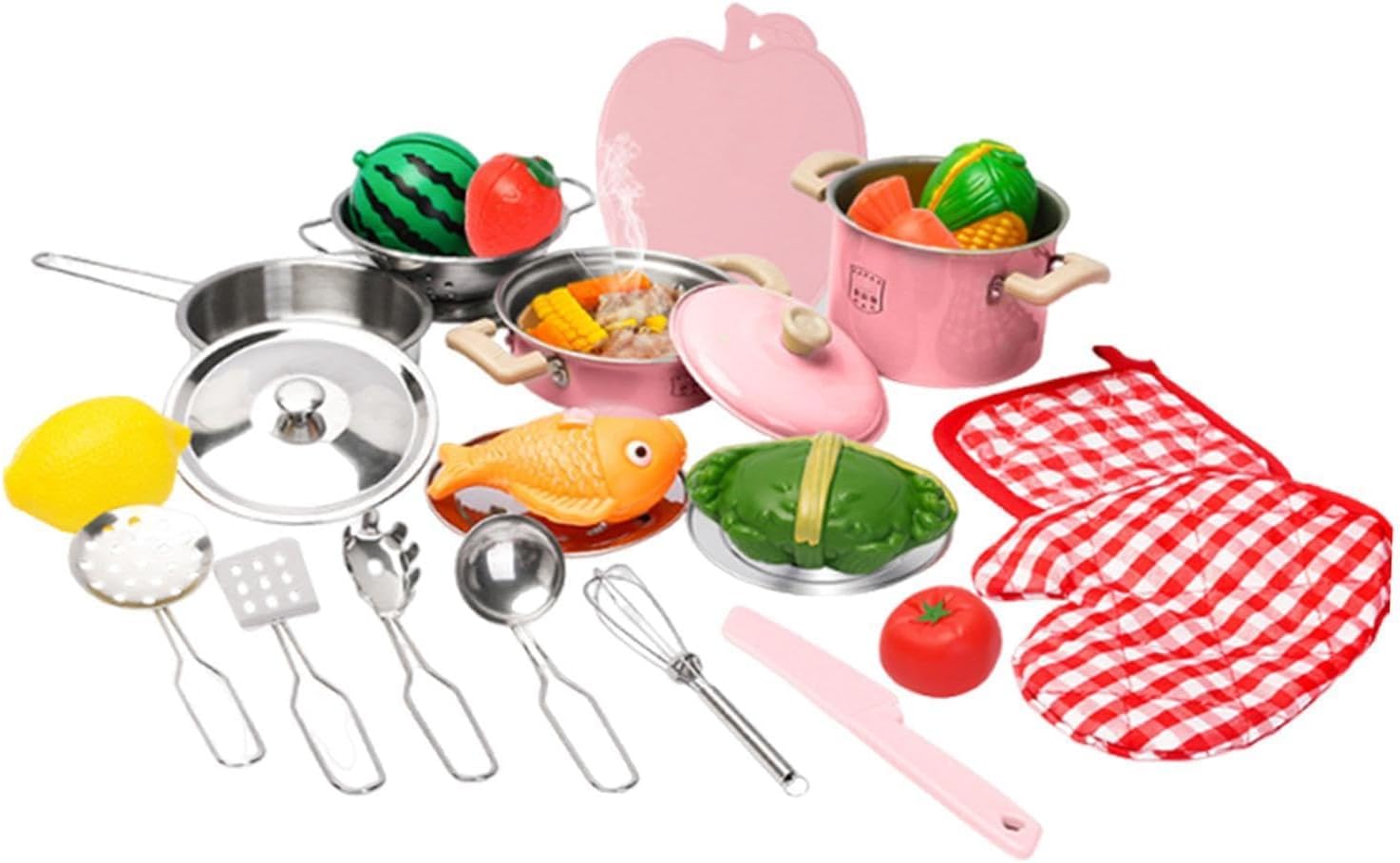 Utensili Cucina Bambini. Un ideal primo cucina giocattolo per bambini. I bambini possono imparare le conoscenze culinarie attraverso questo set di giochi cucina bambini e portare loro una vera esperienza di cucina. Set Pentole Bambini Giocattolo. 29 Pezzi accessori cucina bambini include pentola, padella, pentola a pressione, bollitore, tagliere, coltello, forchetta, cucchiaio. La dimensione del pentole è adatta ai bambini da afferrare. Cibo Giocattoli. Compresi accessori alimenti giocattolo realistici come hot dog e pesce. Colori vivaci e bordi lisci proteggono le manine dei bambini. Giochi di Ruolo. I bambini possono aprire il coperchio e mettere vari ingredienti nella pentola per fingere di cucinare. Dai pieno gioco all'immaginazione e alla creatività dei bambini. Idee Regalo per Bambini. Il playset della cucina per bambini è un regalo di Compleanno per i bambini di età superiore ai 3 anni.