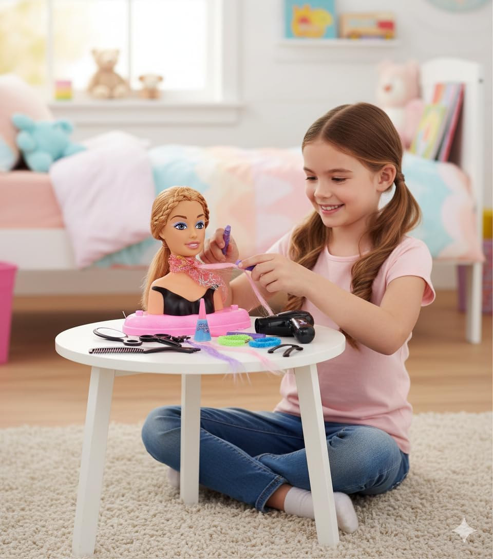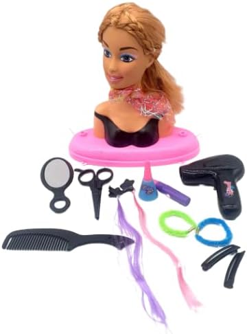 Dai alla tua bambina la possibilità di cimentarsi nell'acconciatura e nella bellezza con una modella da parrucchiere. Il kit viene fornito con una testa di manichino e accessori per capelli, come fermagli e lacci. È adatto alle ragazze dai 3 ai 12 anni, a cui piace giocare con i capelli e il trucco. Il set comprende: Testina da 21 cm - 1 asciugacapelli - 1 pettine - 1 specchio - 1 paio di forbici - 2 elastici per capelli - 2 fermagli per capelli - 2 extension per capelli colorate - 1 rossetto - 1 mascara Nota: solo una fornitura casuale Ideale per regali di compleanno, Natale