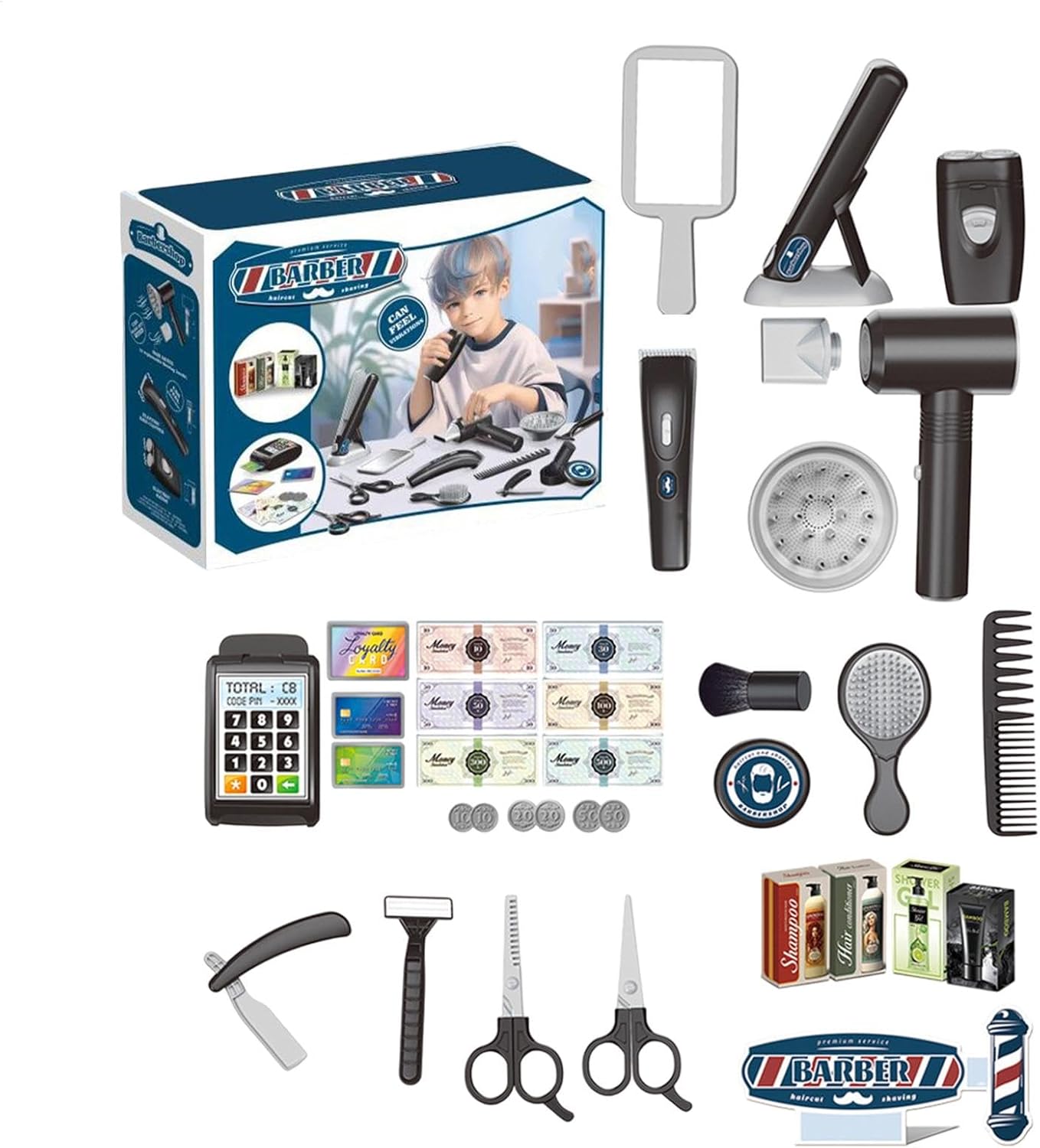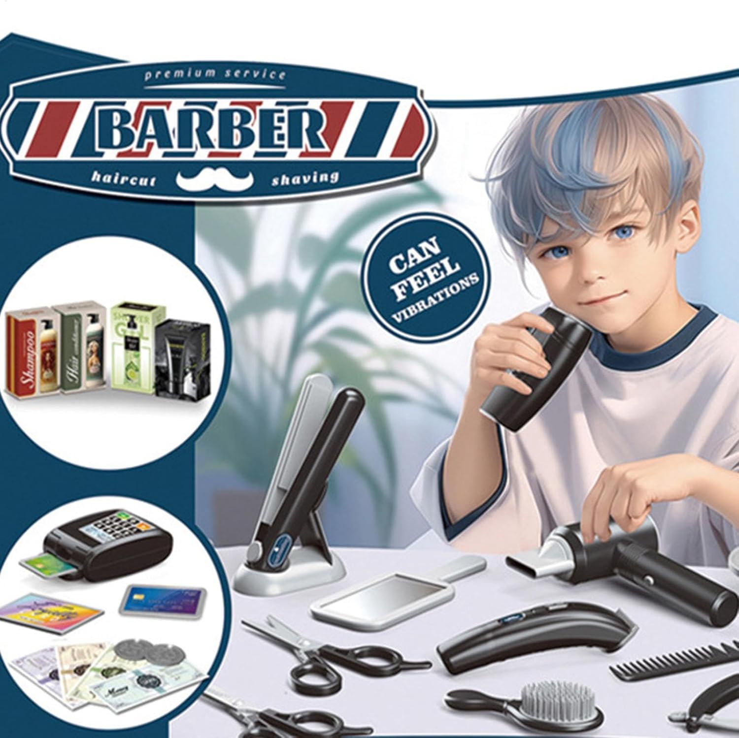 Set da gioco creativo: per aspiranti giovani stilisti, questo set da gioco di ruolo viene fornito con una varietà di strumenti, tra cui specchio, forbici liscianti, rasoio e altro ancora, che lo rendono ideale sia per ragazzi che per ragazze realistici: il nostro set da parrucchiere per stilista include un asciugacapelli con 2 diverse testine di ricambio per l'asciugatura, un rasoio elettrico e spintore da barbiere che vibra quando attivato. Con un contenitore dal design aperto e realistici per parrucchieri, i bambini possono facilmente imitare l'acconciatura degli adulti e liberare la loro creatività Sicuro da giocare: realizzato con materiali sicuri e senza spigoli vivi, il nostro set di giochi di ruolo per parrucchiere è per i bambini. Lascia che si godano ore di gioco fantasioso in modo sicuro e robusto. Adoreranno fingere di essere un parrucchiere con questo set Migliora le capacità di sviluppo: il nostro set di giochi di ruolo per parrucchiere stilista è un giocattolo educativo che migliora la creatività, l'immaginazione, la coordinazione occhio-mano e il pensiero critico mentre insegna l'uso sicuro degli strumenti. Costituisce una base per lo sviluppo delle competenze indispensabili in modo divertente e piacevole Regalo creativo: stimola l'immaginazione di tuo figlio con questo set di giochi di ruolo da parrucchiere, un regalo per compleanni, Natale o qualsiasi occasione, ideale per un ragazzo o una ragazza che ama fingere