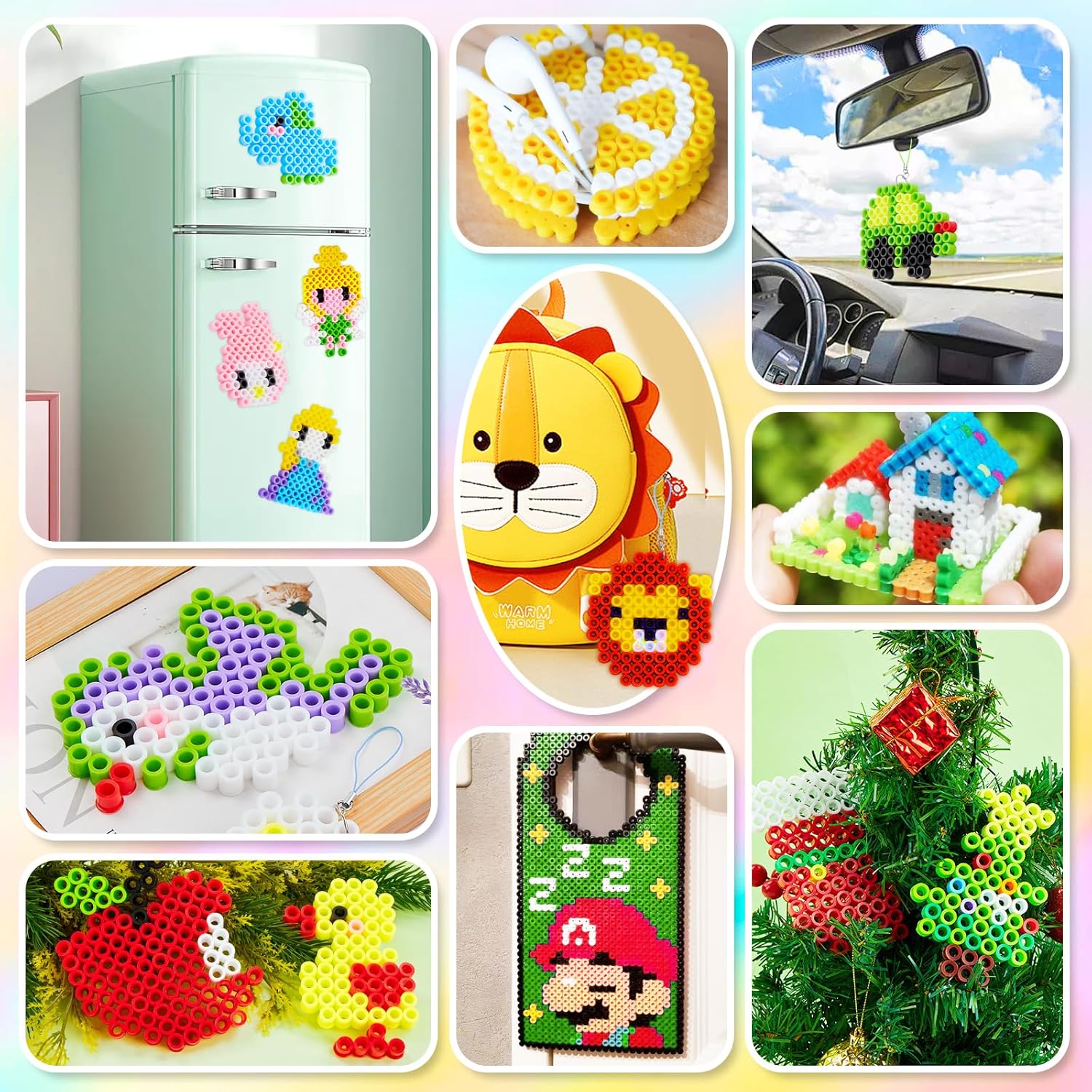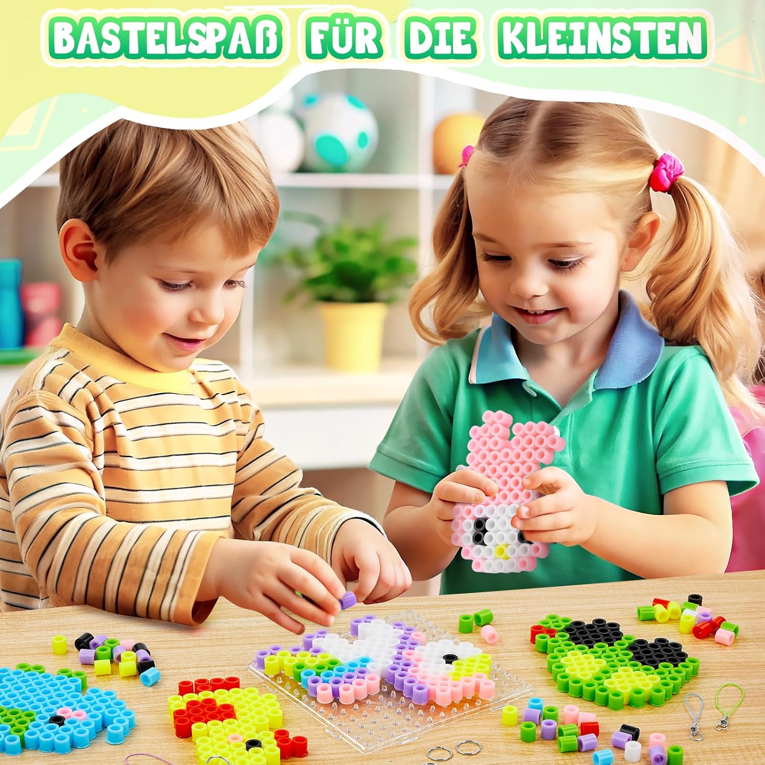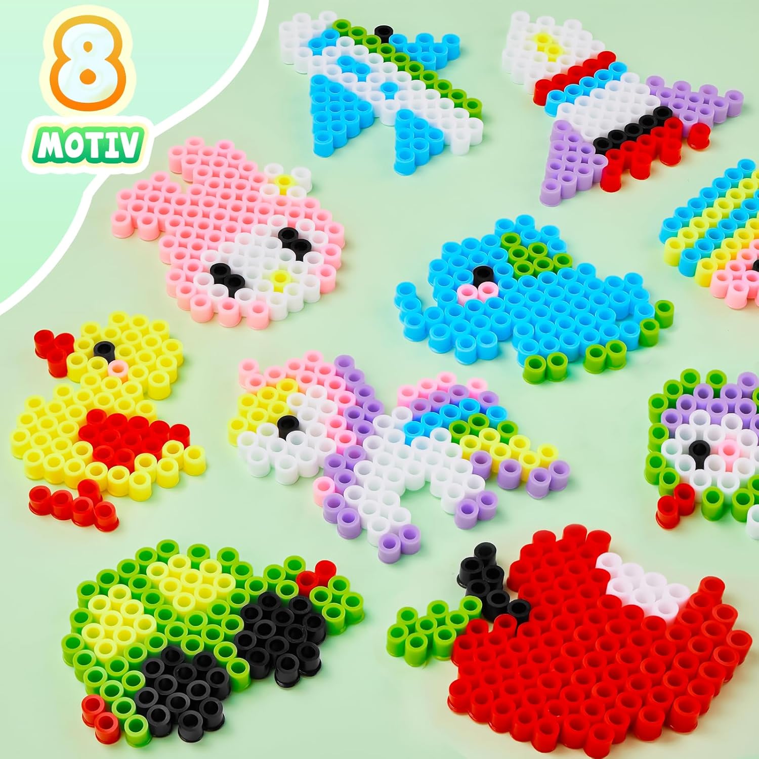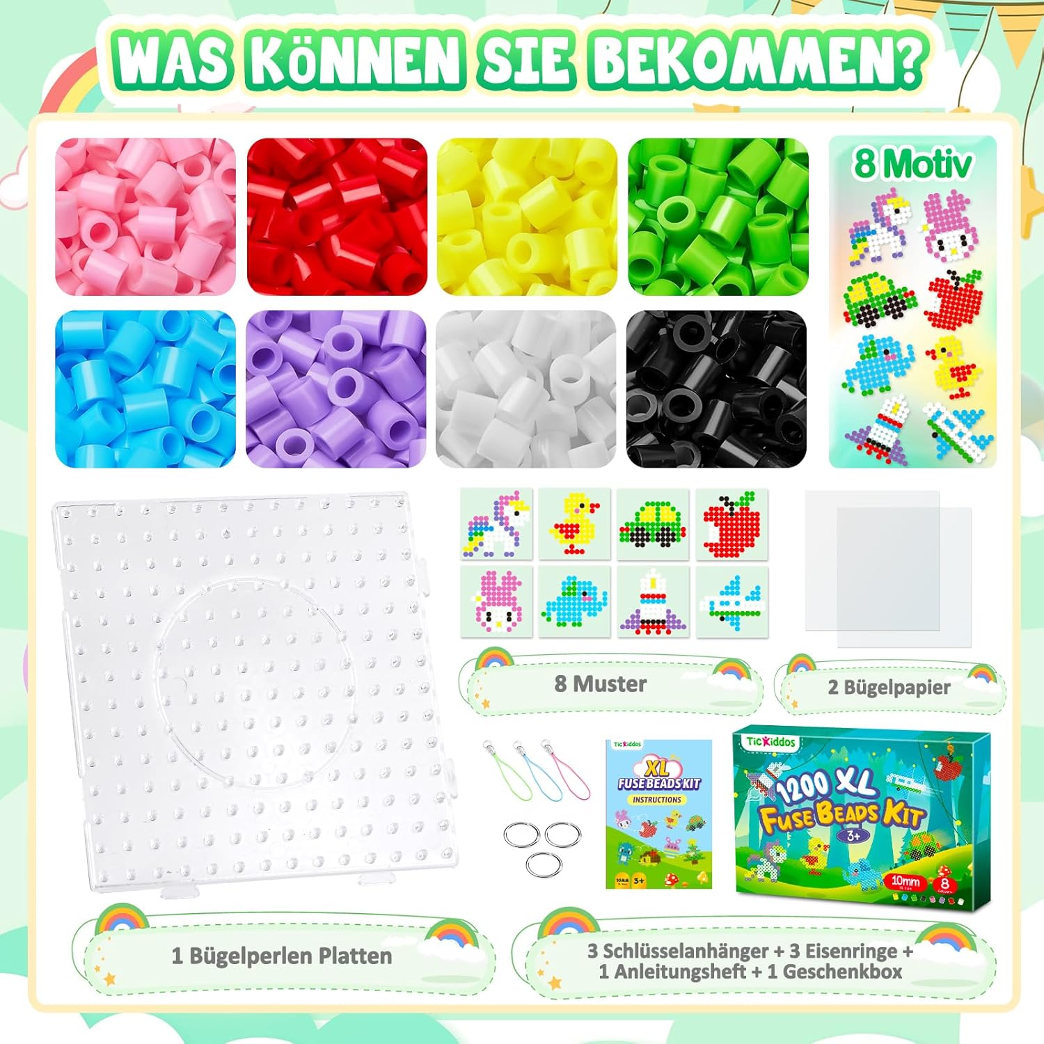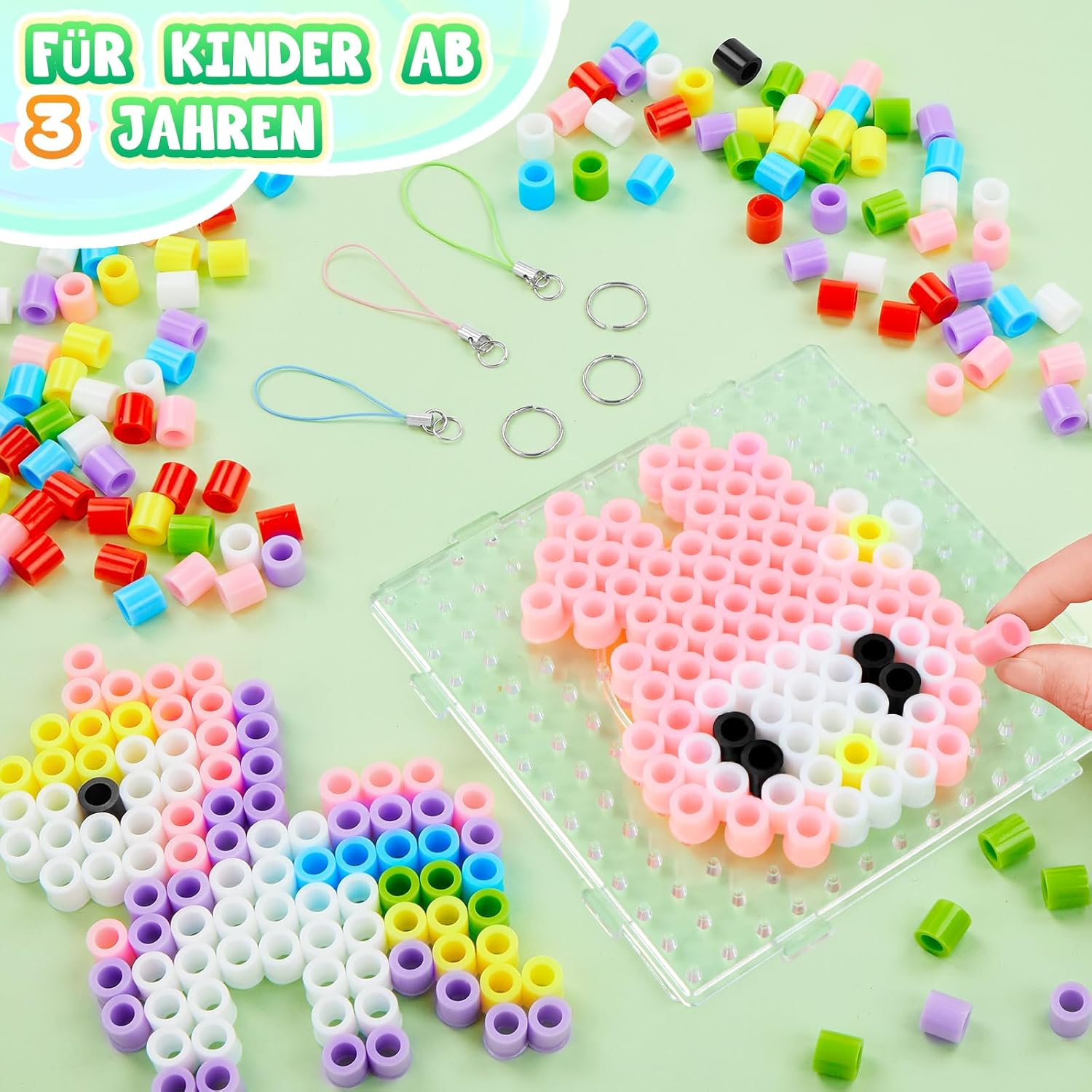 Set perline da stiro da 10 mm: riceverai 1.200 perline da stiro di alta qualità con un diametro di 10 mm in 8 colori pastello: rosa, viola, rosso, blu, verde, giallo, bianco e nero, 8 disegni (modello 1:1 nella dimensione originale), 1 piastra per perline da stiro, 2 fogli di carta da stiro, 3 cordoncini, 3 anelli di metallo, 1 libretto di istruzioni e 1 confezione regalo. Questo set di perline da stiro contiene altre quantità e colori tra cui scegliere. Sicure per i bambini dai 3 anni in su: le nostre maxi perle da stiro sono facili da impugnare, anche per le mani dei più piccoli. Realizzato in polietilene (PE) sicuro e di alta qualità, completamente riciclabile, senza spigoli vivi, appositamente progettato per bambini dai 3 anni in su. Aiutano a migliorare la percezione del colore e la coordinazione occhio-mano, poiché entrambi gli emisferi del cervello vengono attivati contemporaneamente durante la lavorazione. Ciò promuove il pensiero creativo, l'attenzione e lo sviluppo di tuo figlio. Modelli e istruzioni: i bambini possono utilizzare i nostri modelli di modelli creati da soli, completi di istruzioni, o inventare le proprie creazioni. 8 graziosi design, tra cui aeroplano, automobile, razzo, unicorno, anatra, coniglio ed elefante, adatti sia a ragazzi che a ragazze. Questo set di perline è un giocattolo perfetto per ragazzi, ragazze, bambini, nipoti, studenti e un regalo ideale per compleanni, Natale, Pasqua. KIT FAI DA TE TUTTO COMPRESO: questo kit di perline fai da te da 1.200 pezzi contiene tutto il necessario per realizzare progetti creativi: perline da stiro colorate, cordoncini, penne, carta da stiro, anelli da stiro, il tutto in una deliziosa confezione regalo. Utilizzo versatile: che si tratti di un appuntamento di gioco, di una festa o di un'aula, questo kit di perline da stiro è ideale per le attività di gruppo. Fornisce un'esperienza collaborativa e interattiva per ambienti sociali ed educativi. Idea regalo per i bambini che amano creare, a partire dai 3 anni. Adatto per compleanni, Halloween, Natale, feste, attività indoor/outdoor.
